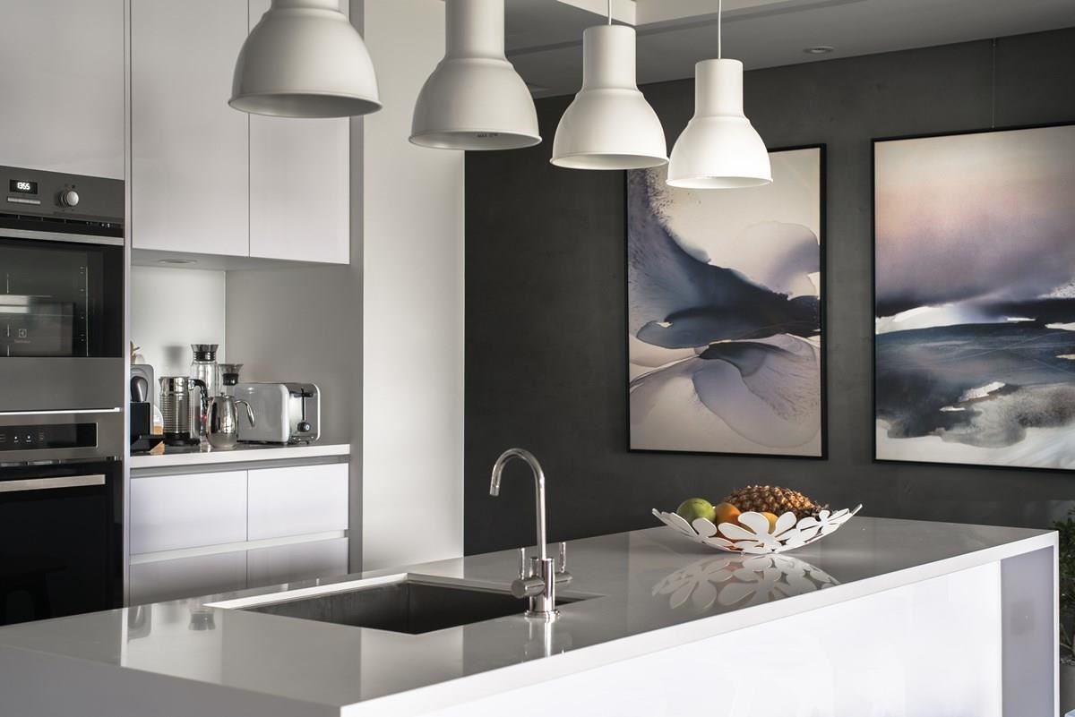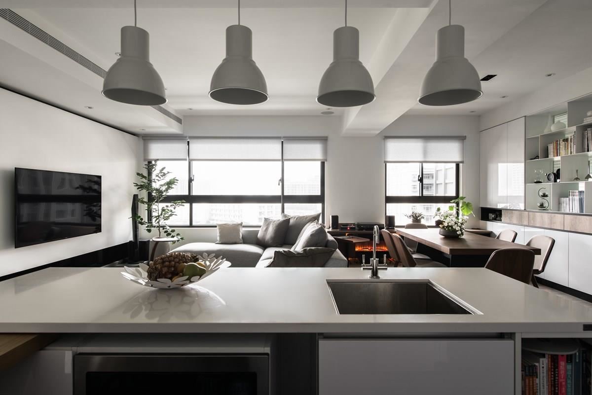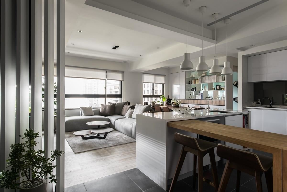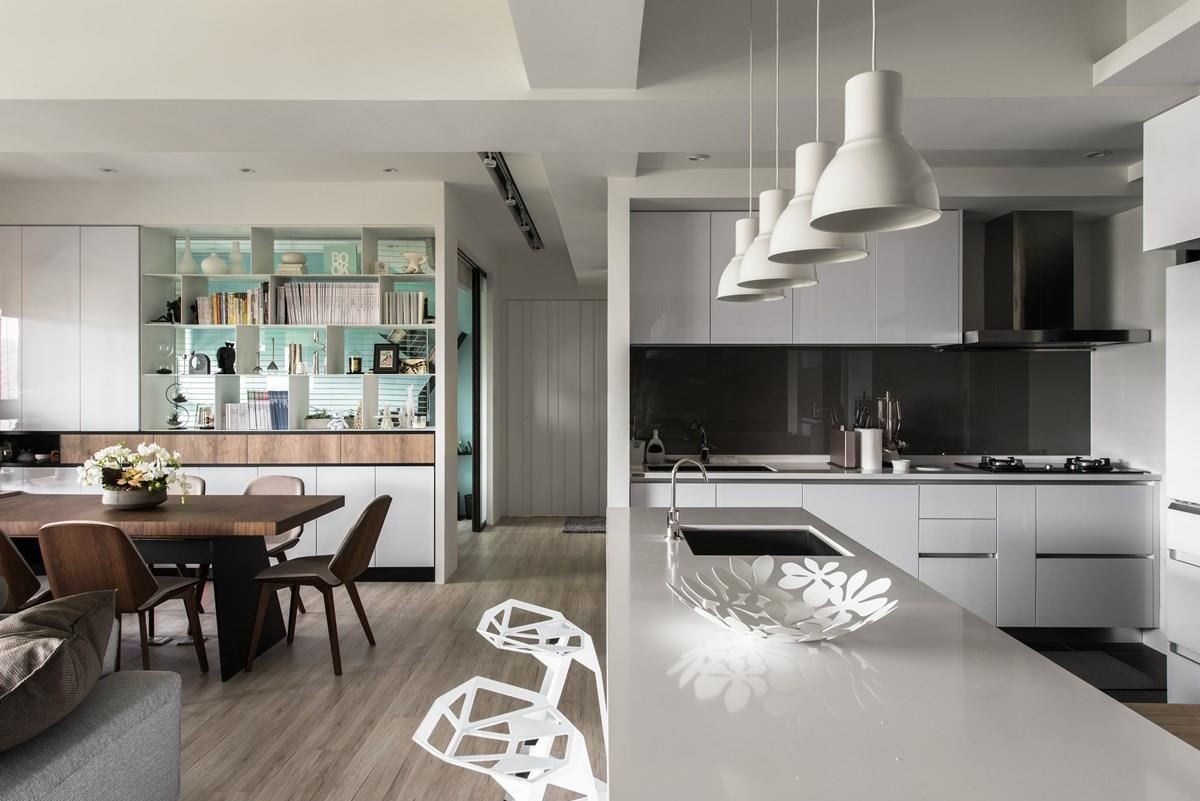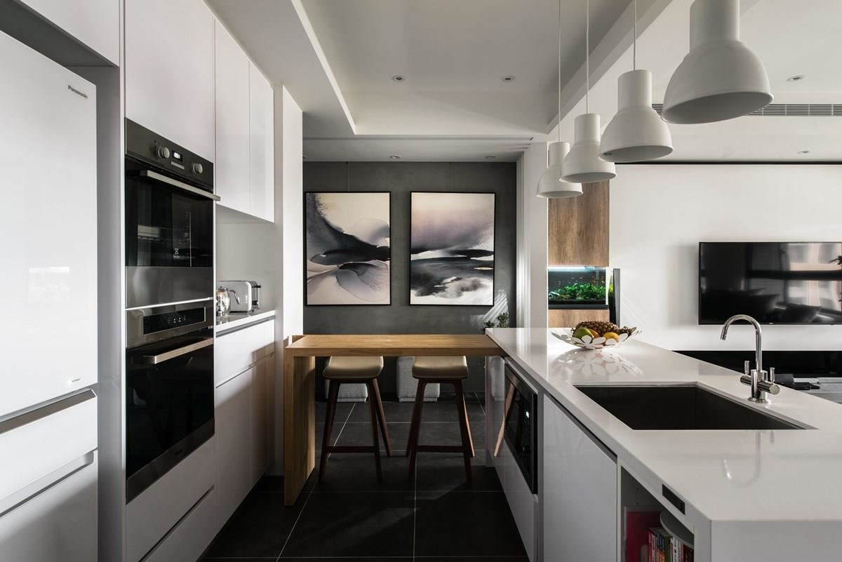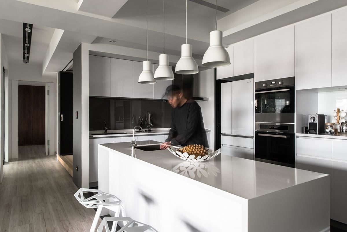 对于爱烹调的屋主来说,厨房空间是设计的核心重点,也是家人情感增温的场域。玄关入口的右侧为白色调的赛丽石中岛,成为厨艺展演的舞台,利用木纹餐桌形塑 L 型动线,营造出开放且流畅的日常动线,木作桌子还可以完全收纳至中岛下方,空间变化更灵活;简约、白色调的垂挂式灯饰与线条感的造型高角椅,替空间带来画龙点睛之效。