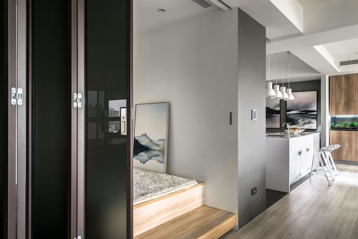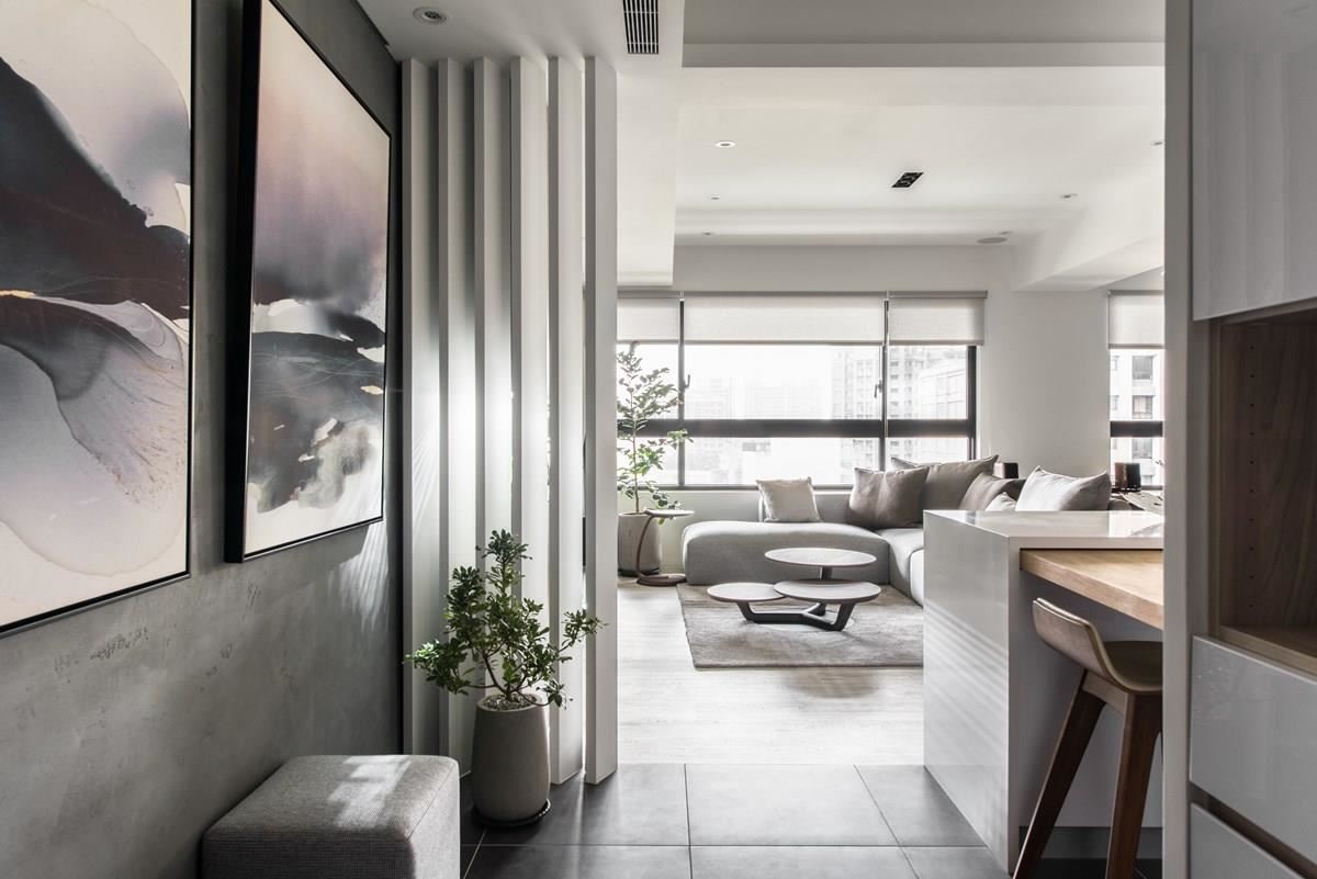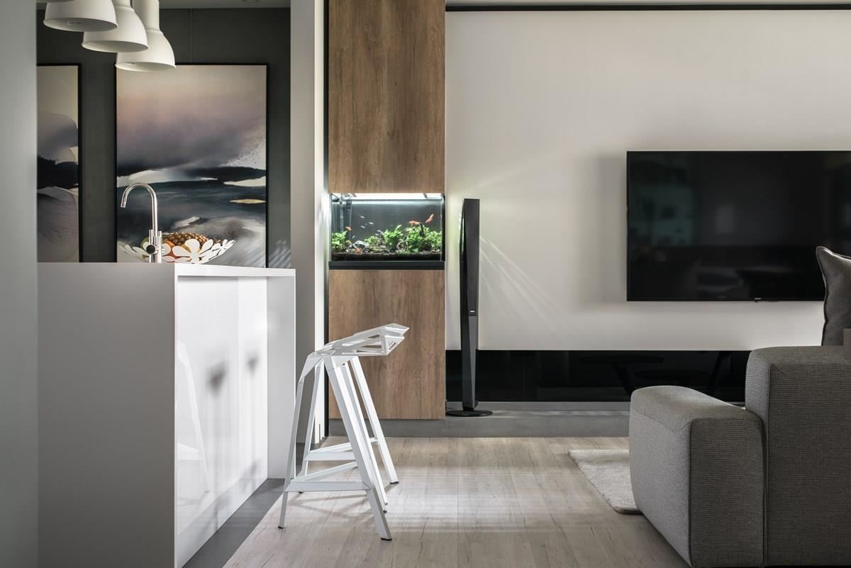 入口玄关,让铁件格栅划分内外界线,让落地窗引入的光线随着缝隙筛落,伴随绿意植栽、晕染的水彩画作,随着日夜光影的更迭,轻吐多变的光影神采;隔断另一侧以木质柜结合鱼缸,引入活跃的自然生命力。