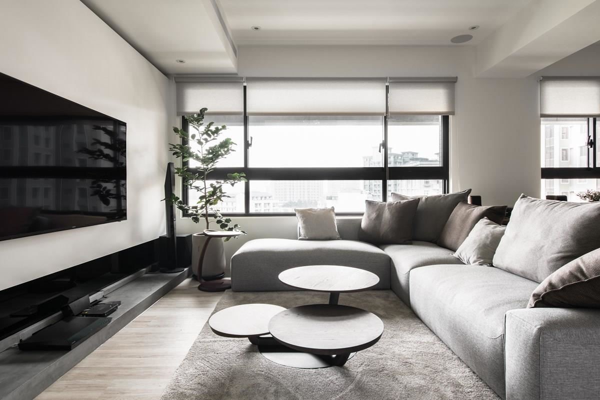 客厅里,以大量的纯净白铺陈,超耐磨木地板以及清水模浅色木质的安排下,营造出清爽宜人的空间气息;电视墙以沟缝线条勾勒出渐层立面,灰色调的地毯、沙发与简约配色的抱枕,调和出静谧的人文质感。