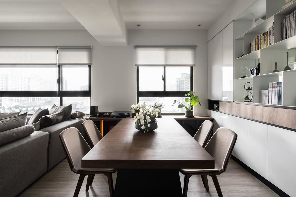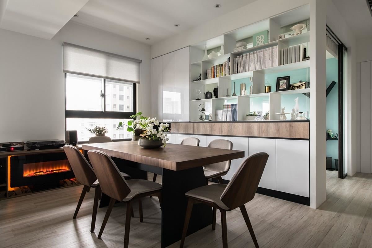 沙发后方为餐厅区,原木质感的餐桌椅加上壁面嵌入暖炉,替用餐空间增添温暖质感;后方柜体以透明玻璃展示方式,透出书房里挥洒的蓝绿色调,洋溢着轻快愉悦的神采。