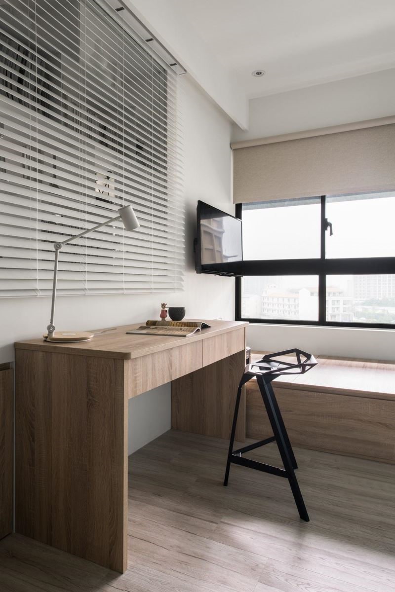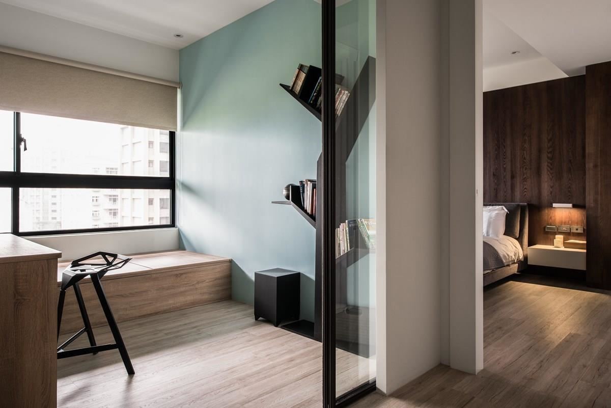 以铁件结合玻璃的拉门界定书房与公领域,书房里让浅色木质地板、木作书桌与卧榻,调和出温润气息;壁面挥洒蓝绿色调,铁件材质勾勒出树枝状的书柜,流露出人文设计之美;一旁的客用居室,则是以折门为界,架高木地板的方式拉出层次高度。