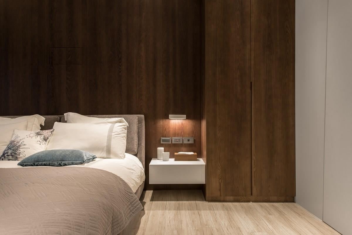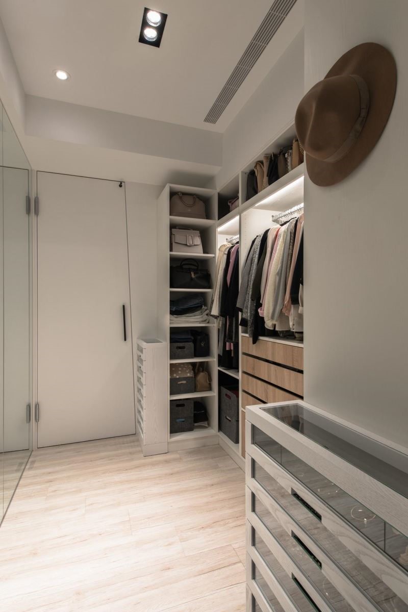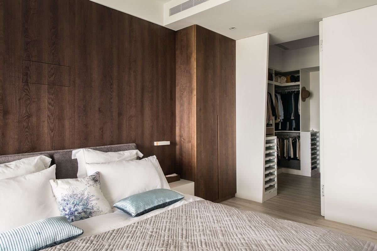 居室里,床头背板以钢刷栓木做染色处理,床头一盏简约线调的灯饰,烘托风格旅店的质感。推开一旁白色拉门,内部隐藏一处更衣室,白色调铺设的空间里,大量的收纳与精品柜陈列,简约之中满足生活的实用需求。