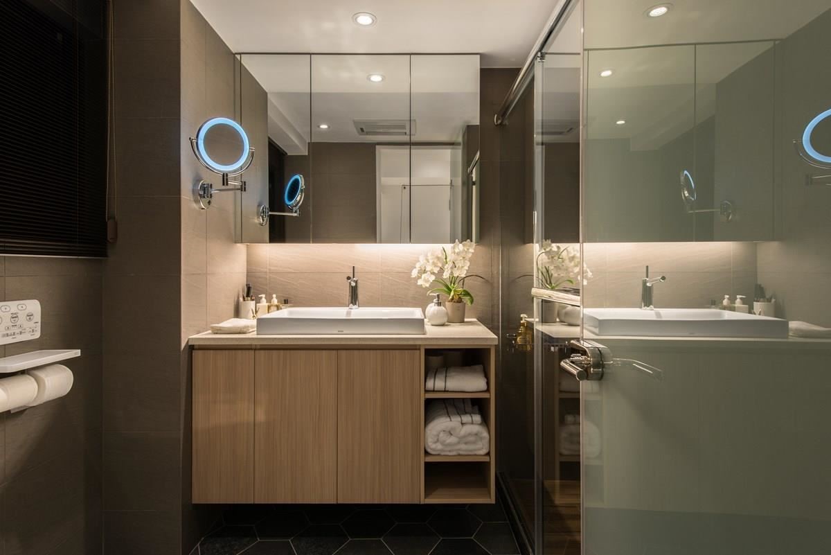 在卫生间,则利用六角磁砖及木纹砖来划分主浴的干湿领域,内敛色系结合朴实的质感,牵引出精品酒店的品味。