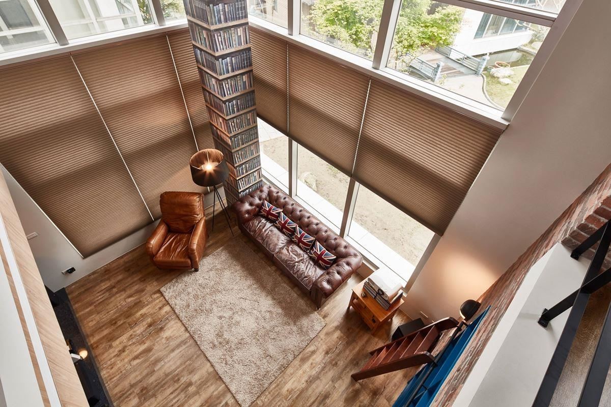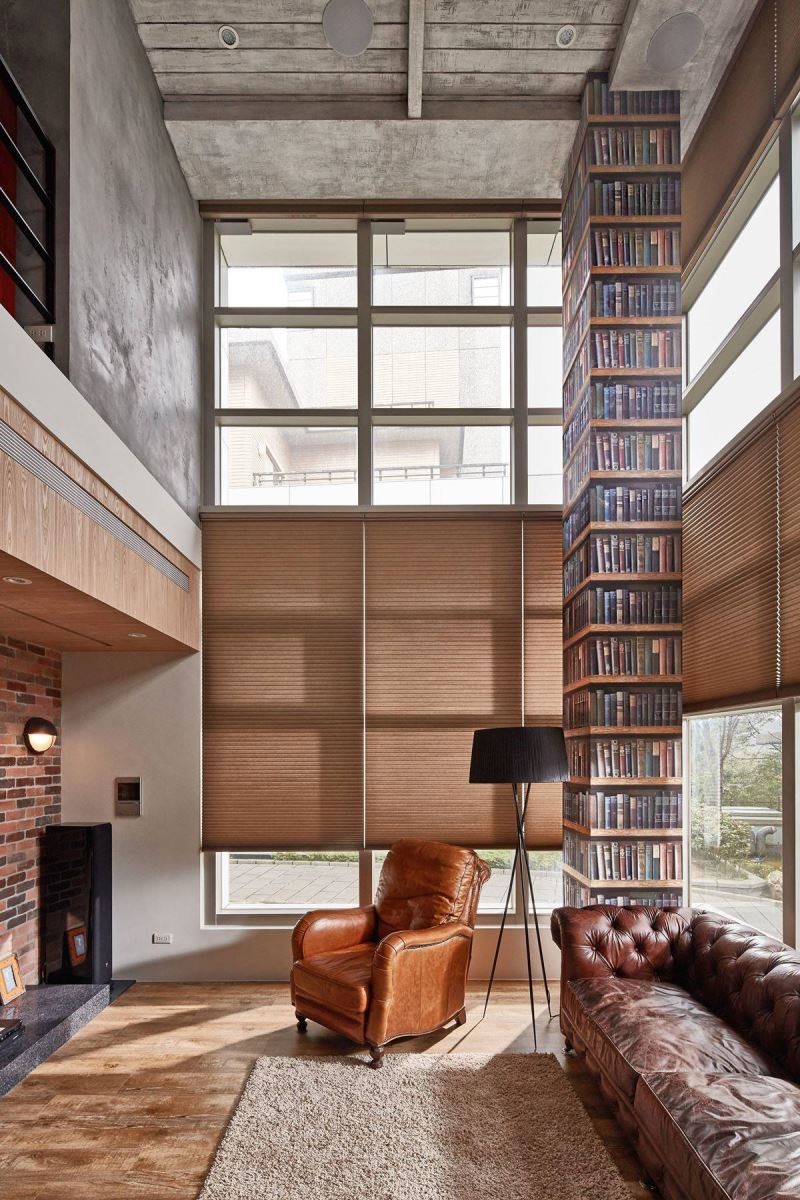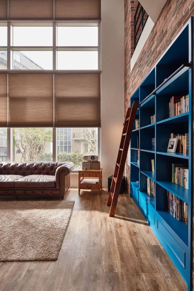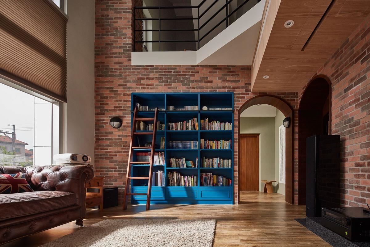 挑高的客厅里,电视墙利用三色文化石打造而成,墙体上方以木纹界定出天花高度,自然且粗犷的材质特性,共同交织出一片温润情怀;两侧窗户的结构柱贴附书柜造型的风格墙纸,伴随室内的皮格沙发陈列,调和出复古的怀旧气息;另一侧墙壁嵌入跳色书柜,蓝色的妆点成功创造新颖视觉,搭配滑梯设计,替空间增添故事张力。