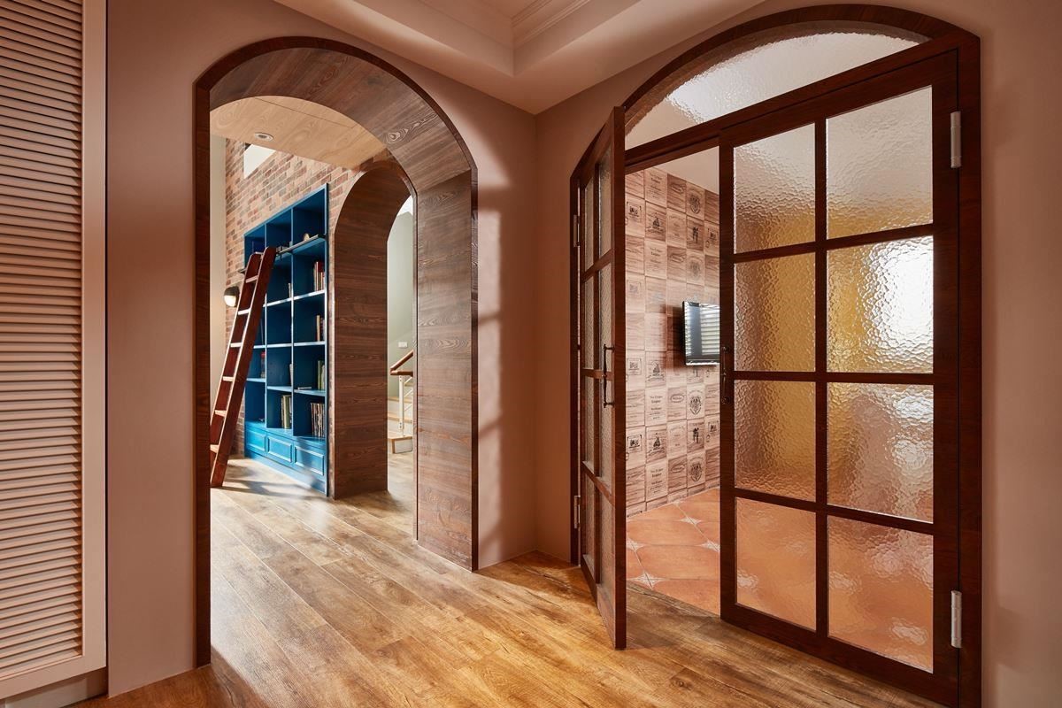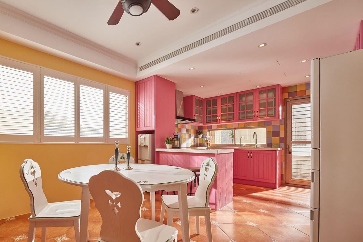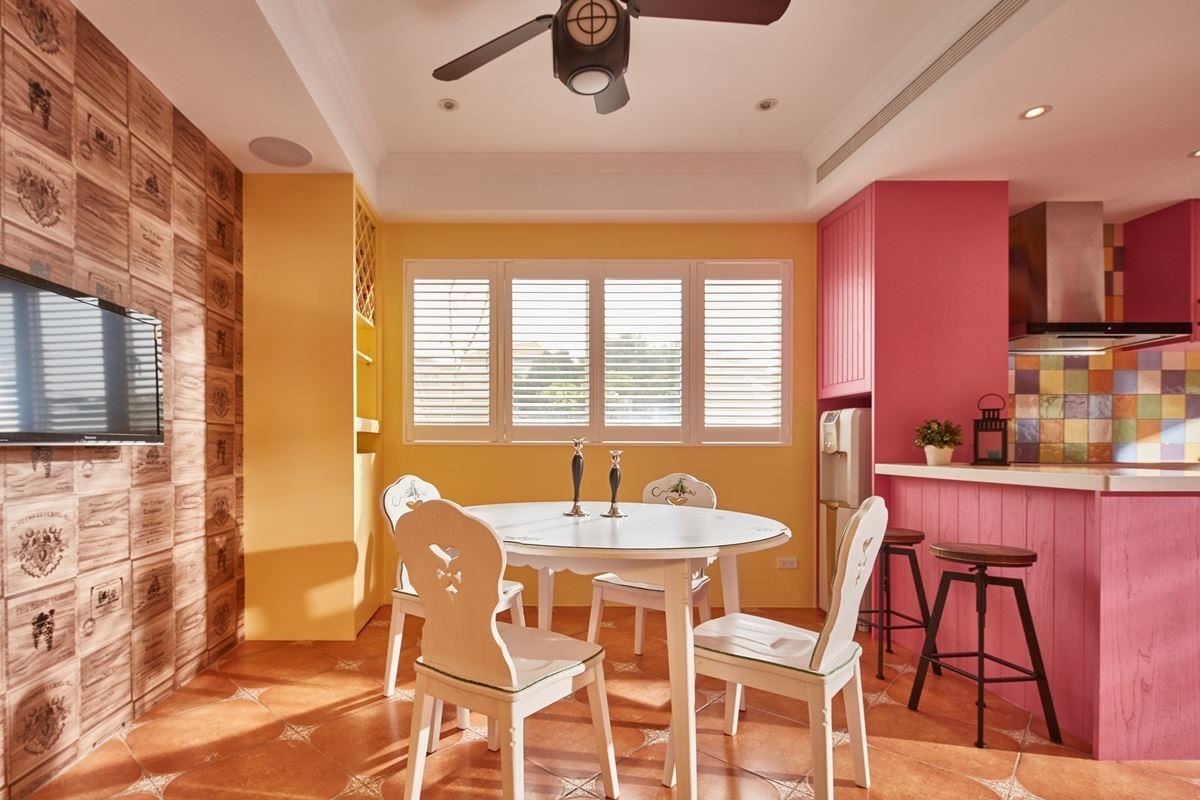室内的场域划分,融入欧式门拱元素,有别于工业风的客厅,推开木作格门,来到充满浓浓乡村风的餐厨空间里。活用粉红与亮黄色系的特质,尽情挥洒在烹调与用餐环境,酒箱图案的墙纸铺设出主体墙风情,串连一旁的红酒架装置;粉红色调则成为中岛与厨房空间的情境,墙壁贴附缤纷的马赛克砖,洋溢着动人活泼气息。