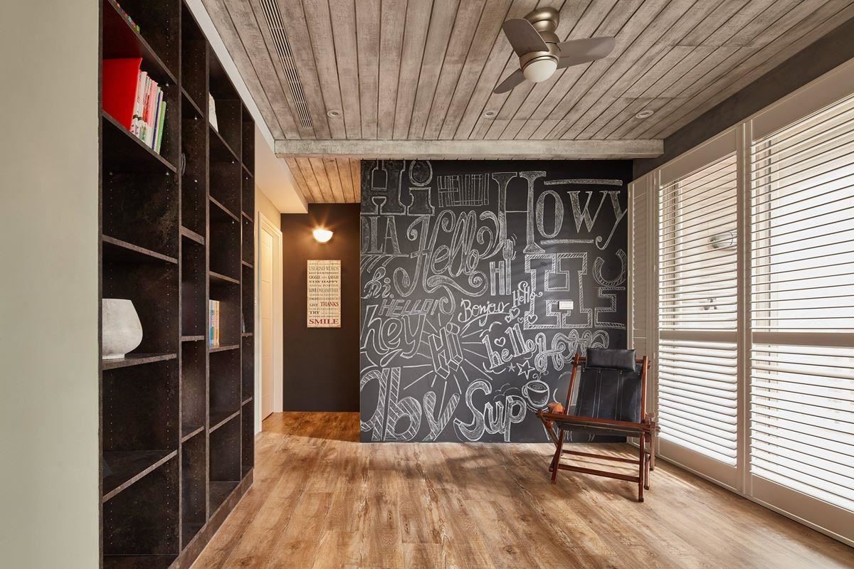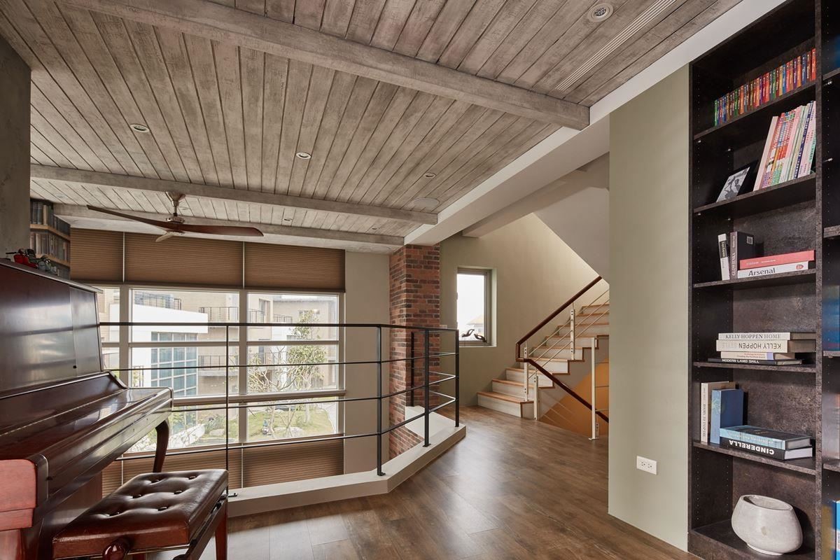 延续复古工业风情怀,二楼起居间以木纹铺设地板,天花板则使用特殊漆料,诠释仿旧质感,空间里还陈列钢琴与嵌入书柜,另一侧墙面更特别安排磁性黑板,成为屋主一家人的情感留言与涂鸦创作园地。