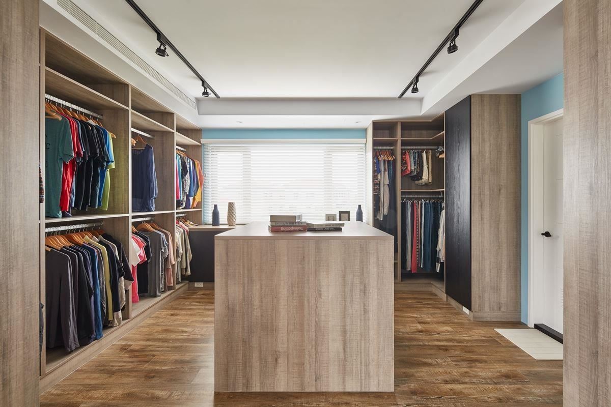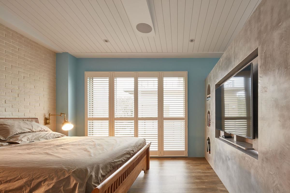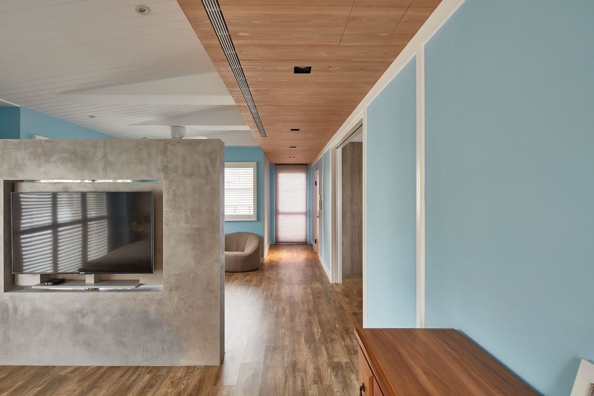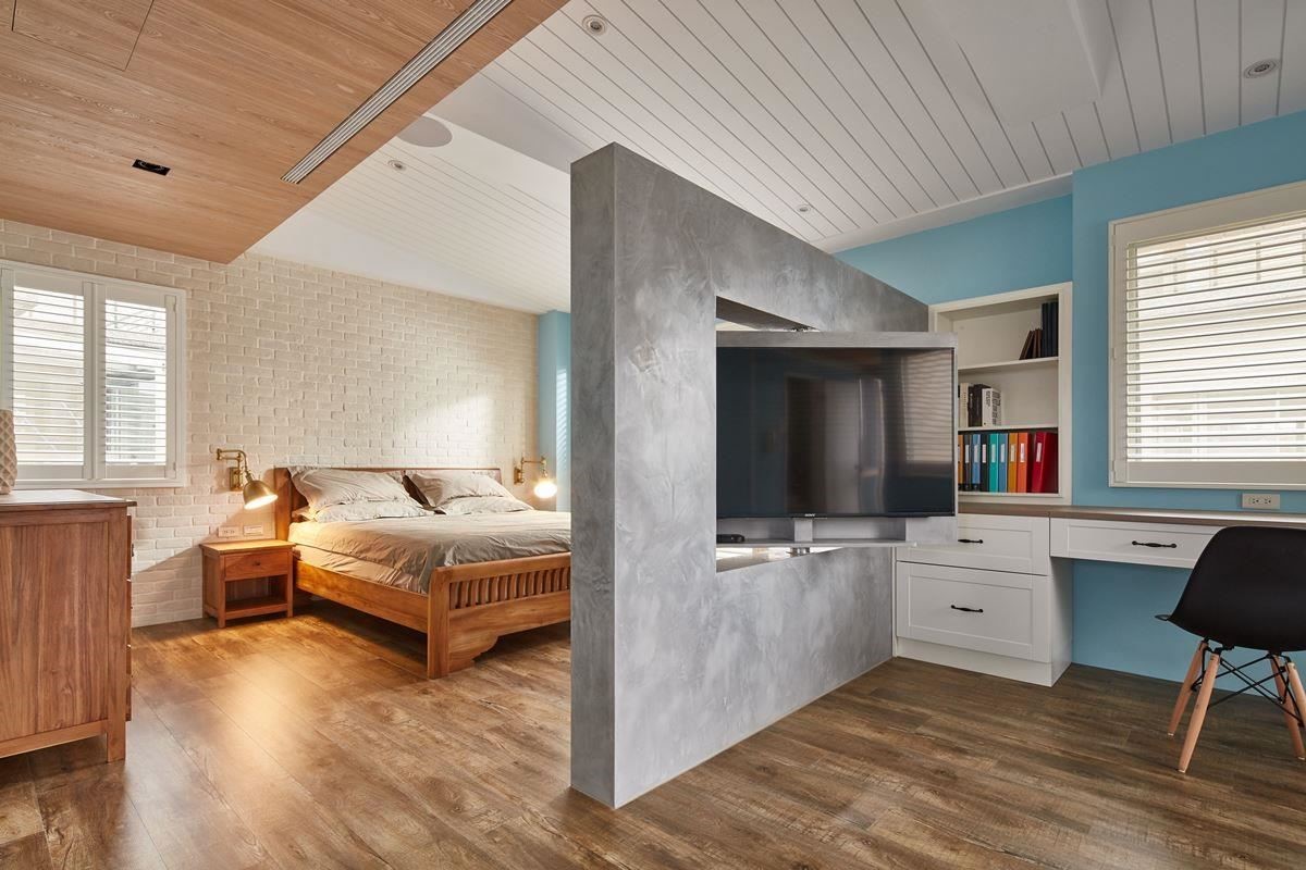 居室里,天花板以木作铺设出斜屋顶概念,另一侧则以自然原木质感为安排,而壁面以蓝、灰色的设定,形塑北欧乡村风味道。而清水模质感的半高电视墙,划分出睡眠与书房区,可旋转的电视墙设计,可依屋主在领域上的需求而旋转使用。