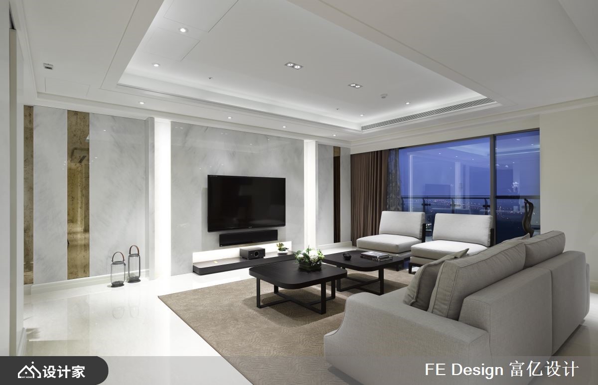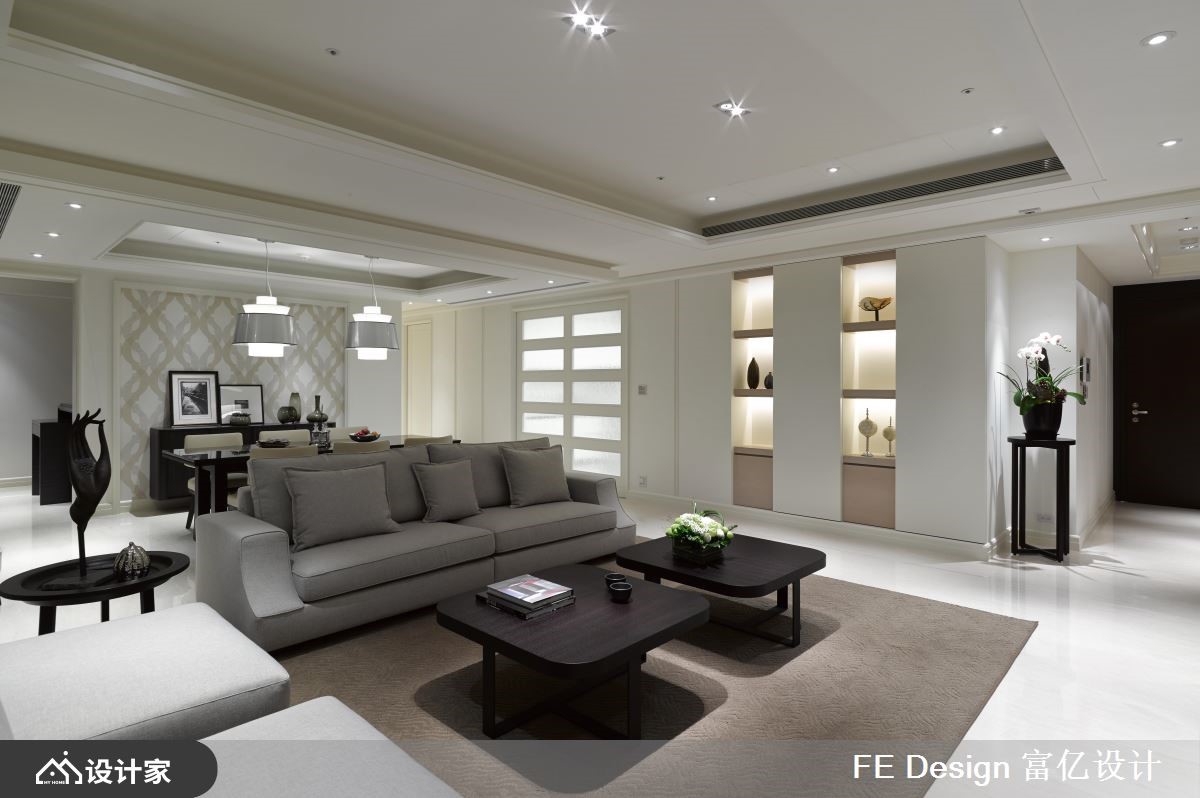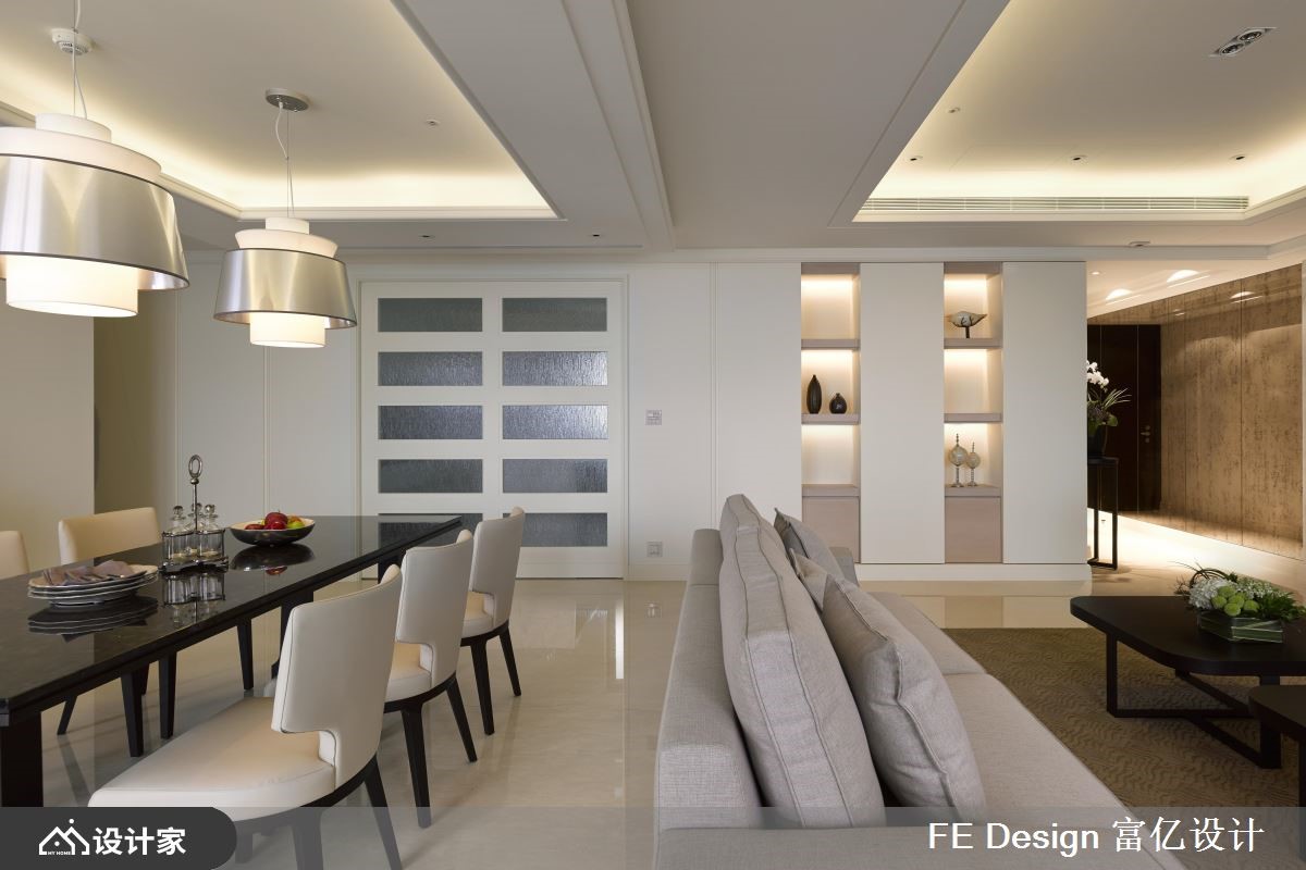 豪宅不一定要堆砌奢华建材,有时候掌握好优雅的风格塑造,线条简洁反而更能凸显气度。这间310平米的法式古典大宅位于高楼层,拥揽河岸美景,而设计师减少人为的繁复装饰,将窗外景致引入室内,给业主纯净又柔美的生活环境。【留下重点装饰,创造开阔气度】玄关狭长廊道的墙面以大面积的仿古镜妆点,揭开法式古典的淡雅韵味,又达到扩容的视觉效果。客餐厅采用开放式设计,不做过多的隔断和装饰,仅在重点墙面透过典雅墙纸、清透大理石、艺术品展示柜,创造出开阔又不失细节的家居形象。而电视墙和天花板的间接光源,则柔和了视觉且增添立体度,不铺张地提升室内气势。厨房藉由一道水纹玻璃推拉门,阻隔油烟飘散,打开时又能够串联客餐厅及佛堂,让景观能够走进公领域的各个角落,休息、用餐、烹调都舒适惬意。主卧整齐排列几何床头造型,搭配对称的壁灯与床头柜,营造沉静的寝卧气质。次卧则于外凸的窗边配置书桌,使人能够映着日光阅读,眼睛累了还可以恣意徜徉于河景,感受美好的午后时光。小编的最爱主卧卫浴位在建筑的弧形区域,所以设计师顺着弧度设置浴池,让人在辛苦地忙碌一天后,能够边泡澡边享受河景环绕,自然地开放胸襟。