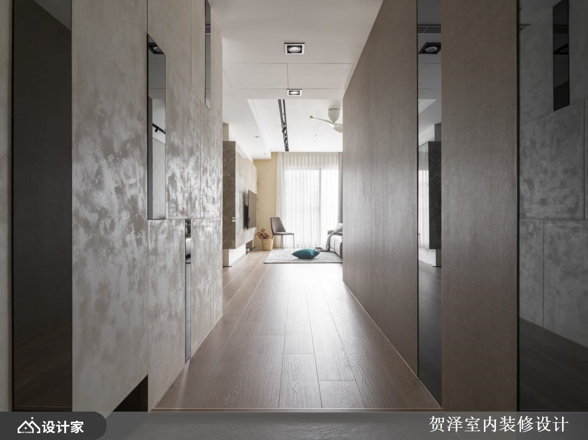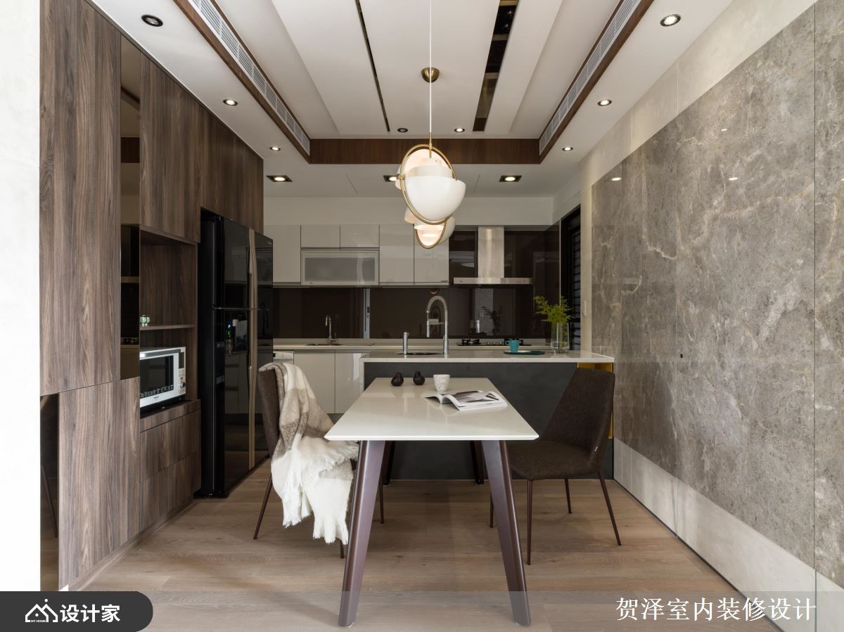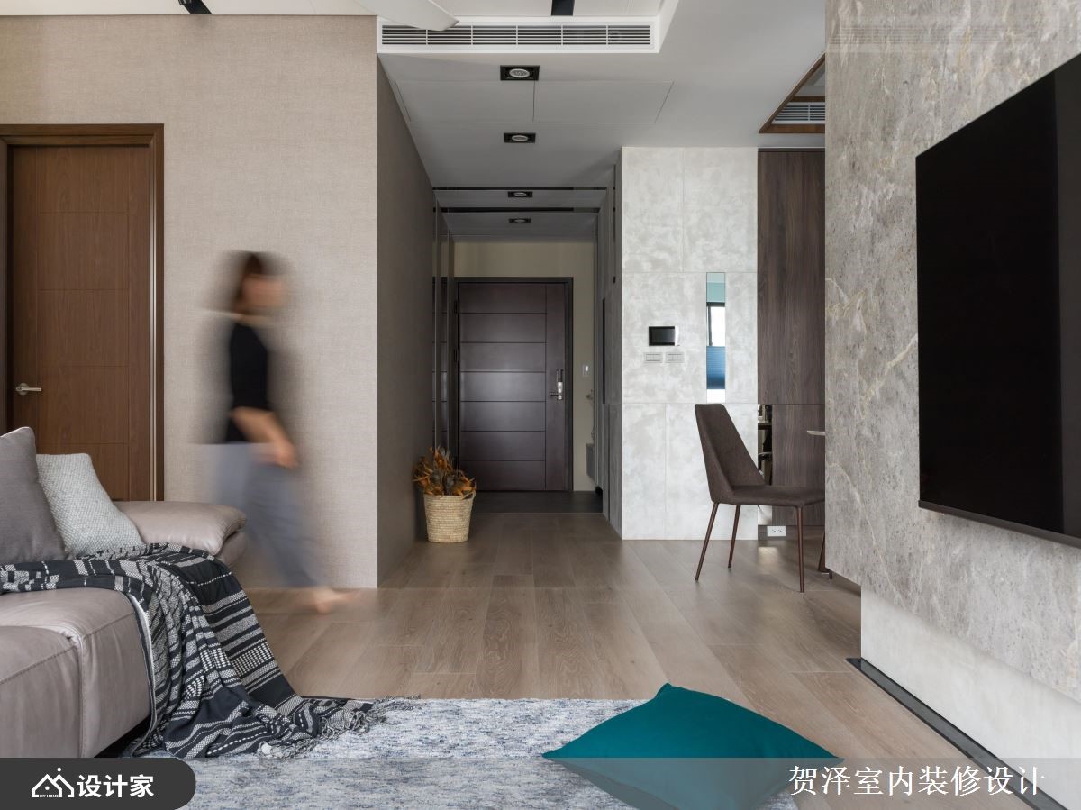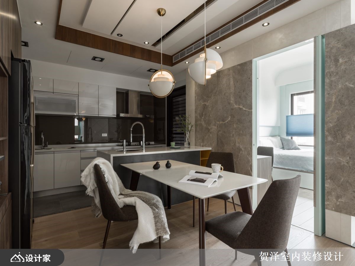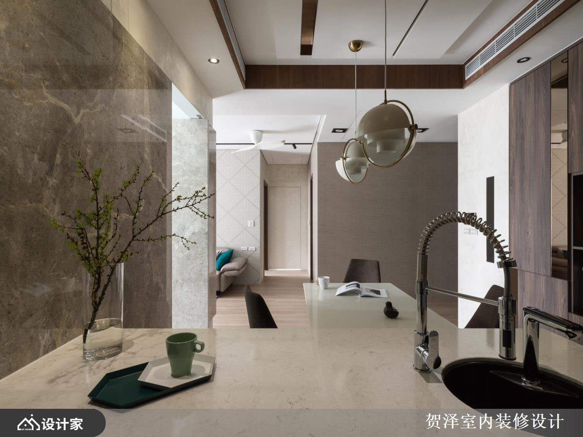119平米混搭宅的男主人,长期在外地工作,希望能有个跟家人短暂休憩的放松空间,因此设计师依照需求,藉由异建材堆砌出沉稳中性的主调,打造宛若高级酒店的优雅居所。【大理石延伸,串联客餐厨空间】原本玄关有根大柱子,设计师透过木作造型墙与鞋柜的结合作修饰,让整个动线自然不造作,而错落其间的镜面则降低走道的狭隘感,给人愉悦又活泼的氛围。客厅电视墙的大理石建材延伸至餐厨区域,串联起原先封闭的厨房,使公领域显得宽阔明亮,同时还利用墙面线条的分割,悄悄隐藏小孩房的房门。厨房和餐厅选择中岛吧台,划分格局界线,而吧台侧边艳阳黄的收纳格,则在灰阶的空间主视觉中形成跳色,同时增加机能性。主卧孔雀绿的床头,透过绷布的纵横线条,淡化厕所门扉的突兀感;床尾则选择大面积的木纹推拉门,隐藏后方的电视与化妆台,一方面保持了立面的整齐,另一方面也赋予视觉的惊喜。小编的最爱儿童房在床架下方藏有放置杂物的抽屉,加上简约书桌与衣柜的结合,让人可以沉浸于充足的自然光中,享受舒服又机能十足的休息环境。