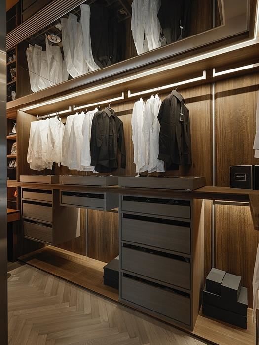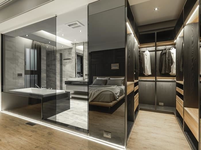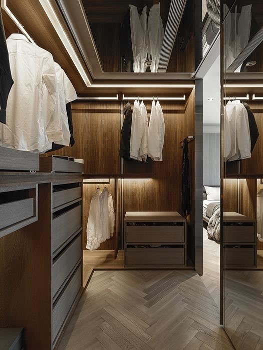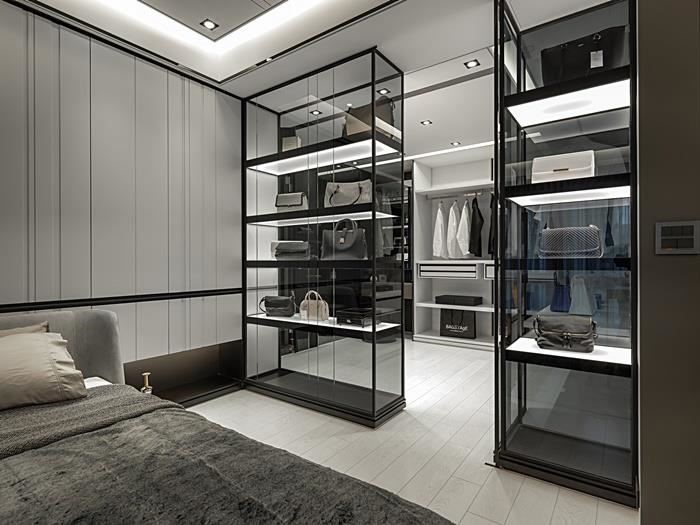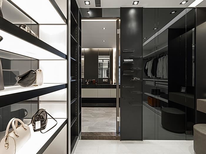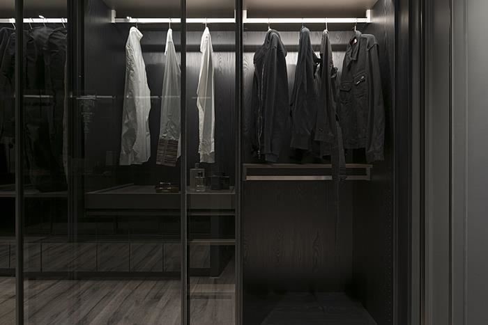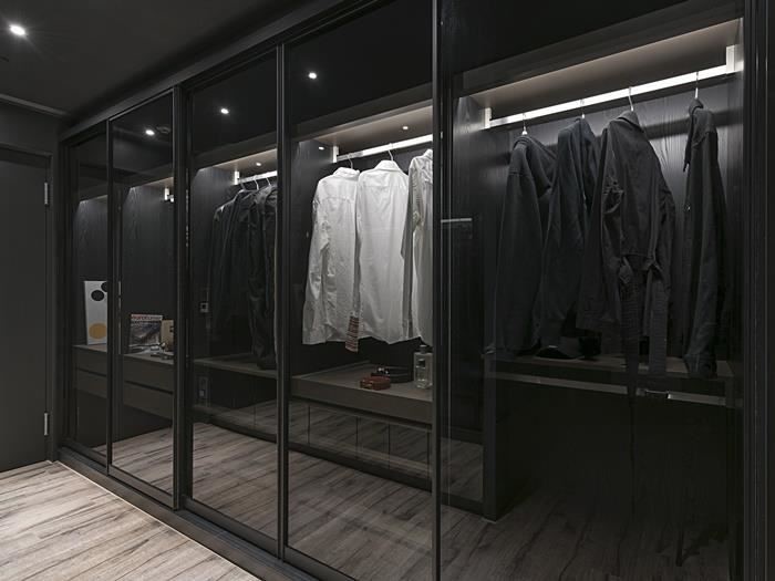 衣柜造型需与整体室内相融,像是可选择玻璃材质作为更衣室门片,让视觉显得清爽不压迫,而好的灯光搭配更可营造空间层次感,但需避免过强的灯光直接照射衣物,减少皮件或塑料的变质;此外,使用自然灯光或白光,则可确保更衣、上妆时的色彩准确度。