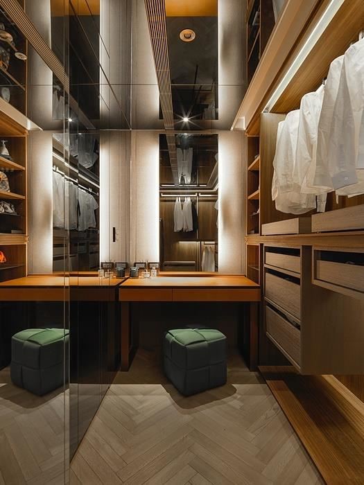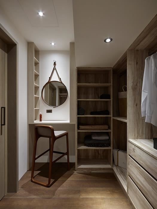 更衣室通常不宜离卫浴空间过远,可做为卫生间与卧房的过度衔接,让两者婉转串连,方便沐浴后更衣。梳妆台的位置则建议与衣物收纳一并整合,让畸零空间发挥功用,透过场域之间的整合,形构出关于美的使用动线。