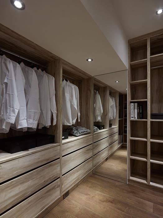 镜子在更衣室中扮演不可或缺的角色,无论是安排在墙面、门扇或天花板,都是不错的选择。除了可作为穿衣镜使用,更能点亮空间,尤其镜子更考延伸拥挤的空间感,达成放大延伸效果。