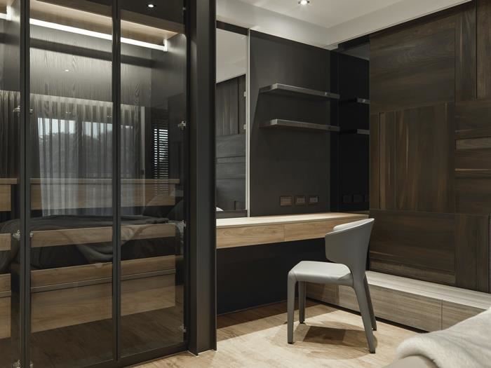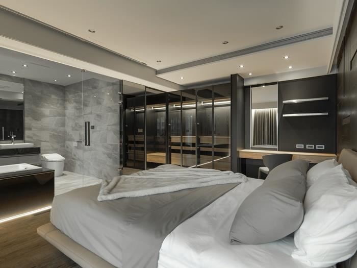 除了基础收纳之外,更适度的带入展示概念,诠释出个人的穿衣好品味,像是以玻璃展示柜设计作为睡眠区与更衣间的透明疆界,藉由穿透的视线,营造更宽广的空间视觉感受,也让包包、衣物等清晰可见,呈现出如精品般的品味质感。床头后方也特意打造了一小方平台,可用来放置饰品,相当方便。