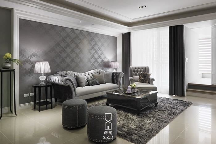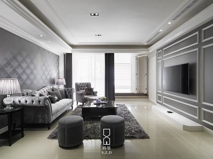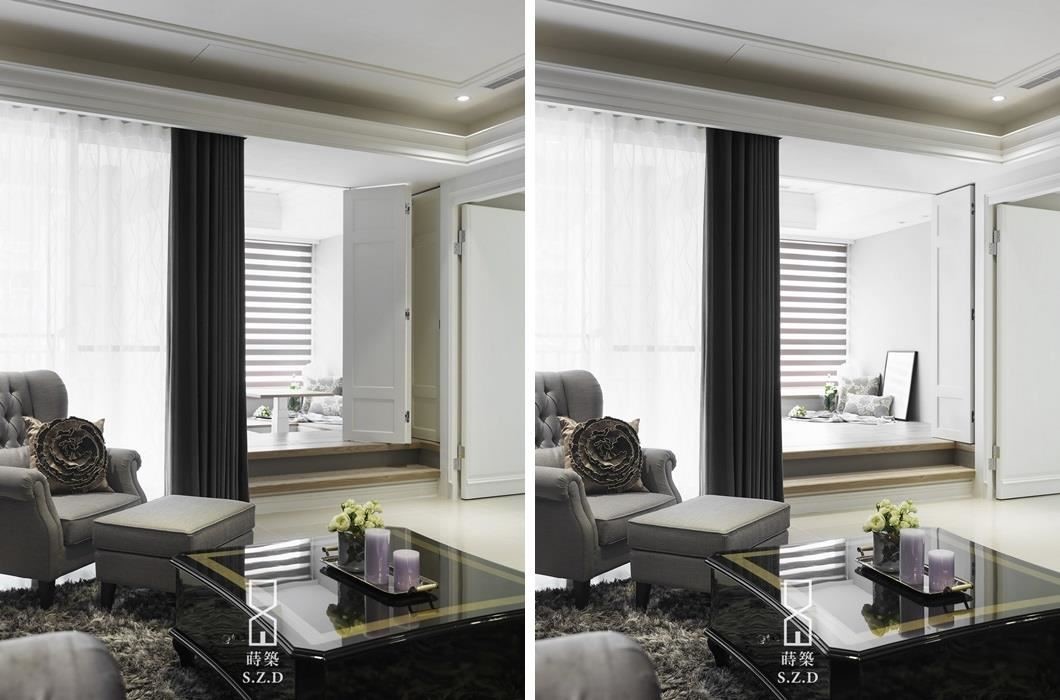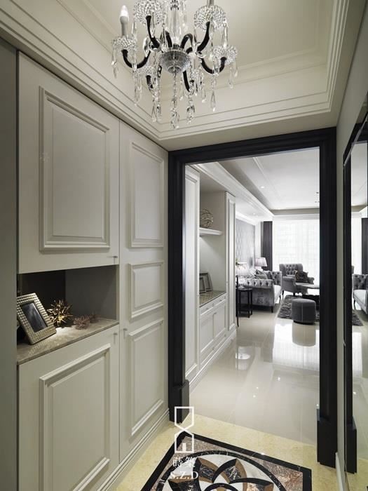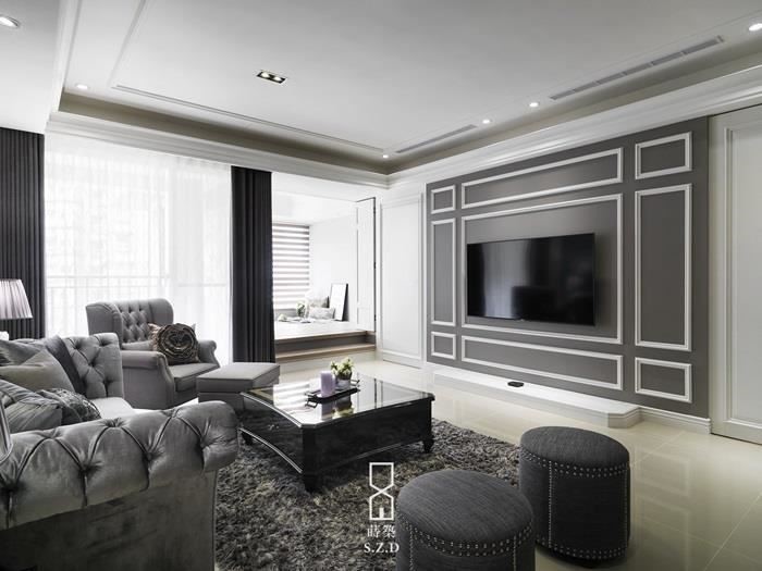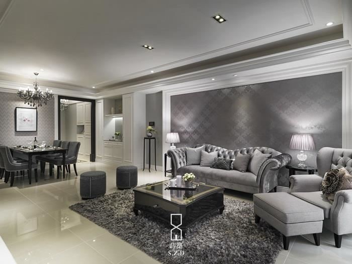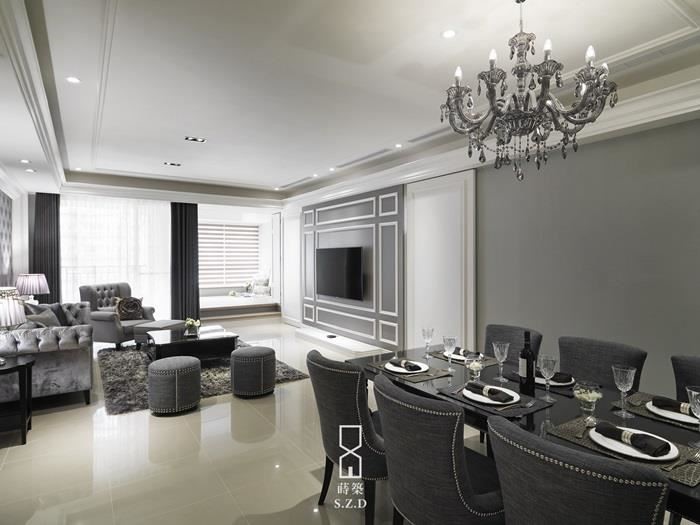 玄关处以拼花大理石铺陈地板,藉由线板堆栈出天花板层次与鞋柜造型,天花板垂挂华丽的水晶吊灯,并藉由深色的门拱设计框出内外领域。公领域以开放格局展现,灰色调的运用处处展现,与白色系的天花板与壁面烘托出渐层的视觉美感,像是电视墙以强烈的对比色彩呈现,两侧的线板更诠释出对称与平衡之美;沙发背墙贴上华丽的亮面墙纸,伴随嵌灯照明的映照下,散发艺术美学般的光晕。