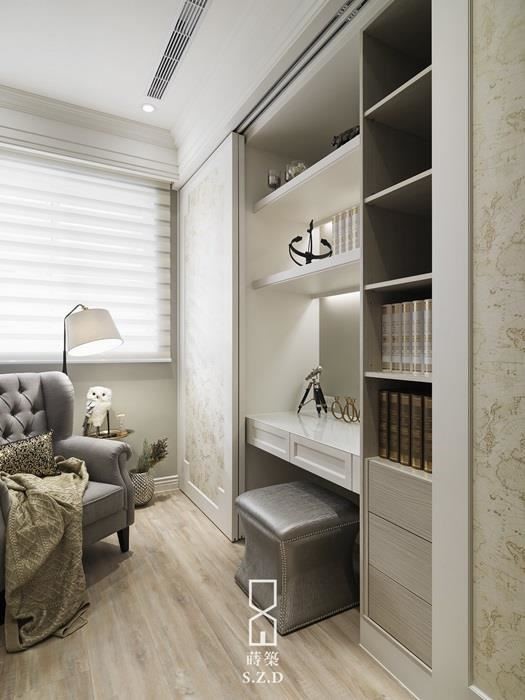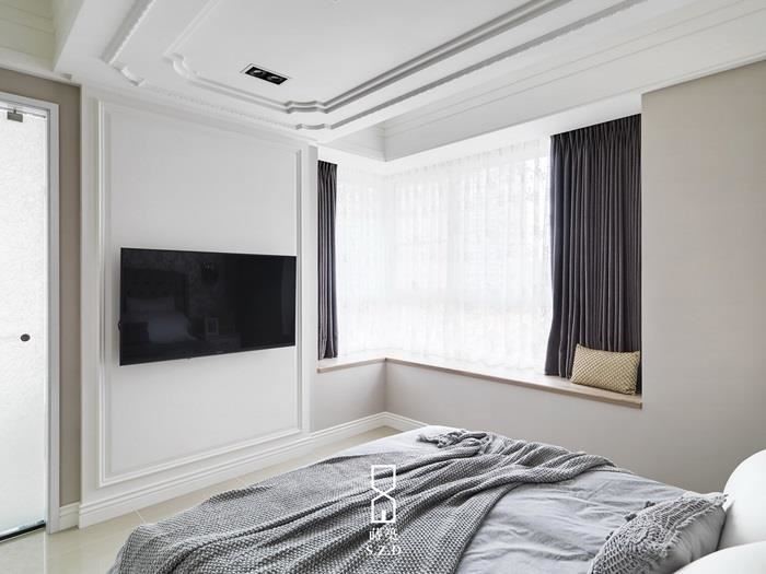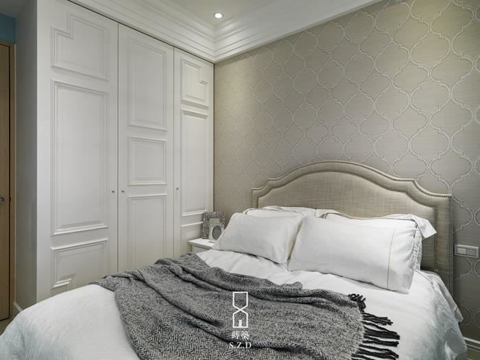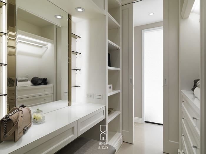 书房也可以兼具多功能室,预留未来做为小孩房,层板结合书柜设计,强化收纳机能。主卧室以藕色衬底,奢华古典的床头板造型,调和出柔美的视觉意象,而延续天花以线板勾勒的视觉,向下延伸出电视墙造型;主卧还特别打造更衣室,全白的空间诠释,结合层板摆设化妆品,镜面两侧搭配温润的茶镜,展现细腻的贴心细节;次卧床头板以弧型线条层次堆栈,米色系的色彩安排下,营造出温润的休憩环境。