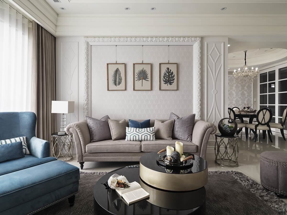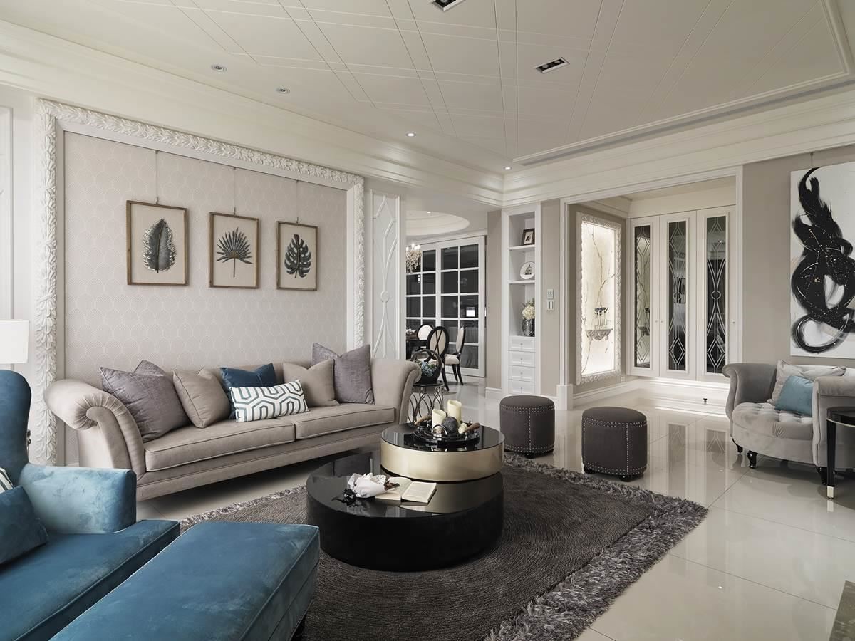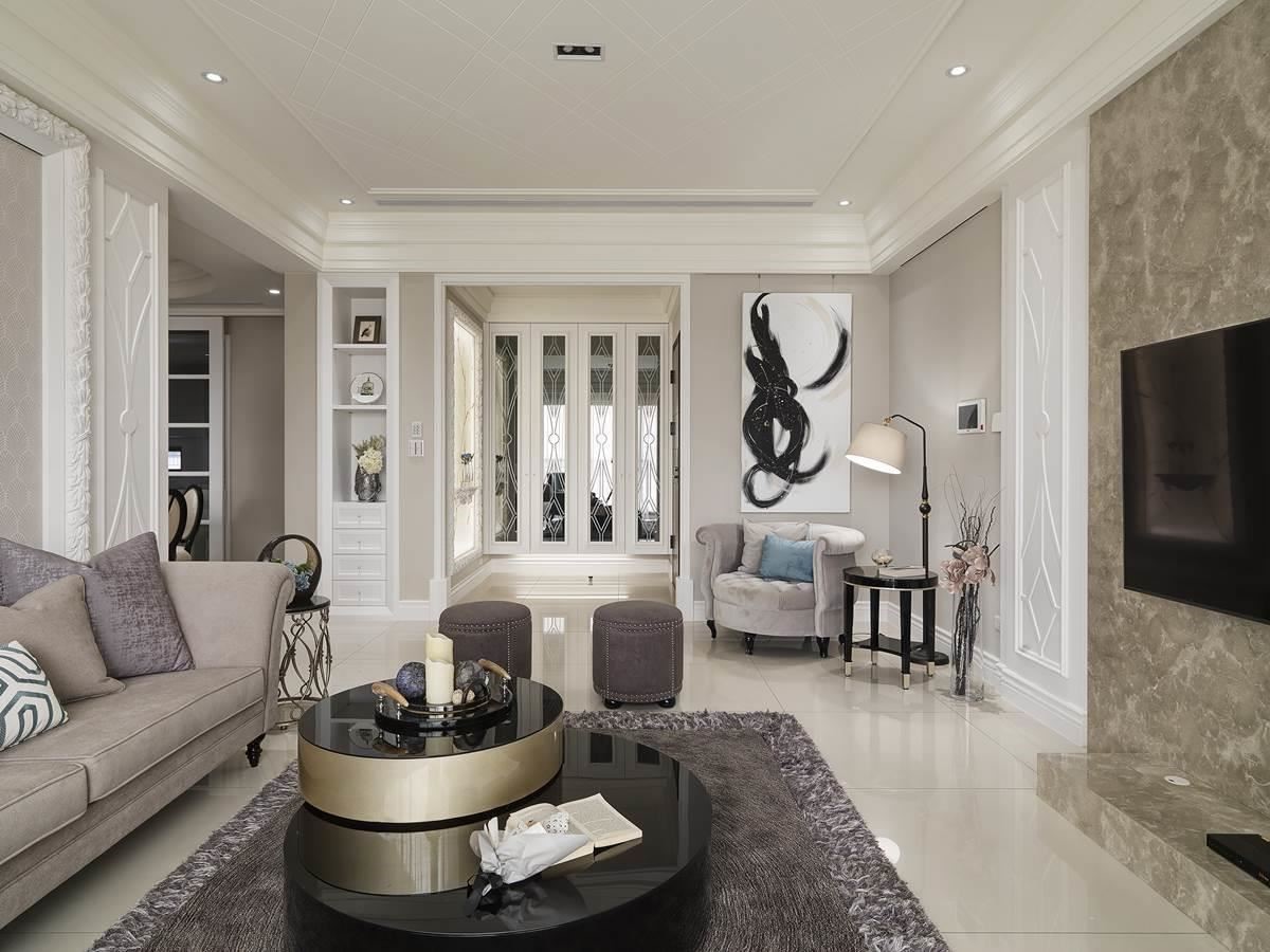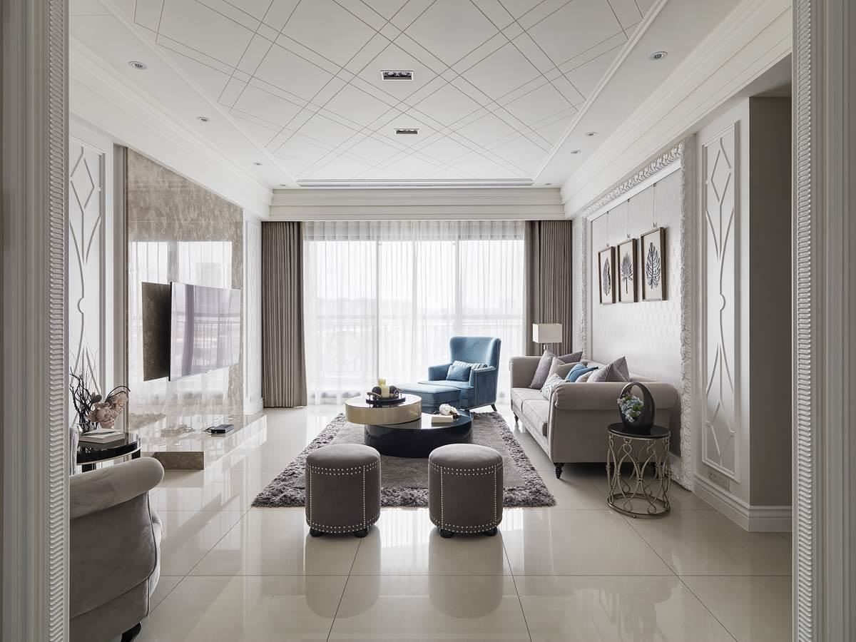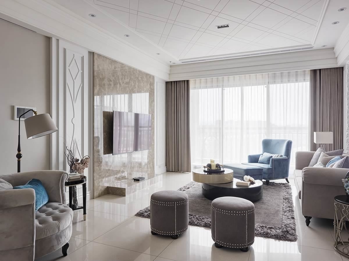 穿越线板描绘的门框,踏进公领域,感受明亮的采光视觉。电视墙以波斯灰大理石擘划轩昂气势,两侧搭佐白色衬底的对称造型,藉由植物线条勾勒出独特的迷人视觉。