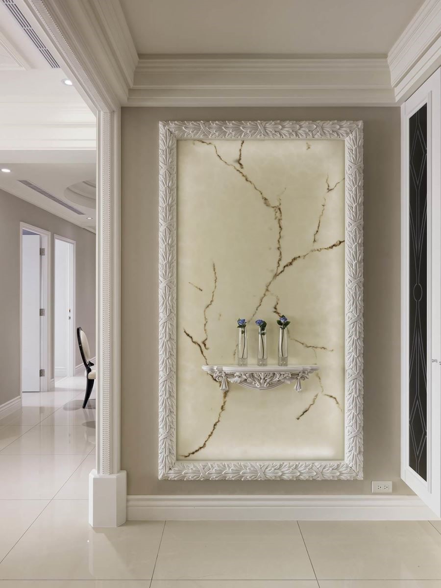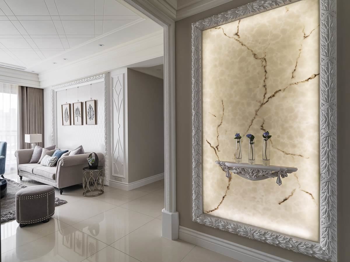 踏进玄关便感受到一股清新自然气息,端景墙以透光石材为底,隐约流露出温暖光意,也烘托出美学细节;利用叶子妆饰出主题框,搭配古典造型平台,搭佐花瓶器皿的艺设,掀起心底深处的浪漫涟漪。