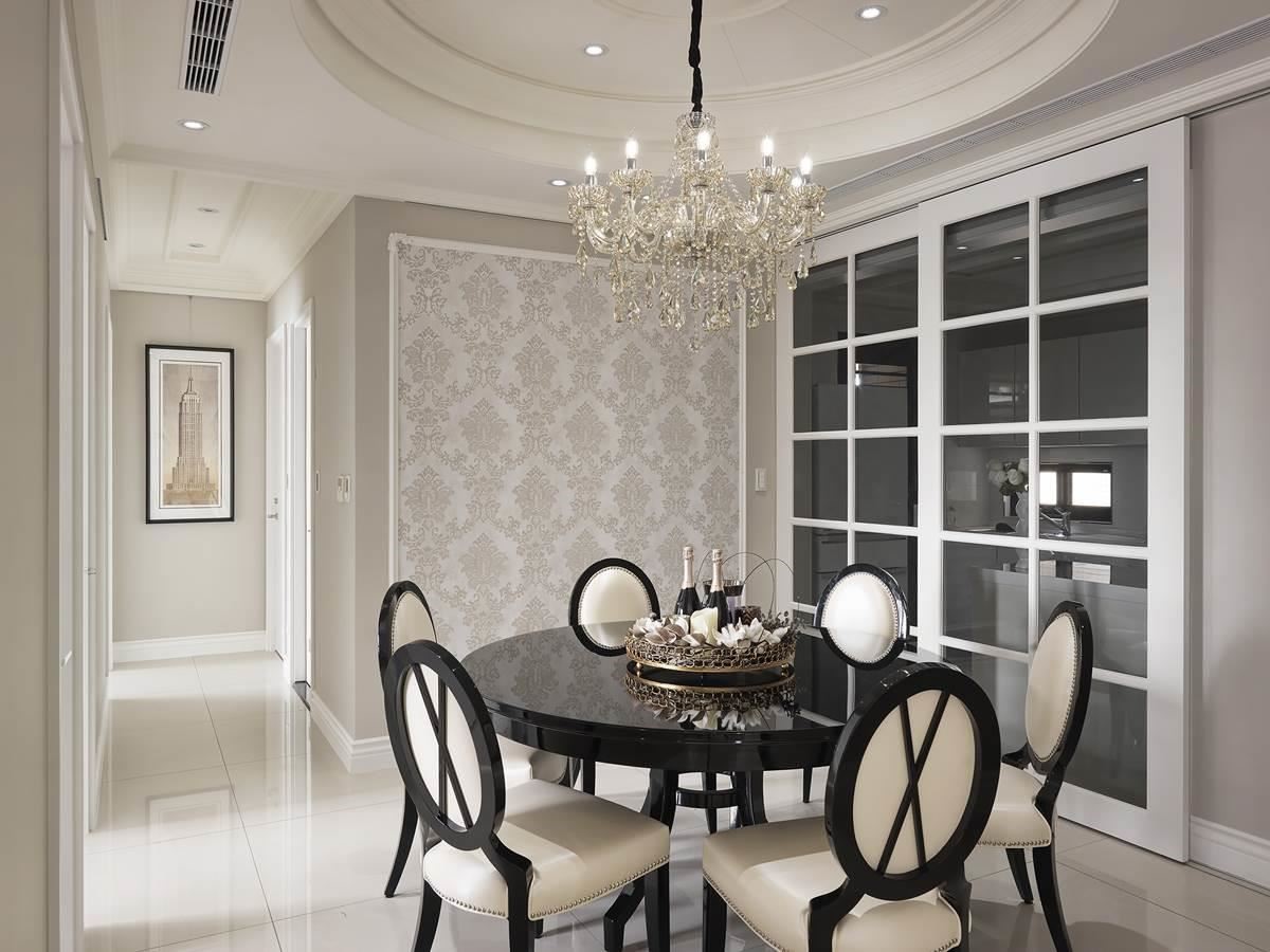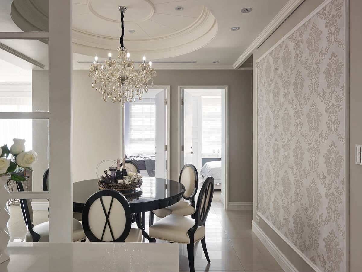 圆形的语汇成为餐厅的设计巧思,天花以渐层的圆穹顶打造,悬挂一盏透亮的水晶吊灯,烘托优雅的印花墙纸,也擦亮黑白色调互搭的经典餐桌椅,注入视觉新意;白框灰玻拉门界定出厨房领域,有效阻隔烹调时油烟四溢的窘况。