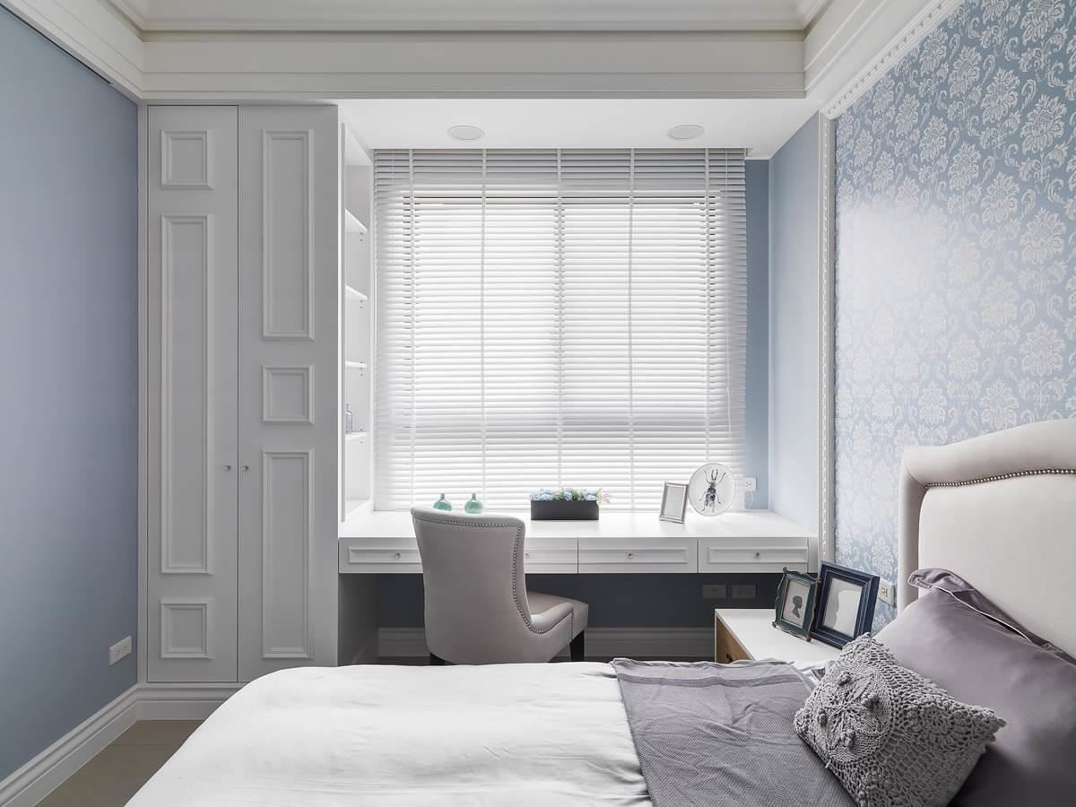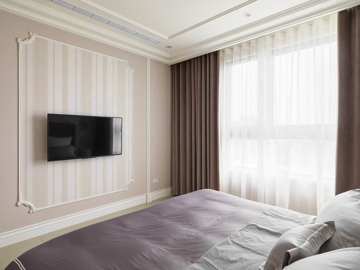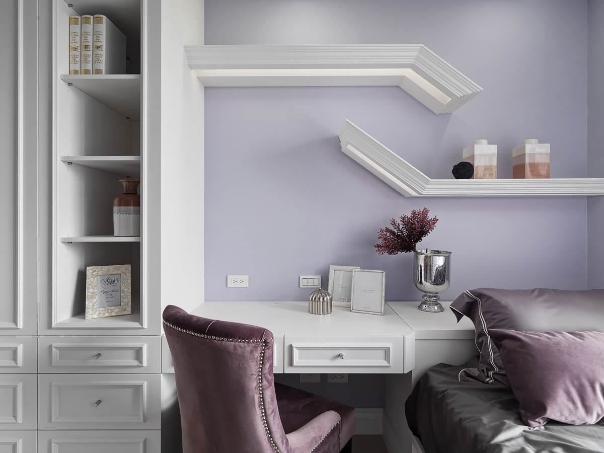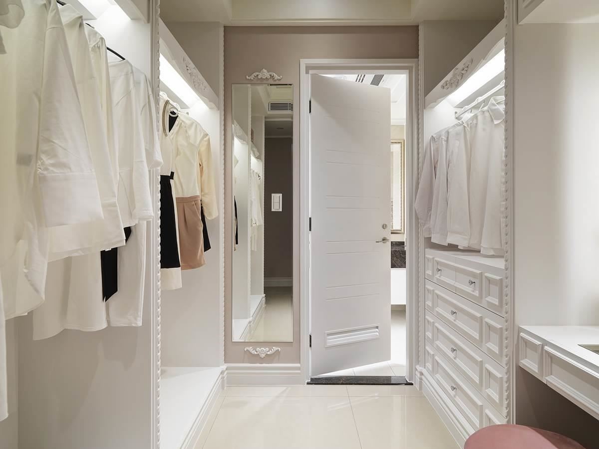 不同色彩与古典细节诠释居住者的品味与性格。一抹粉色调妆点主卧的甜美浪漫气息,印花、条纹与线板交织而成,更衣室更以雕花装饰柜体,满满的开放式衣柜与穿衣镜设计,一圆公主梦。