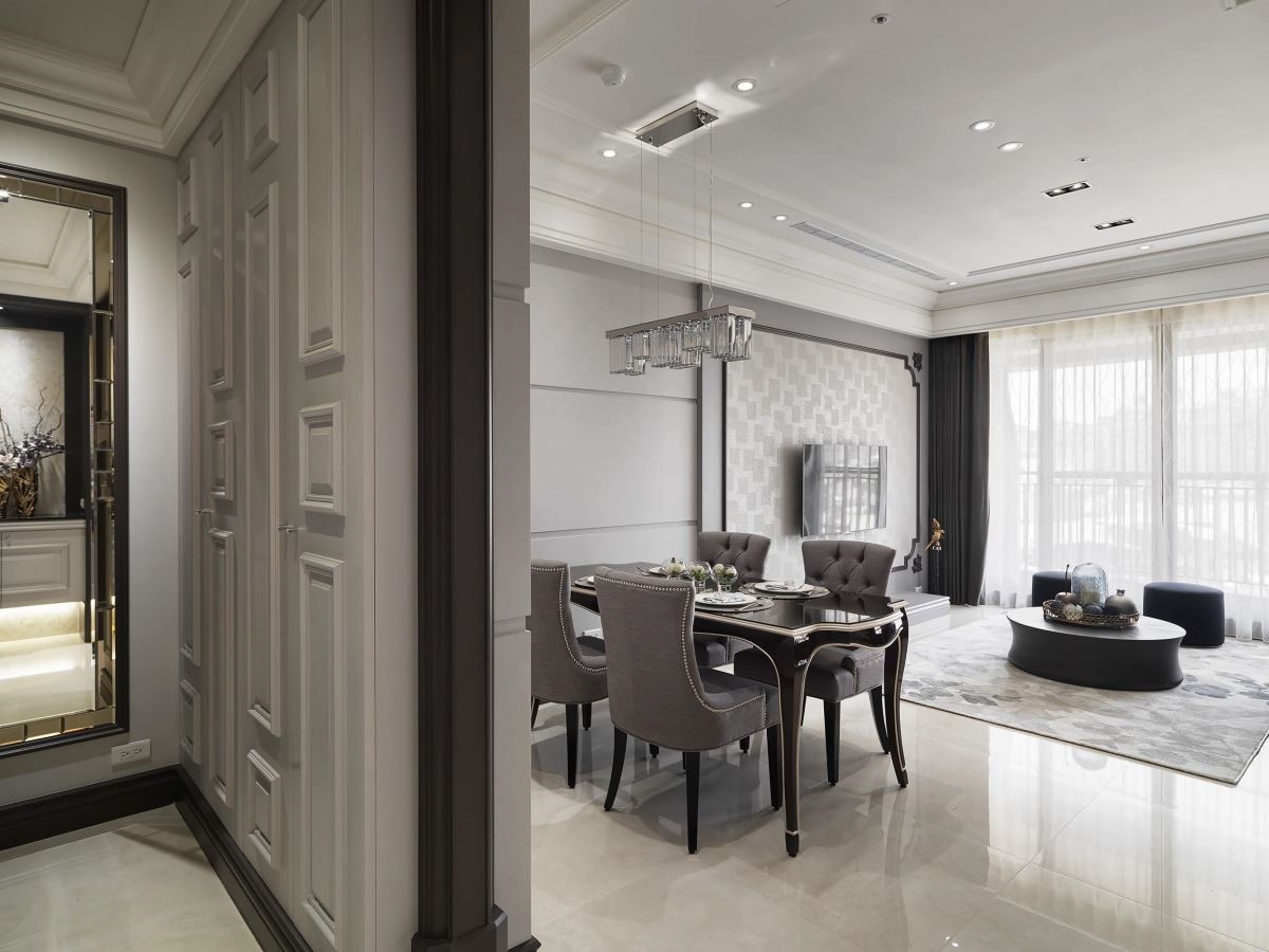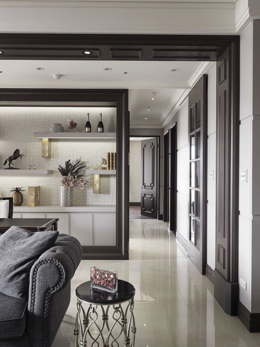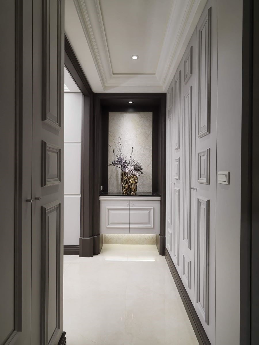玄关开始以美式的和谐秩序展开,简约却大方的线板勾勒出质感空间,藉由花艺与间接照明,打造艺术端景视觉;满点的收纳柜设计,则满足宾客与屋主放鞋与收藏需求。