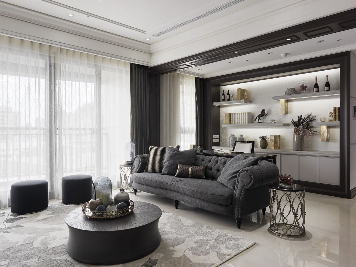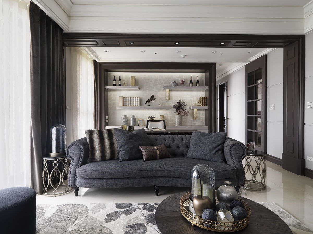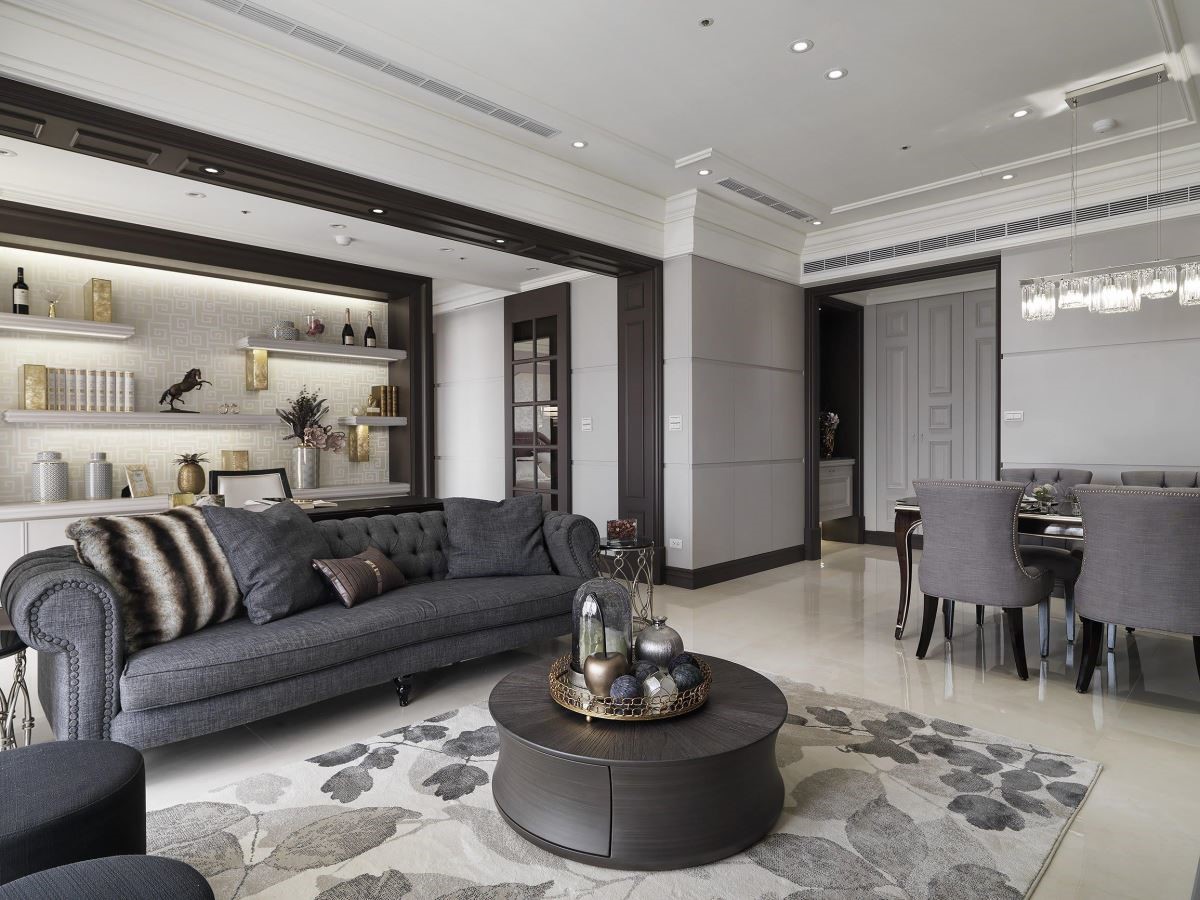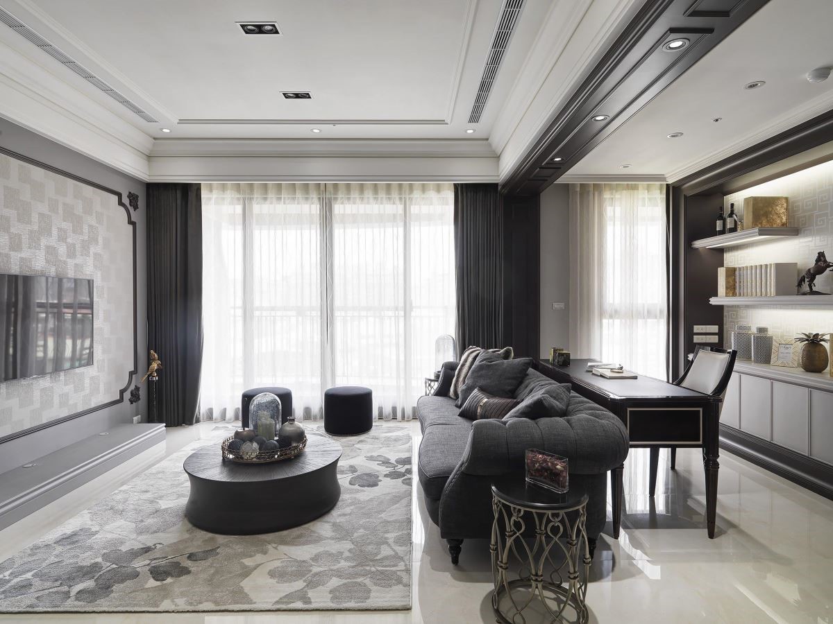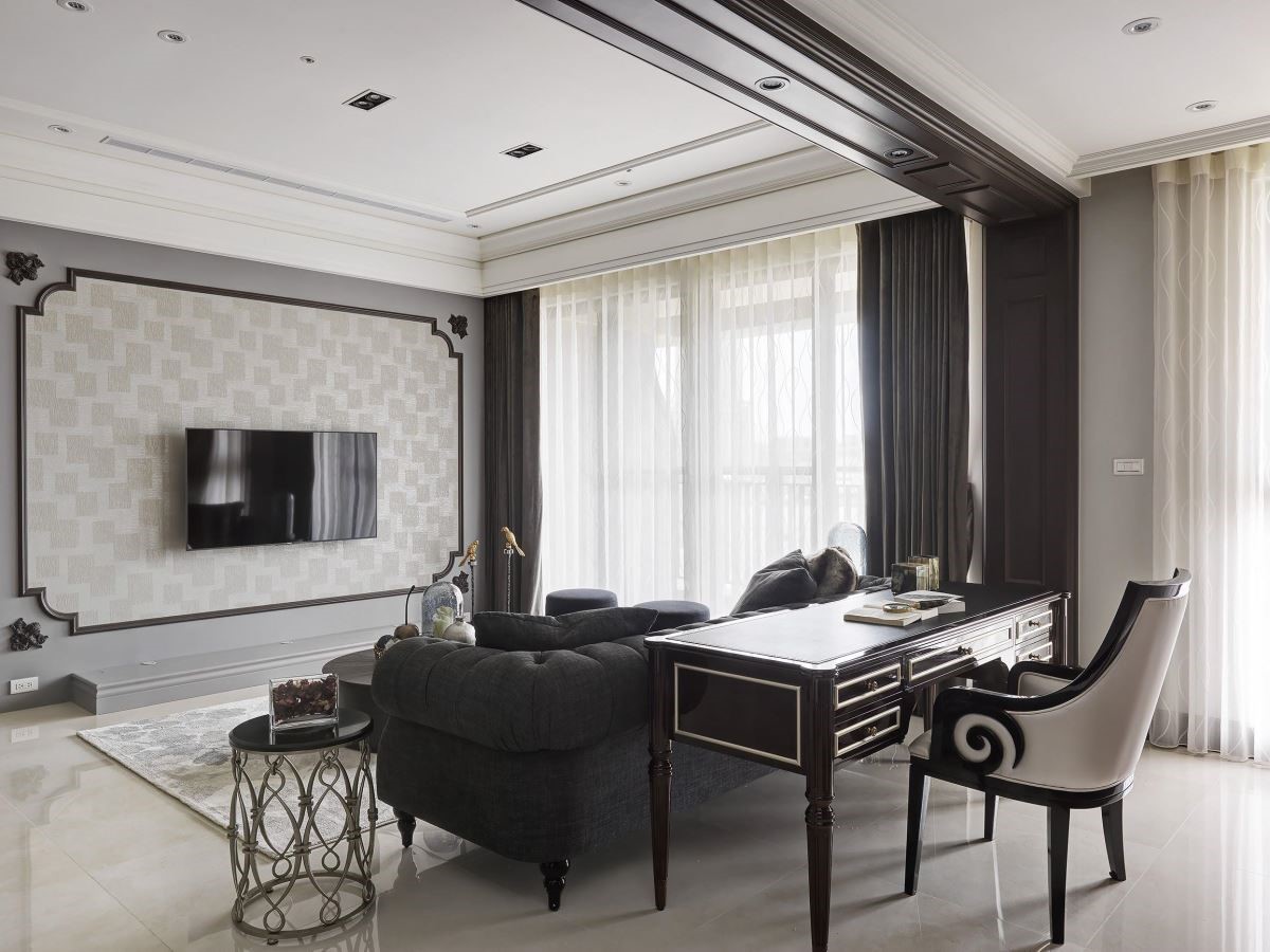 电视墙铺以雅致的墙纸,加上古典的画框视觉,赋予艺术美感,加上沙发的周围以深咖啡色线板铺设,以及书柜以框线的装修手法,创造空间的景深与层次感,同时也让书墙造型更加鲜明,伴随陈列其中的风格对象与艺术品,传递人文艺术之美。