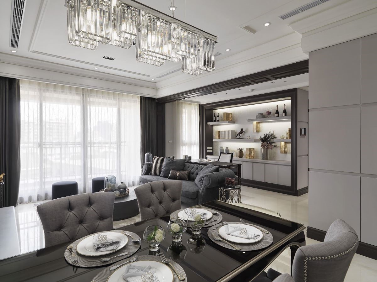 整体公领域让客厅、餐厅与书房相融一室,规划流畅的行走动线,串连领域且让机能更显弹性。餐厅空间里摆设古典的餐桌椅,悬挂一盏冰雕造型的水晶吊灯,带来一抹迷人的精品质感。