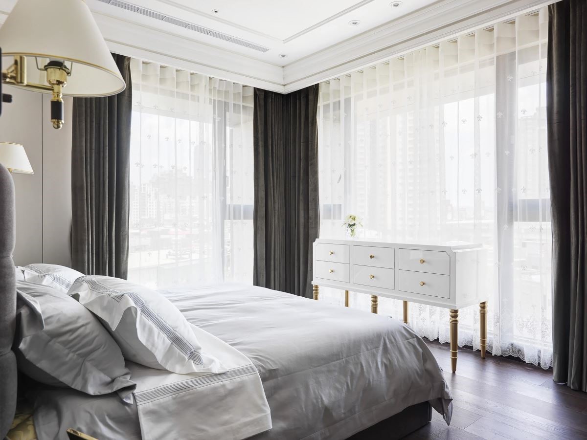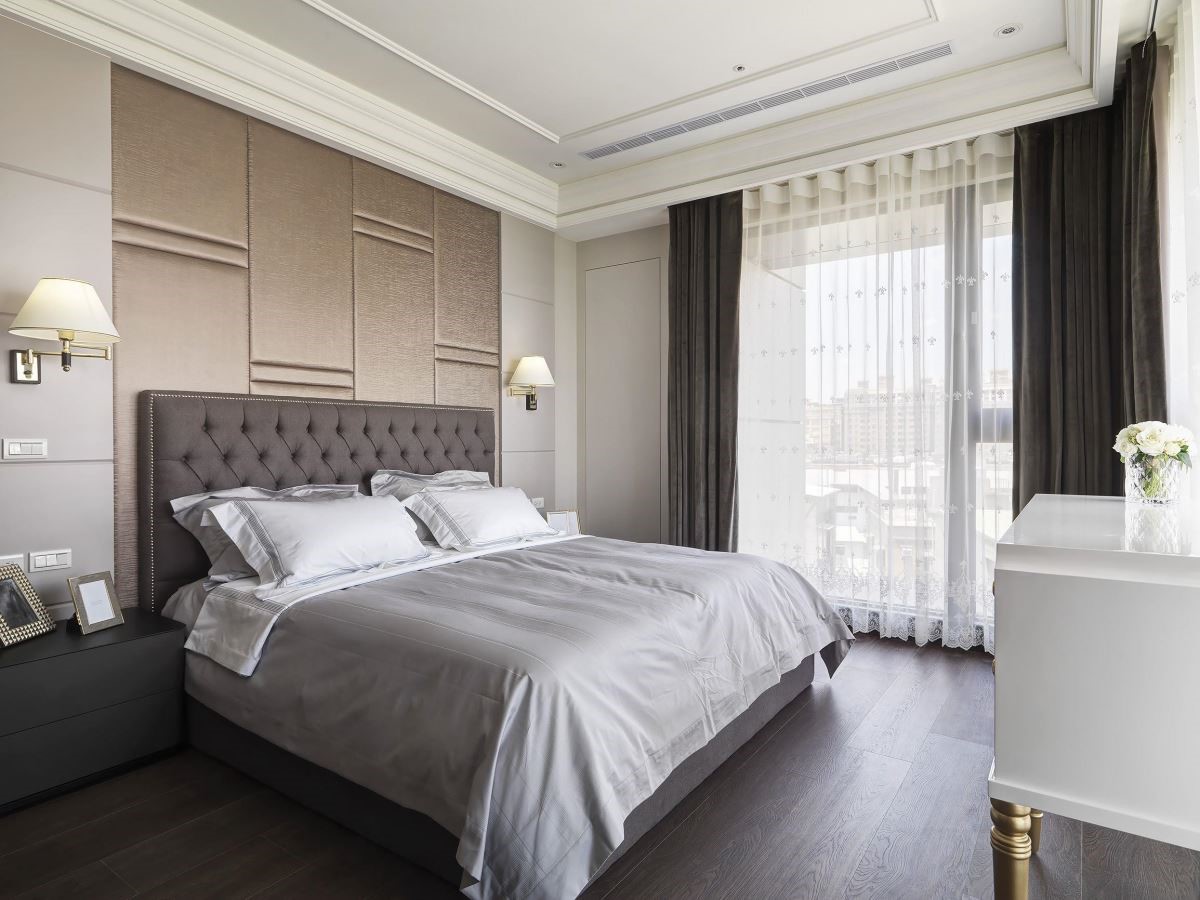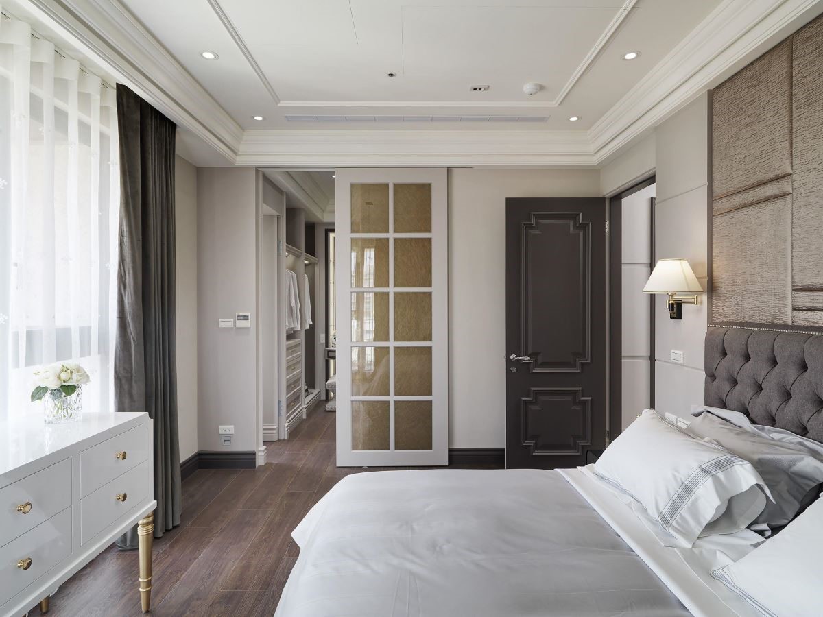 主卧室拥有两侧采光,保满的自然光让室内显得明亮、舒服,床头以金色绷布铺陈,流露低调奢华感。