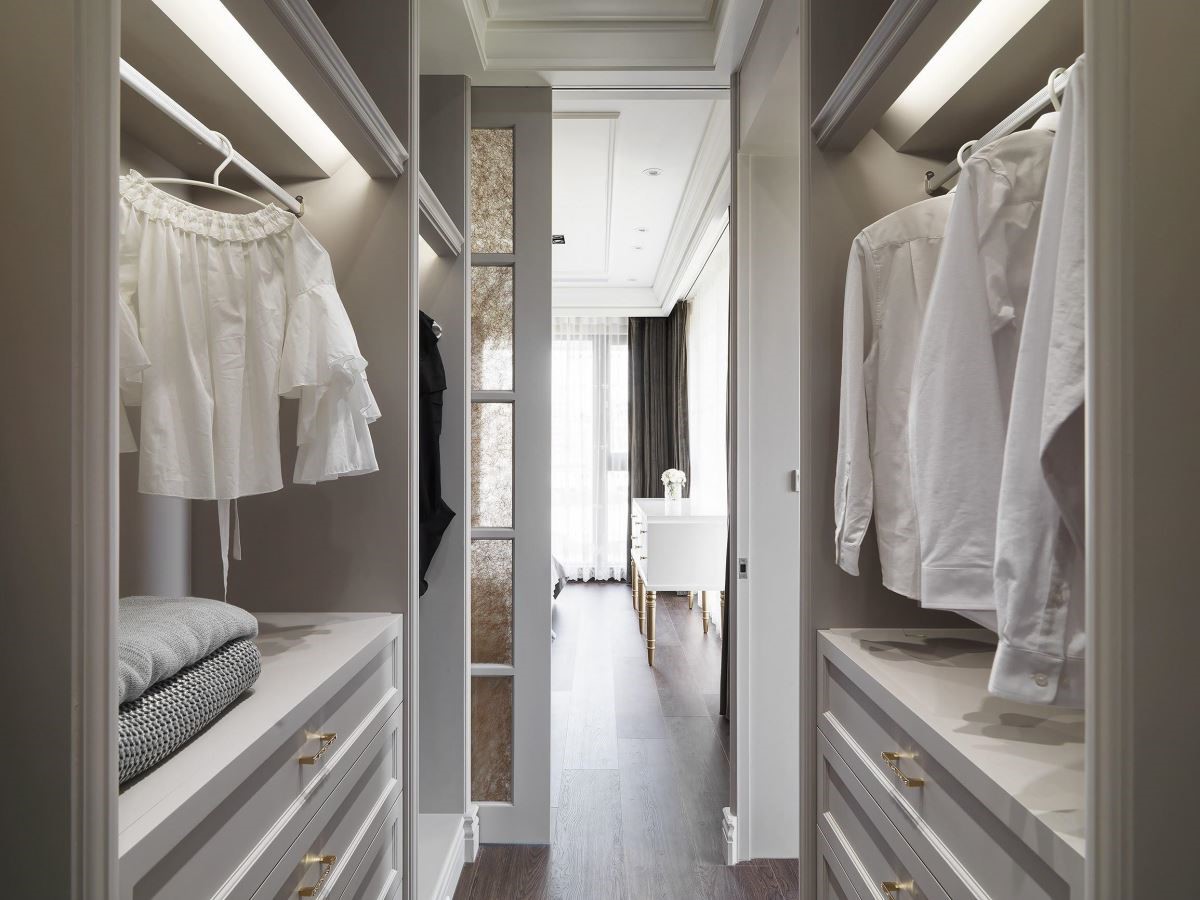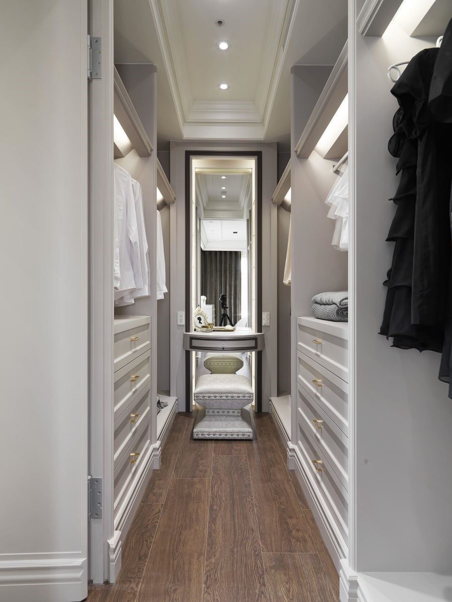 利用白色拉门创造更衣空间,白色面板与柜体的设计搭配金色把手,呼应古典的华美气息,两侧开放式收纳不仅可收藏大量的衣物,兼具展示机能更能诠释服饰配件的美感细节。