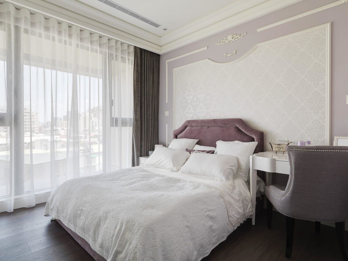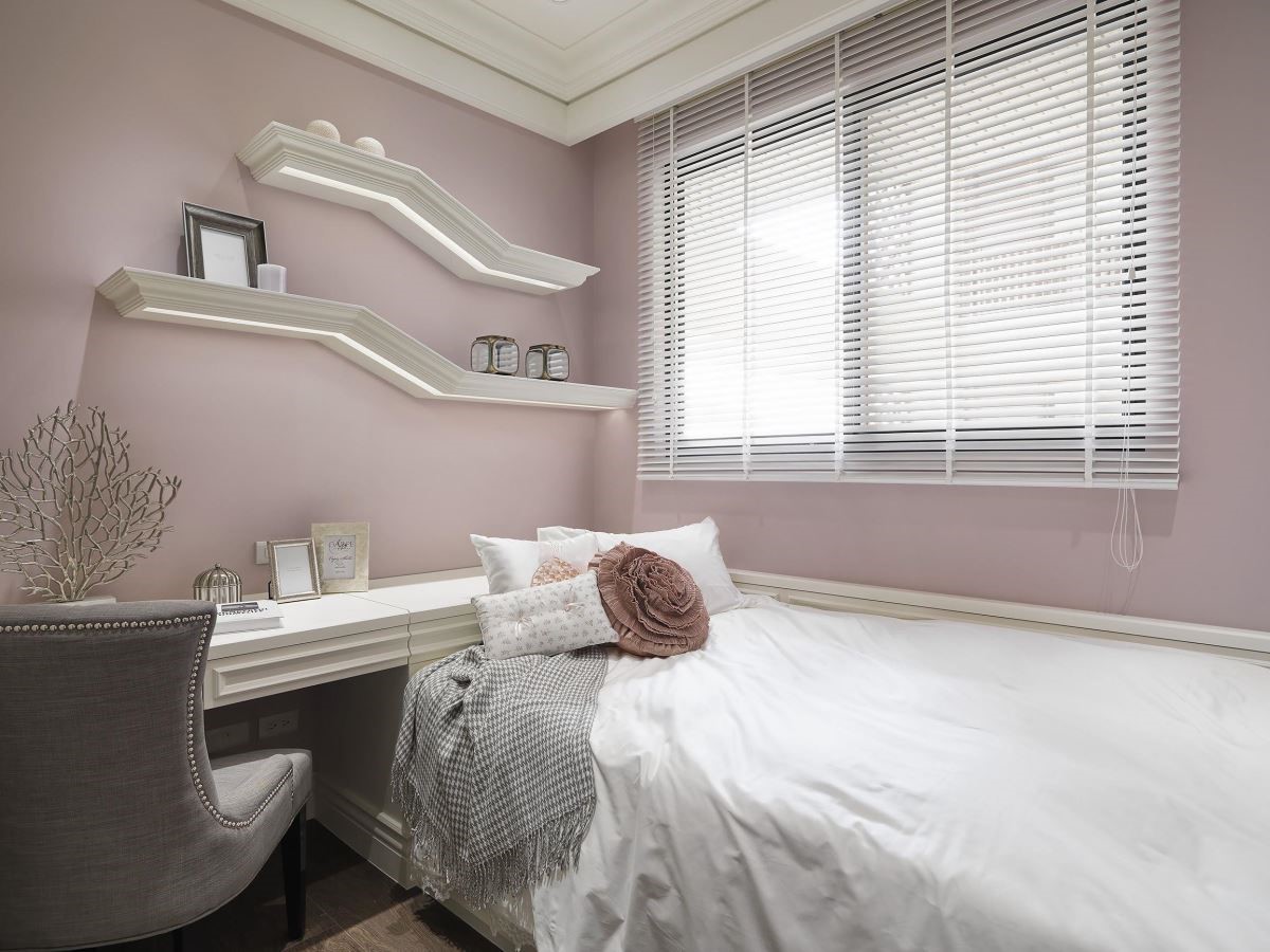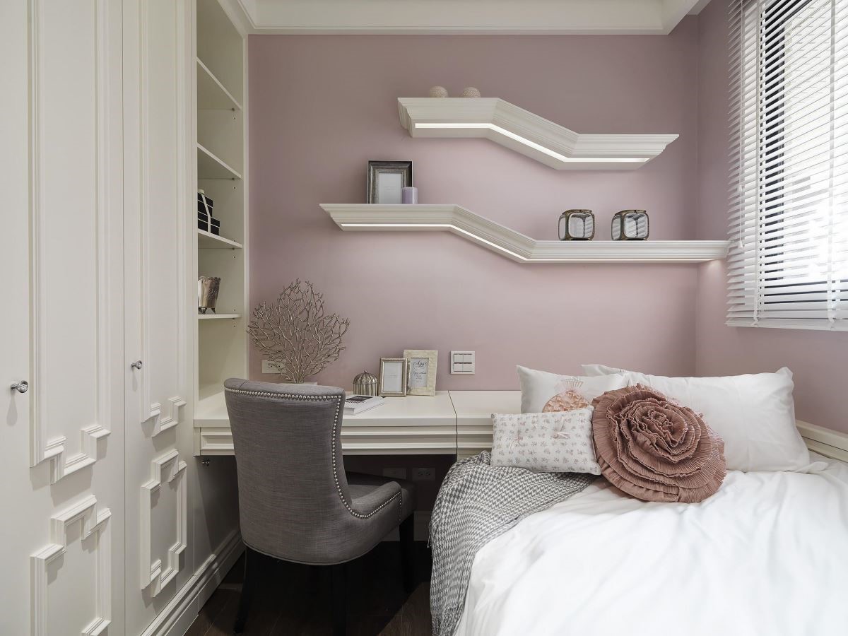 床头墙以浅粉色为底,搭佐白色古典线板与蕾丝质感的墙纸,成功打造梦幻少女心的氛围;让梳妆台与书桌的功能整合为一的方式,在有限空间里创造高效能。