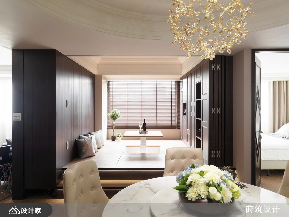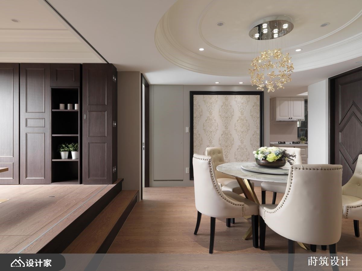 客厅后方规划餐厅与多功能室,米色调餐桌椅、浅色木质地板的安排下,空间转为温馨、舒适,伴随金色点点繁星造型的灯饰,擦亮视觉新意。