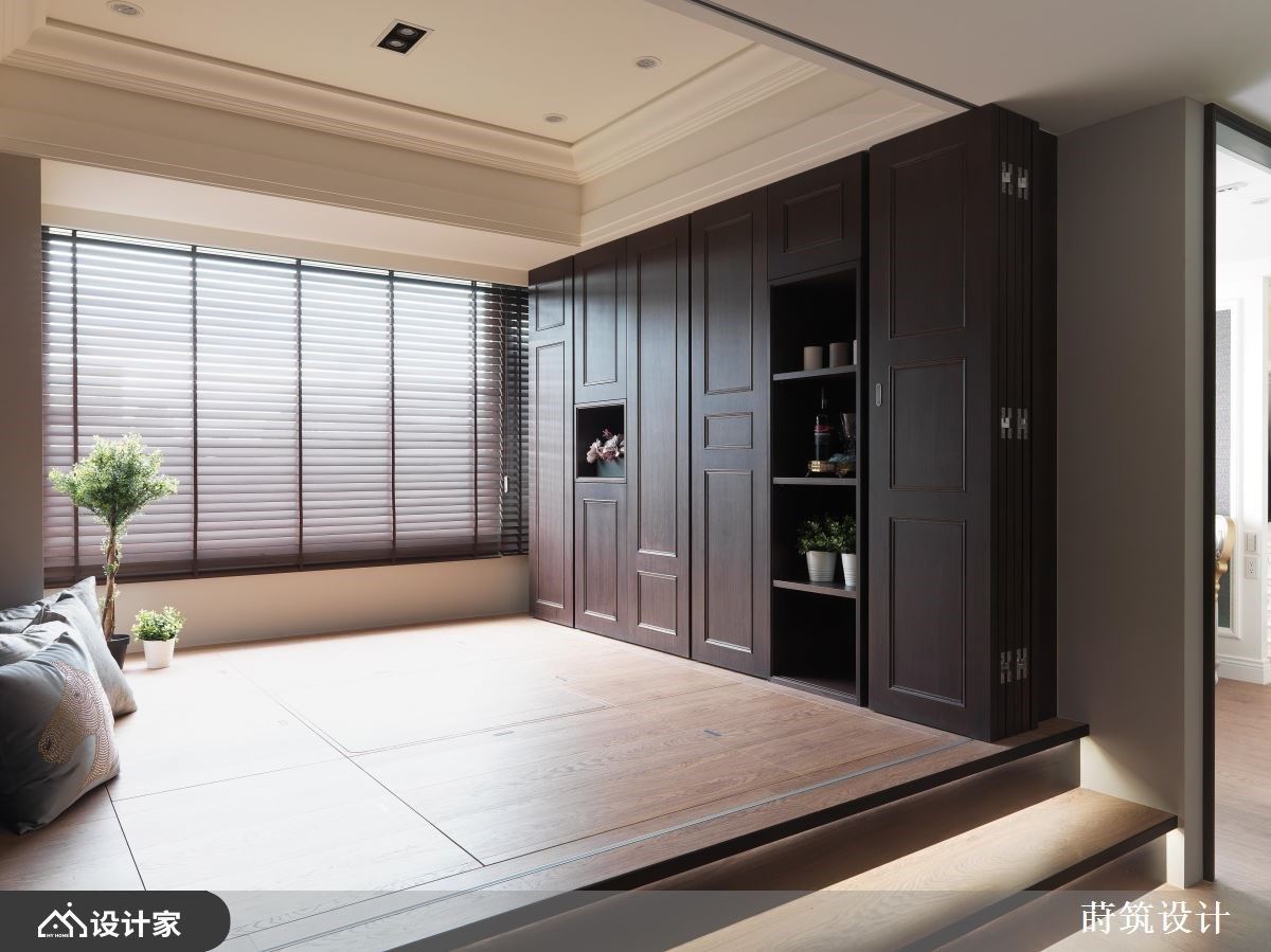 多功能室里,以架高木地板垫出空间格局,大面窗户引入充沛暖阳,延续入口处的深色木质收纳柜,增添一抹沉稳气度;中央设计弹性的升降桌,让屋主可从事多元的娱乐活动,并设计一大面木质折门界定内外领域,当空间需要转为休憩睡眠或是保有隐私时,可全面拉开。