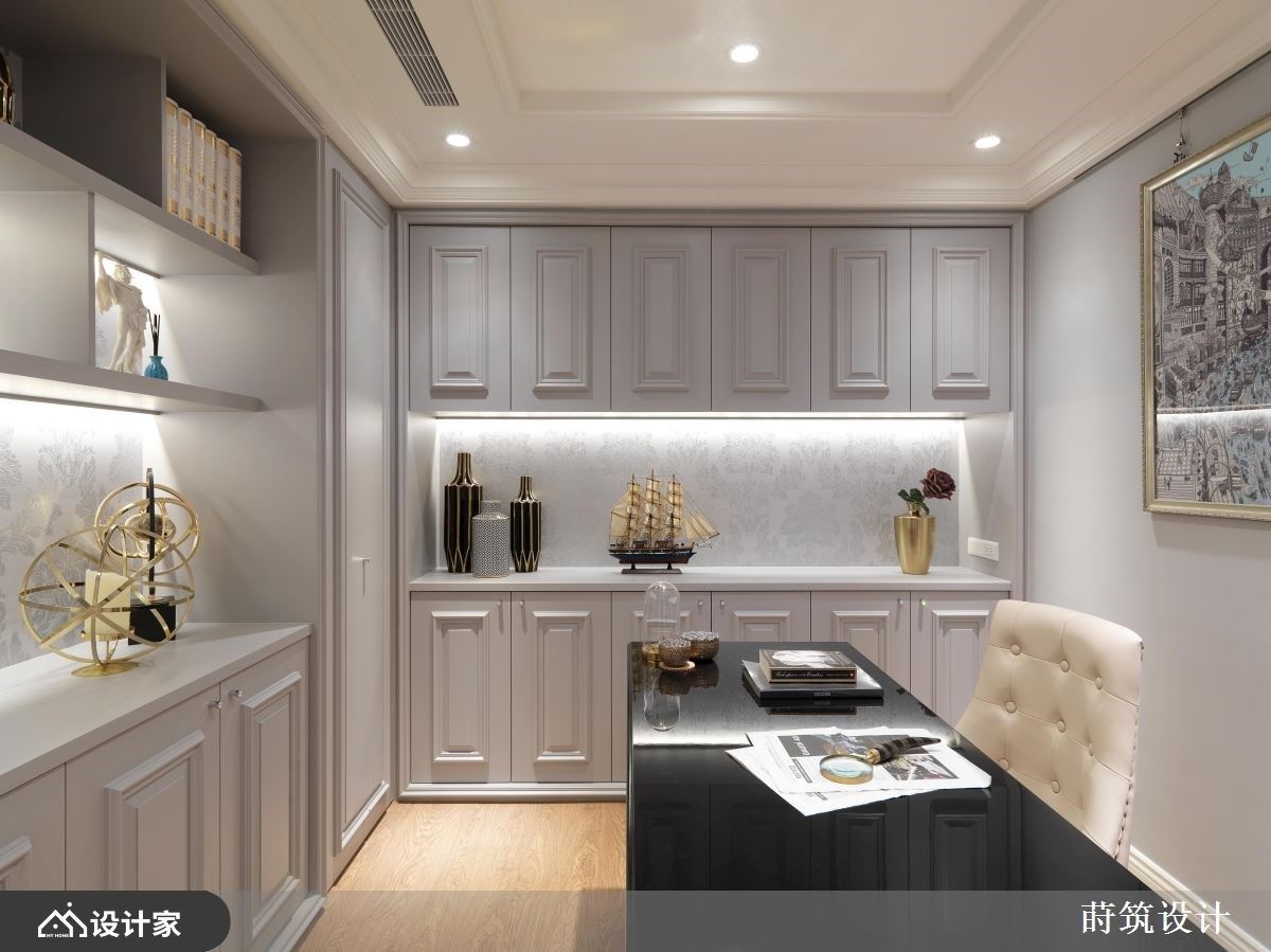 书房空间里以藕色为基底,古典线调的家具造型,与柜体以线板描绘所展现的和谐秩序,呼应法式古典风情。