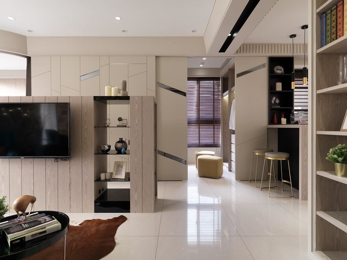 电视墙背面区规划卧室、卫浴与更衣室,以木纹做为隔间门片,并利用斜切面黑玻切割不规则造型,更添视觉活泼度与变化,大量的木皮质感,酝酿自然休闲的生活态度。