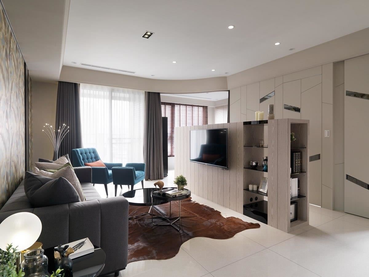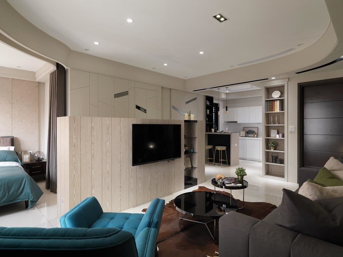 整体规划上采开放式设计,天花板藉由不规则圆弧造型美化,融化原本方正、较显呆版的室内;同时隐藏机台线路、风口,环绕的设计串连整体领域,并藉由半隔屏式电视墙的双面柜体、窗帘或拉门的隔断,连结客厅、餐厅、厨房、主卧等领域,形塑通透、流动的空间氛围。