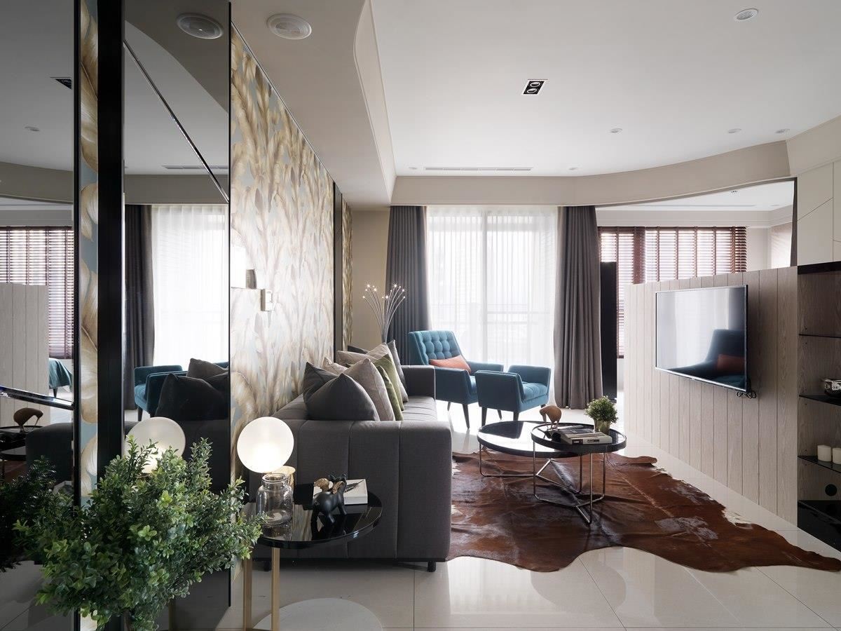 没有规划玄关,仅利用靠进入口的沙发背墙安排一面落地茶镜,兼具穿衣镜以及带来放大空间之效。