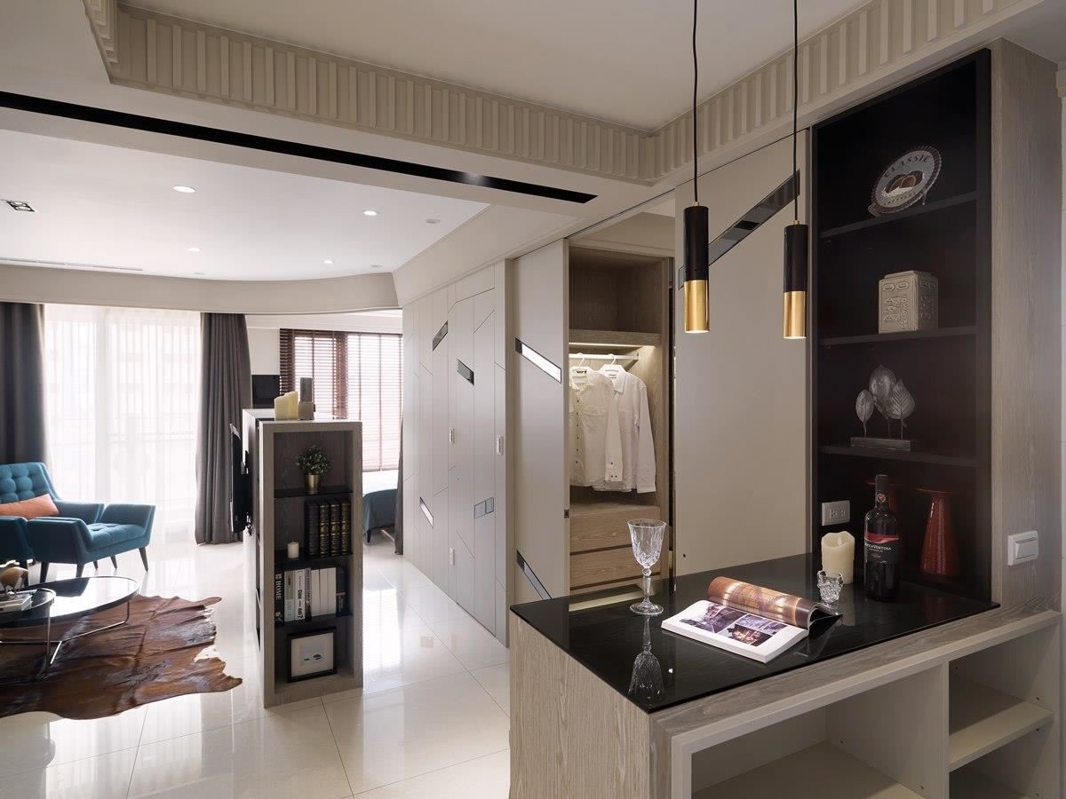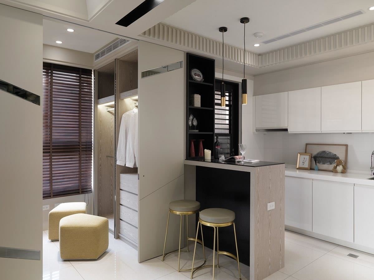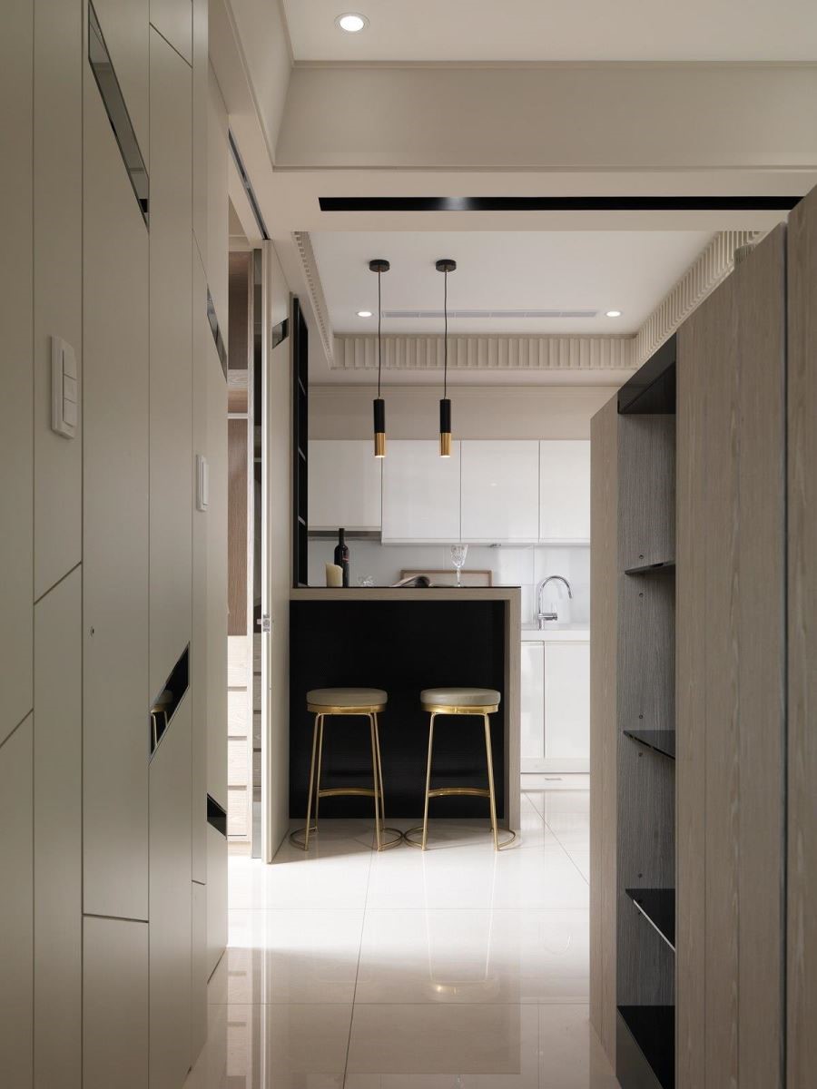 半高的电视墙划分公私领域,两侧保留走道且形成回字型动线,背面与侧边皆搭配展示柜,强化收纳机能。餐厨空间采开放式安排,吧台下方以及上方壁面柜体利用深色面板衬底,搭佐木皮修饰,两盏金属吊灯妆点,挹注时尚美感。