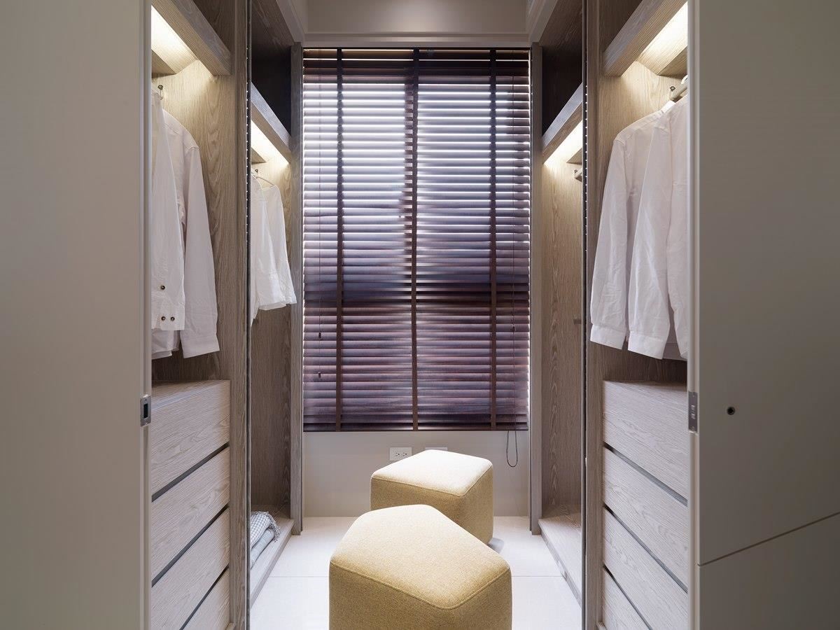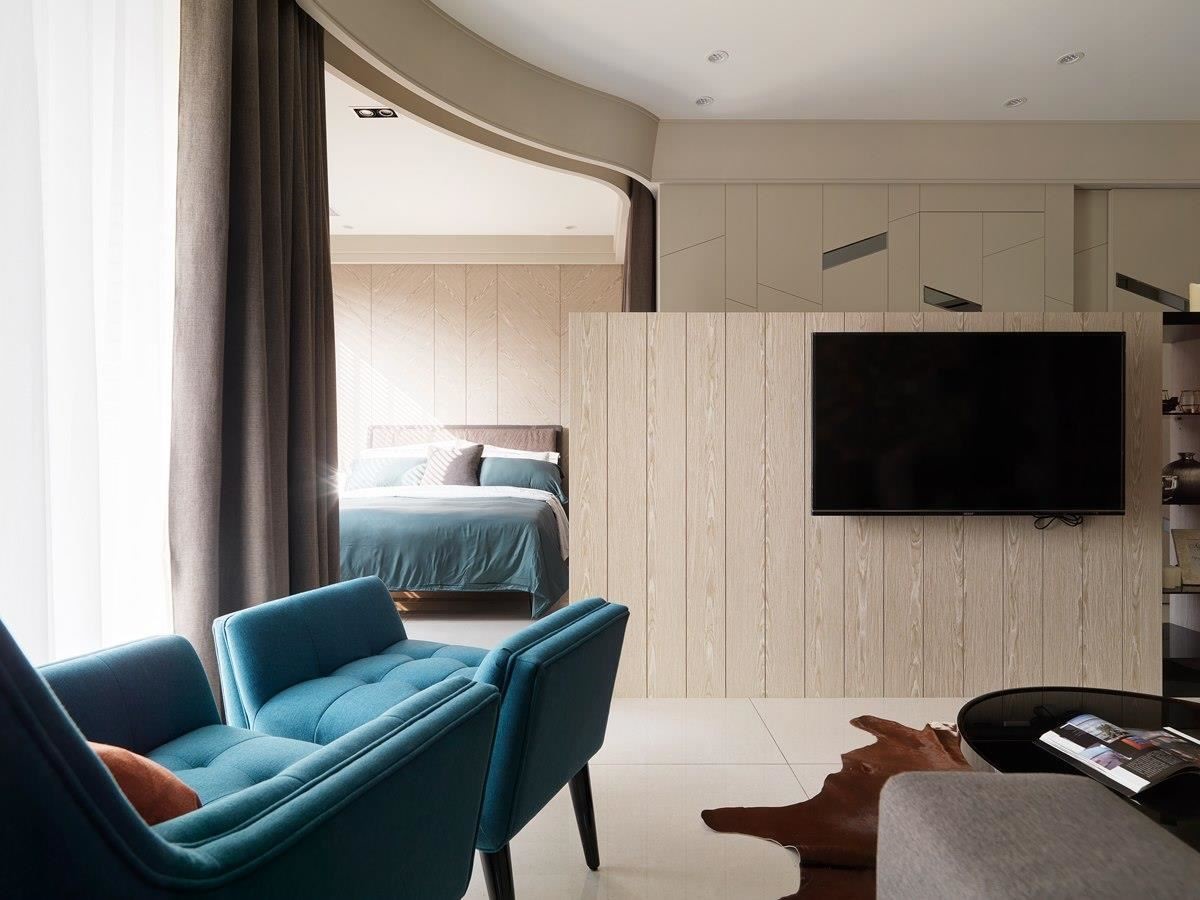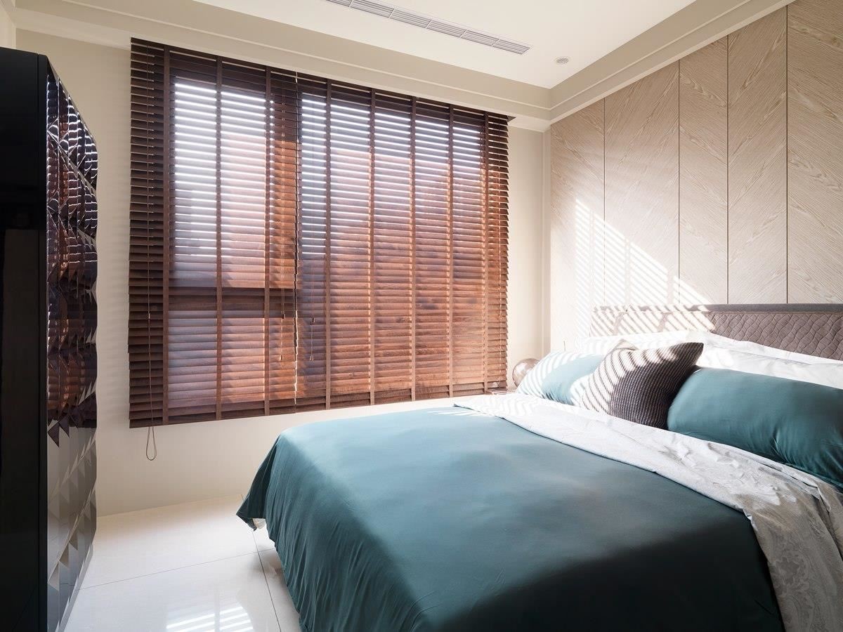 主卧室与公领域简单透过窗帘界定,且入口与客厅的落地窗成同一面,窗帘全面开启时,可引入大量户外光线。卧室里,床头板以人字斜纹木皮安排,结合木质感的百叶窗,交织惬意、字然之感。