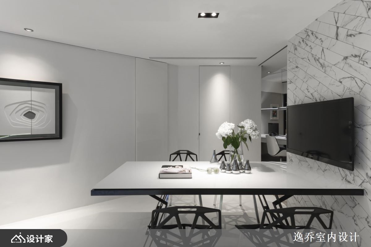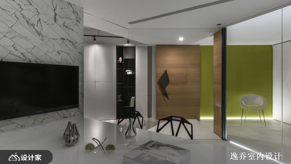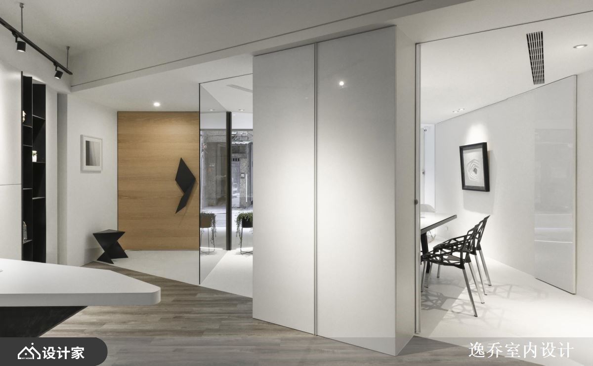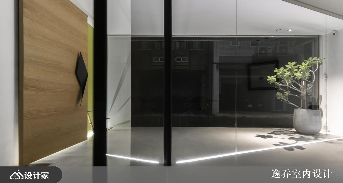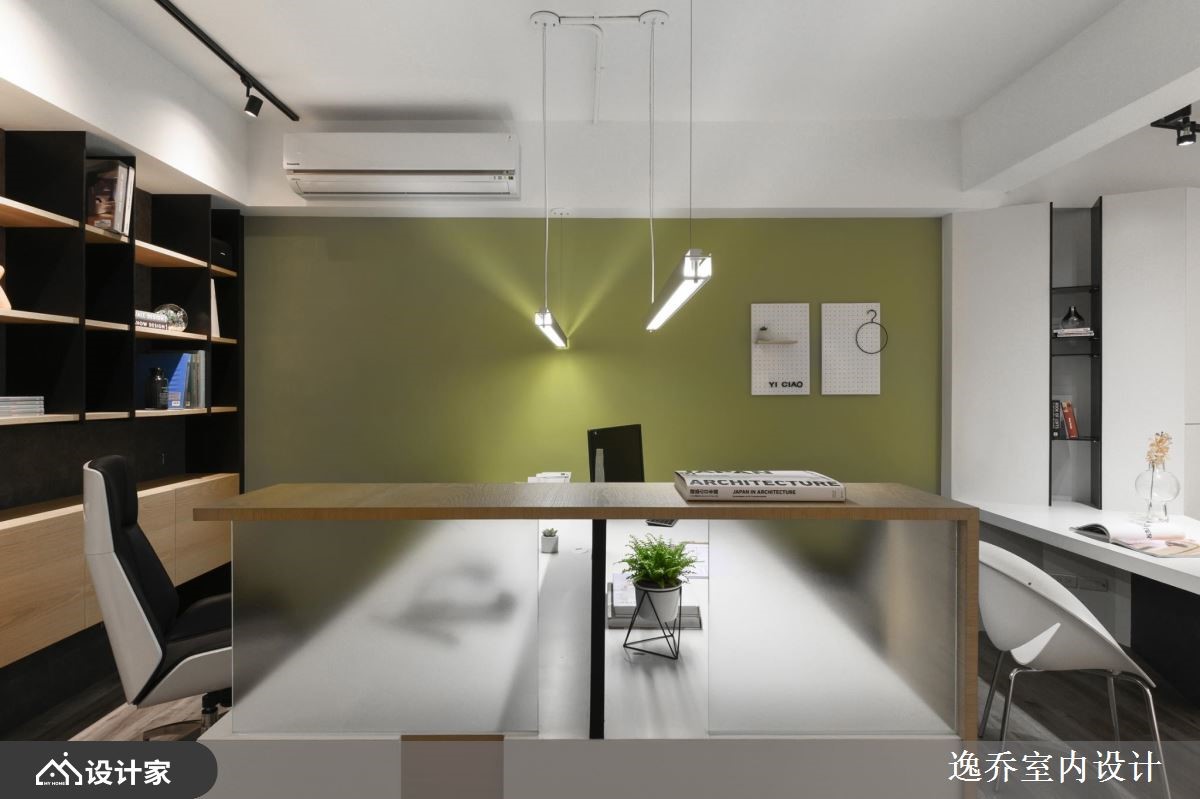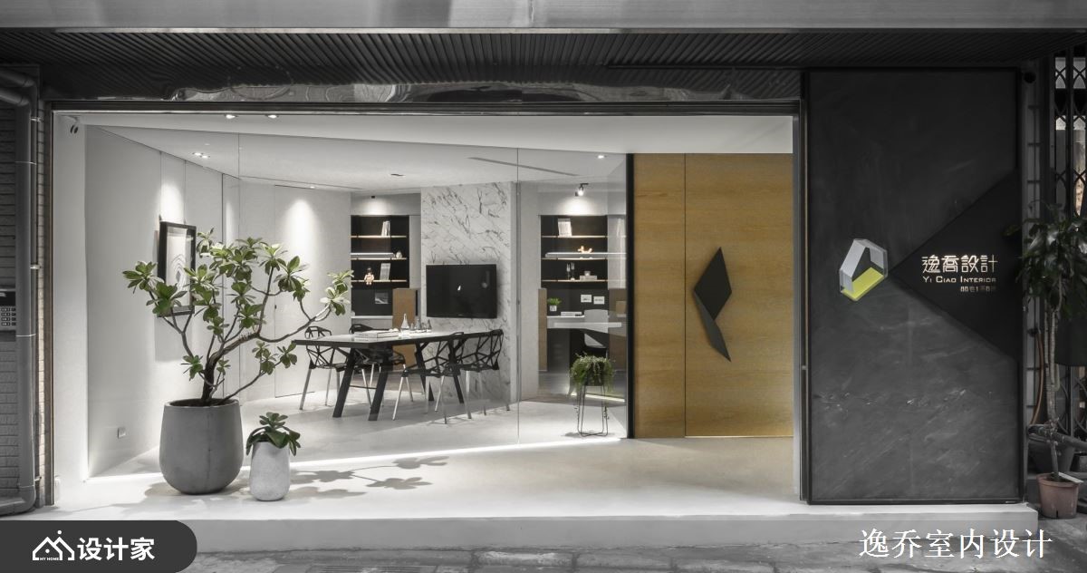 长形屋里原为历经多年的老屋,设计师先利用利落的黑白色调饰底,展现一抹现代时尚感,局部透过木纹妆点,注入自然生命力,加上开放展示柜体的安排下,酝酿人文美学色彩,老屋全然蜕变,一展令人好感且期待的上班生活。工作室的大门口以透亮特性的玻璃作为隔断,可一目了然室内的办公情况,成功打破室内外分野鲜明的刻板印象;黑色石材门拱堆砌出入口气势,洁净的白色石材铺设地坪,伴随绿意植栽的摆设以及木纹的门片安排,调和出简约、轻爽的气息。折纸般的大门扶手造型,隐喻创新、充满灵感的创作空间,推开大门、走进室内,白底搭配淡雅纹理的石材作为电视墙,形成会客空间;墙体两侧保留通道,地板换上木纹肌理,随着嵌灯的指引,以及流线型柜台的摆设,一路来到走进办公;浅绿色墙面成为主体墙,清新的色彩特质有助于灵感激荡之余,也能享受放松、惬意的工作品質,打破一般人对办公室的沉闷印象。小编的最爱有限的空间里,透过大量的白色饰底,入口处以穿透感的玻璃材质打造,打破空间界线,在壁面还透过开放层架的安排,空间随之展现放大、舒心之感,让人爱上工作!