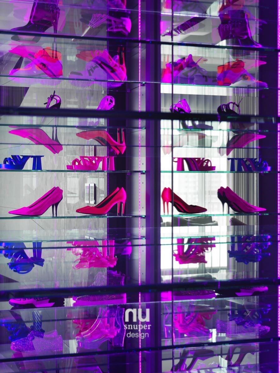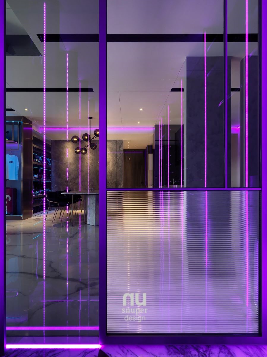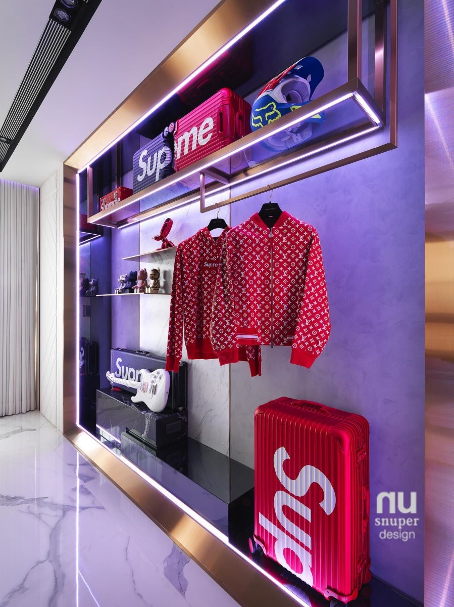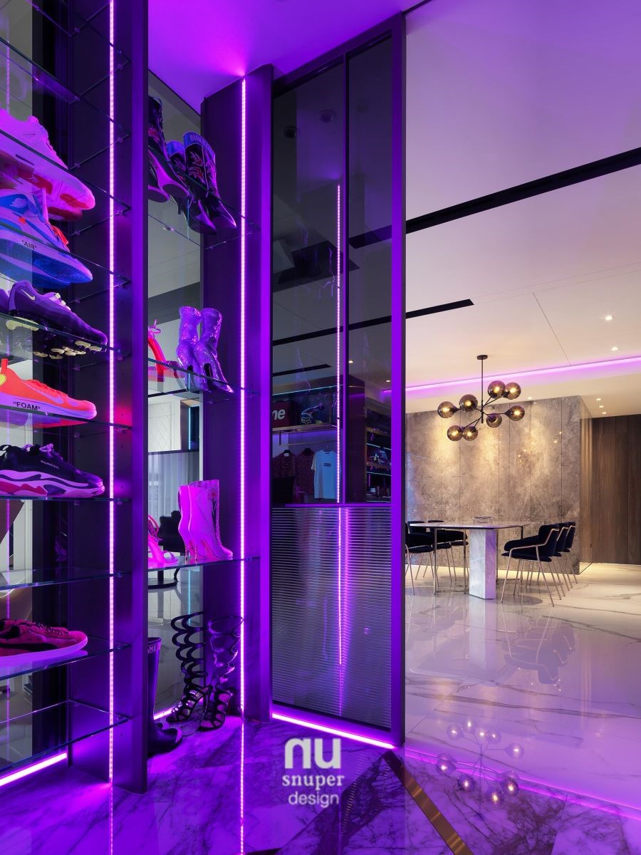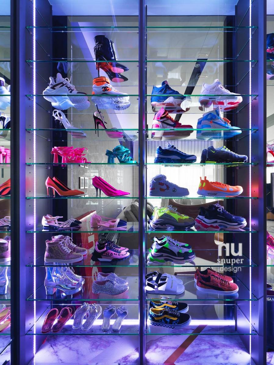 我们可以崇拜任何一个偶像,但不可能成为他。不随波逐流改变,坚定本心,才有可能互相拥有、共同成长,接近自己喜欢的样子。 家是自我的实现,展现独特的个人时尚之处。试图将精品品牌的橱窗规格挪移至住宅之中,超乎家居尺寸的巨型的玻璃鞋室,从玄关处进入后,沿着立面延伸、转折,通过不锈钢、镀钛、玻璃及镜面的异材质结合,让每双鞋履都能被 360 度欣赏,成为表彰居住者性格最好的诠释。