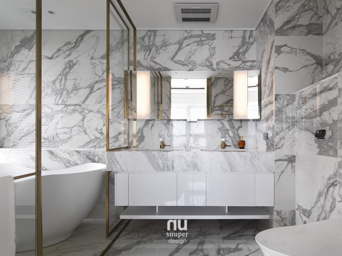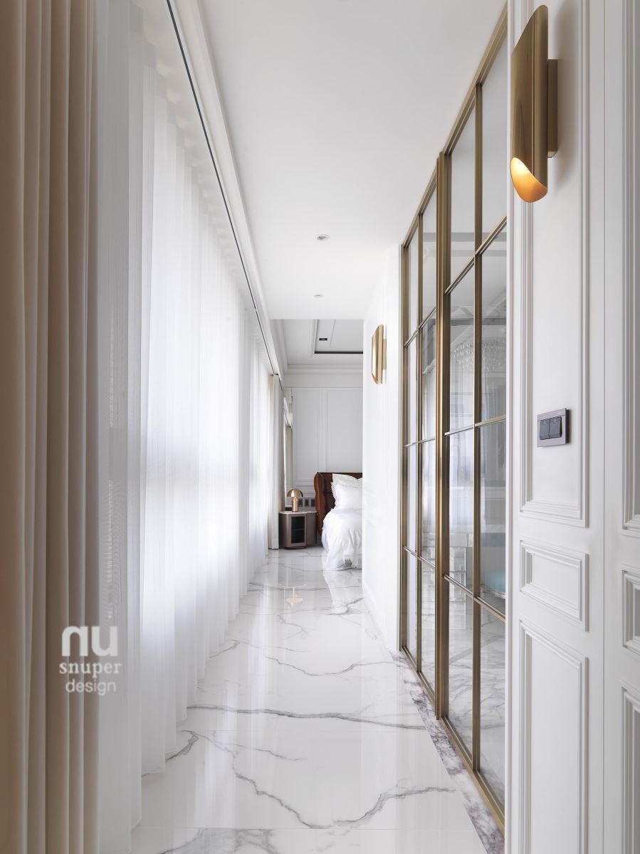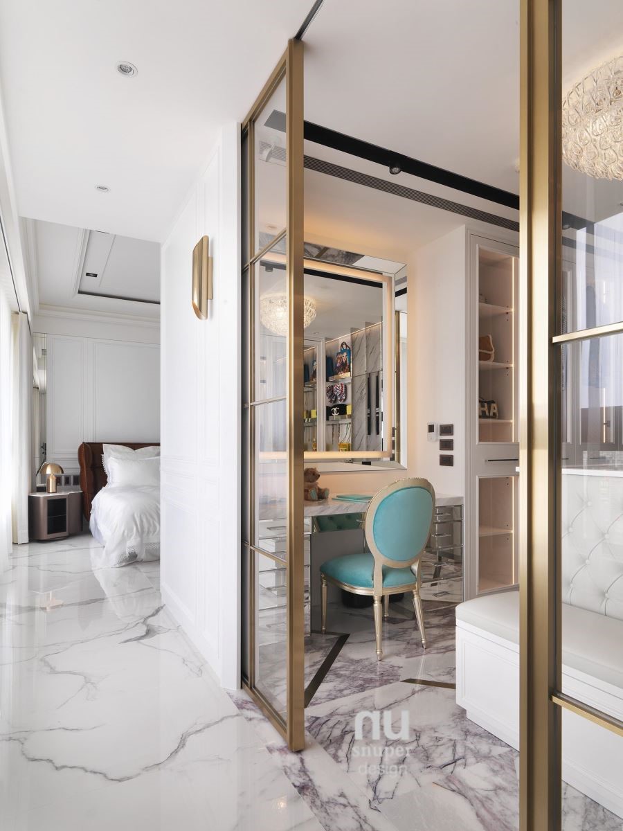进入更衣室的立面成为链结公、私领域的中介,有别以现代风格为主轴的作品,金色的镀钛门框顶天立地,将大尺度的气势流露无遗,线板装饰的墙面,则深邃新古典风格的韵味。