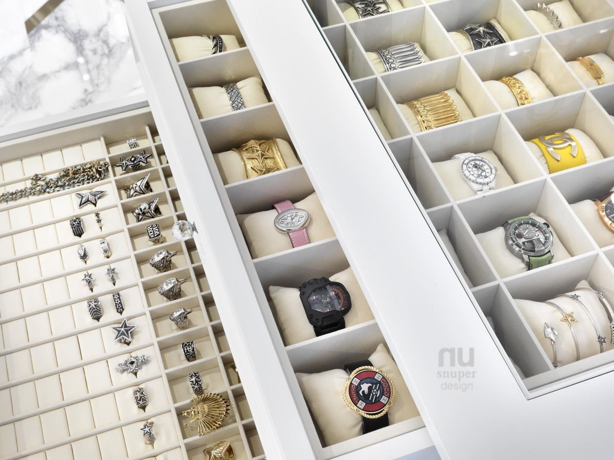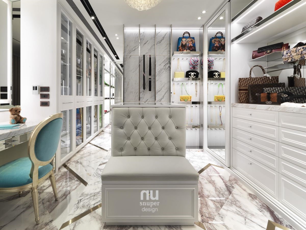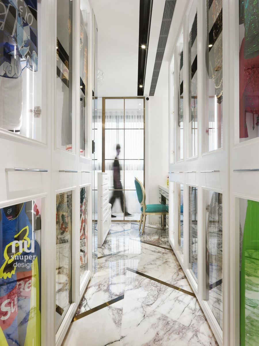 在视觉的引导下,更衣室内有别于正常住宅的宽裕尺度,包含铺叙着大理石及嵌入镀钛金属的地面,再再都以极致的细节,重复表述居住者的兴趣及嗜好。经由设计者的统整规划,分门别类为屋主夫妻安排衣物、表款等收纳,同时更包含了梳化及穿衣等功能,附加多元实用机能。