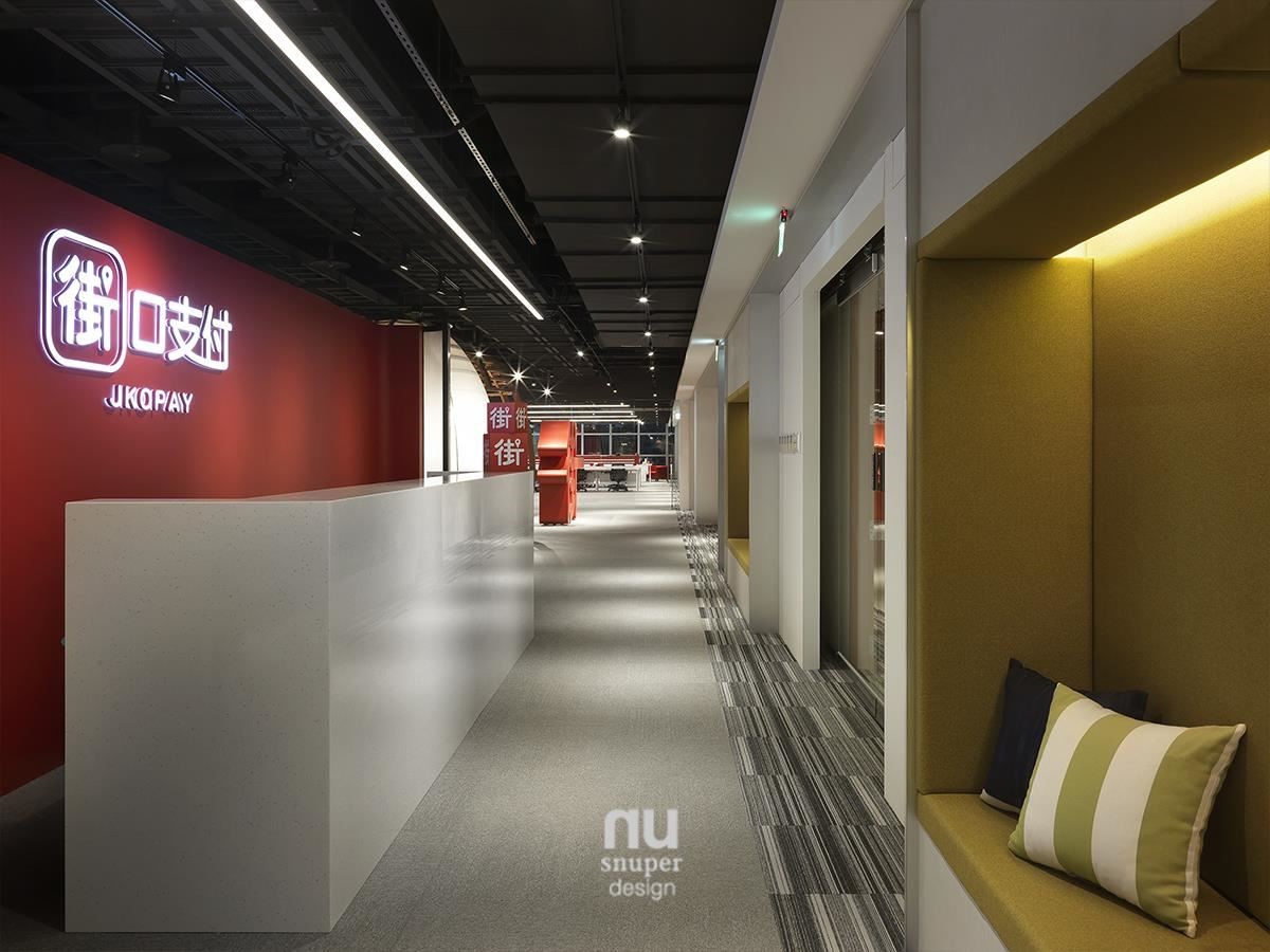室内空间整体为非常明确的长方形,在设计上除了要克服长型空间使用上的局限,同时更试图融入企业品牌名「街口支付」的意涵。