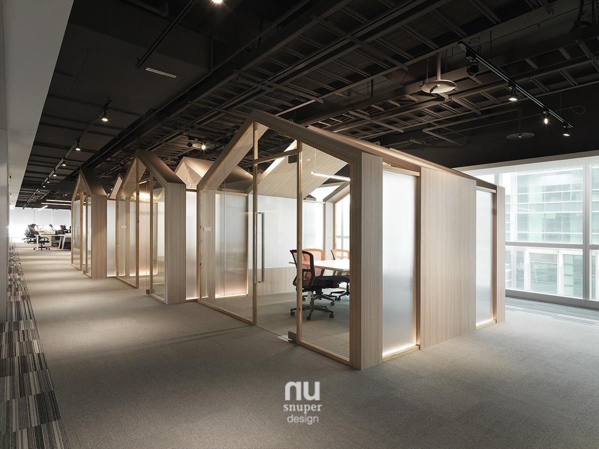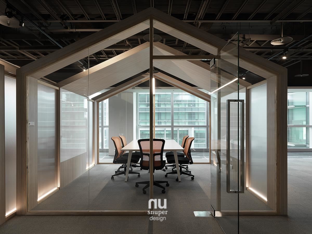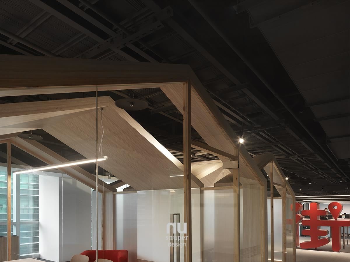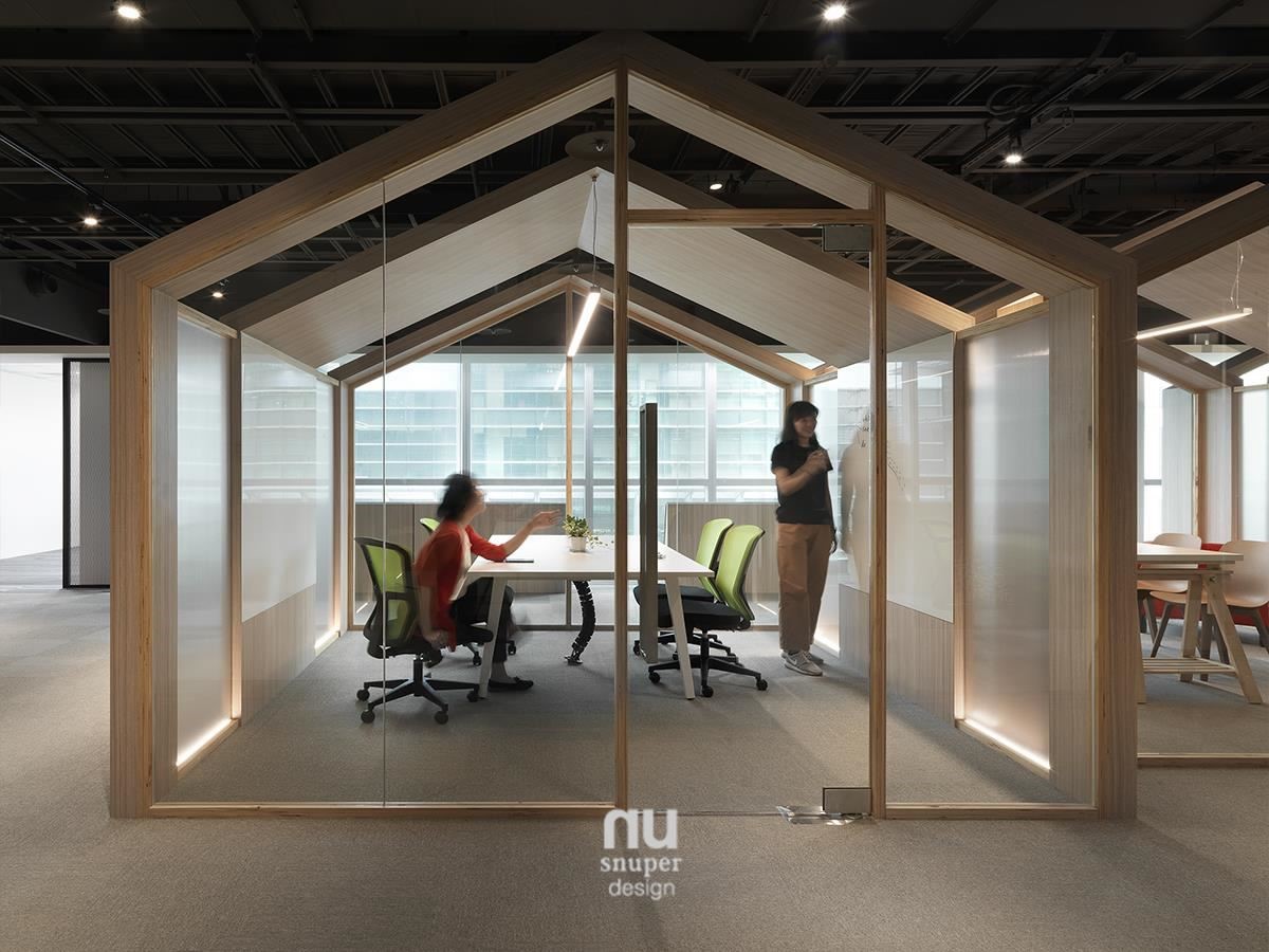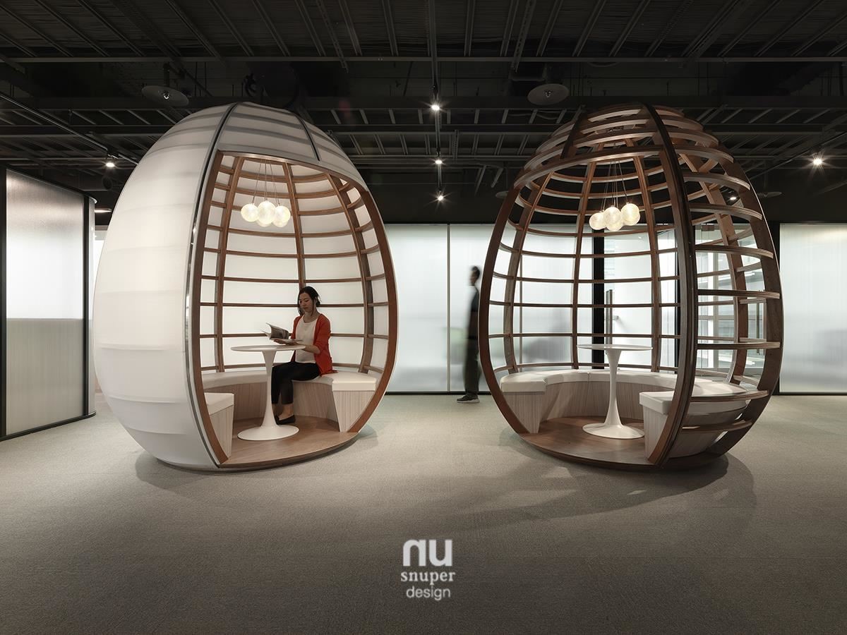 小木屋、蛋椅在空间中让人不期而遇,童趣、安全感的氛围,促使团队讨论的氛围更加愉快,让工作流程更加顺畅。