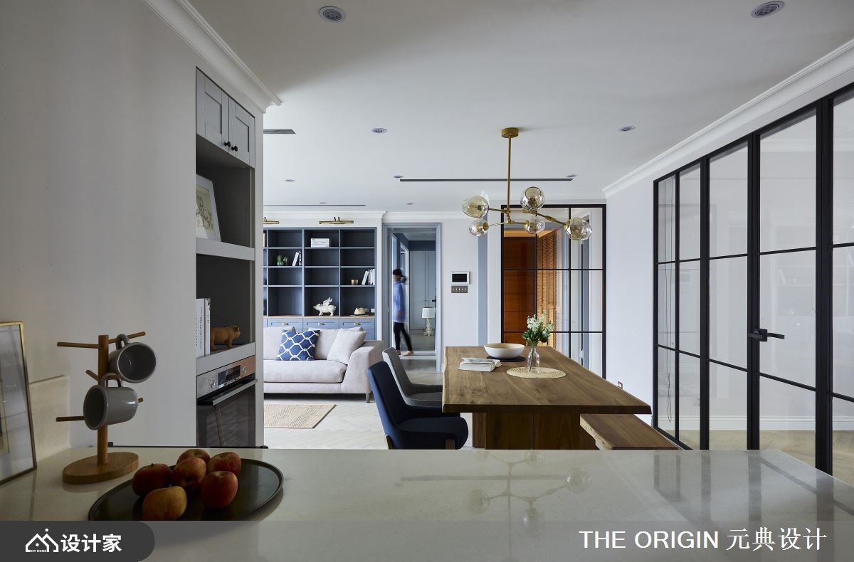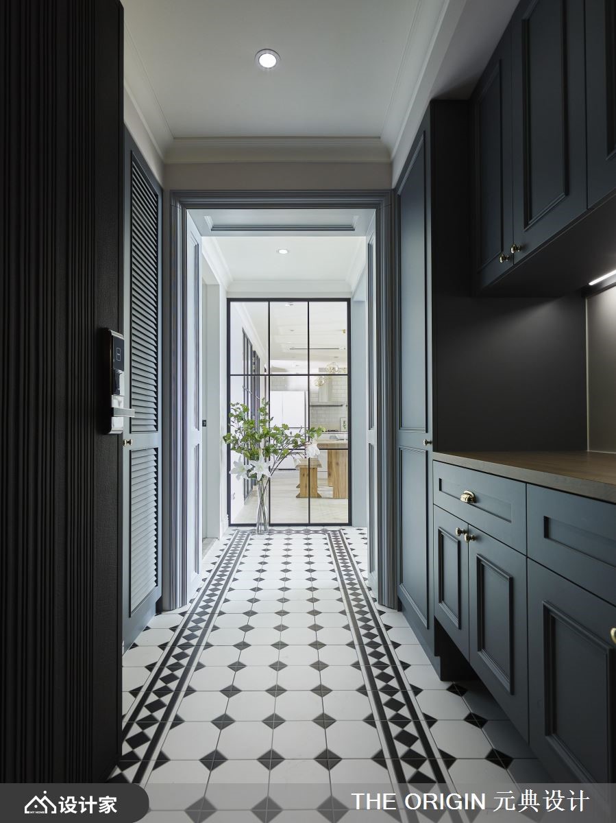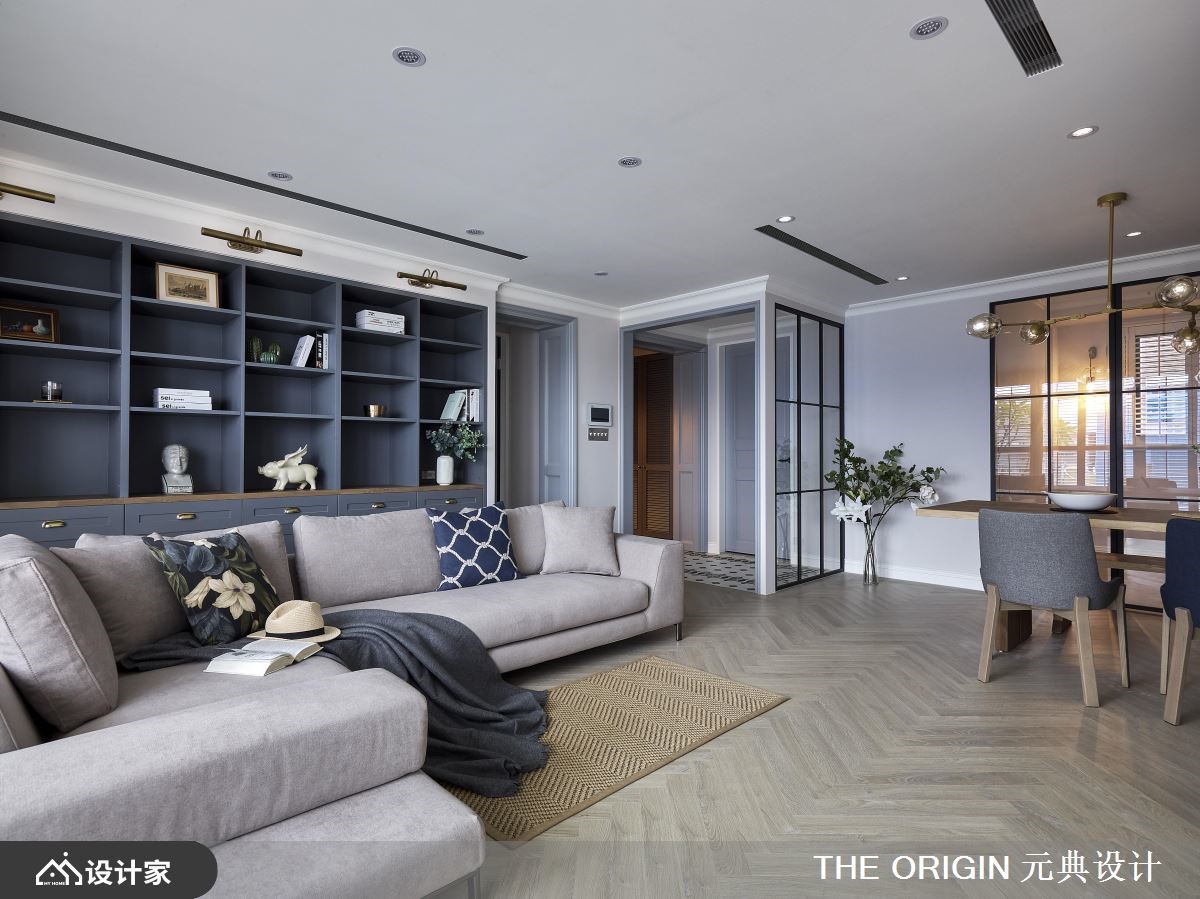 122平米的美式风住宅,藉由不同色阶的蓝、不同建材的白,加上金色元素的点缀,让整个空间弥漫优雅的生活质感,一家四口可以在实木百叶窗渗透的光线中,达到和谐的互动关系。【黑白瓷砖,开启美式风原点】玄关采取黑白几何砖铺陈典雅地坪,两侧附有金色把手的蓝色收纳柜,引导视线、动线通向室内,而黑框玻璃屏风透着后方的餐厅摆设,令人一进门就开始期待细致的家居风貌。公领域采取开放式规划,让一家人可以尽情穿梭其中;人字形木地板贯穿整个空间,使家居在明亮氛围中带有温暖感受。客厅沙发背墙选择普鲁士蓝的展示柜,搭配灰色L型沙发,为空间营造沉稳舒适的气氛。餐厅摆放灰、蓝餐椅及实木桌,配合一盏金色吊灯,塑造温馨高雅的用餐环境。厨房墙面妆点英式地铁砖,并设置嵌入式电器柜、酒柜,以及能够摆放杯盘的层板,打造清丽素雅的机能区域。小编的最爱主卧延续公共空间的蓝白色系,装饰线板的衣柜赋予简练的收纳功能,而双人洗面盆的卫浴设计,以白色磁砖、大理石纹与金边镜面,创造宛如电影场景般的优雅样貌。更衣间透过大大小小的收纳空间,整齐归类衣物配件,赋予女主人机能十足的私密领域。