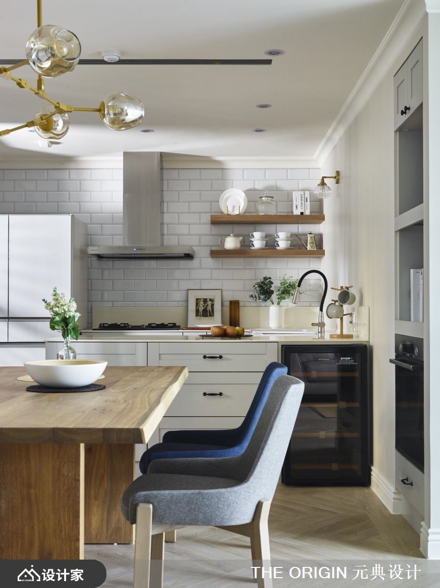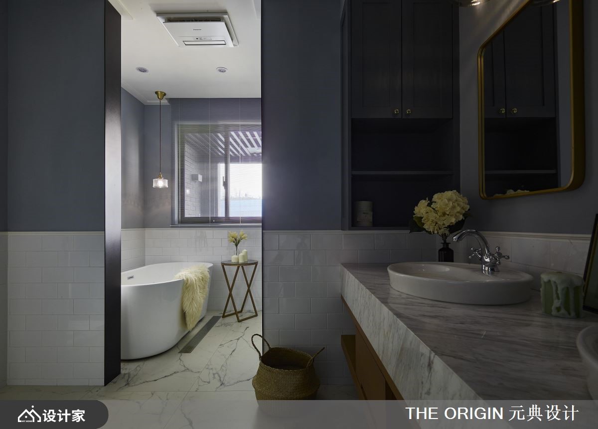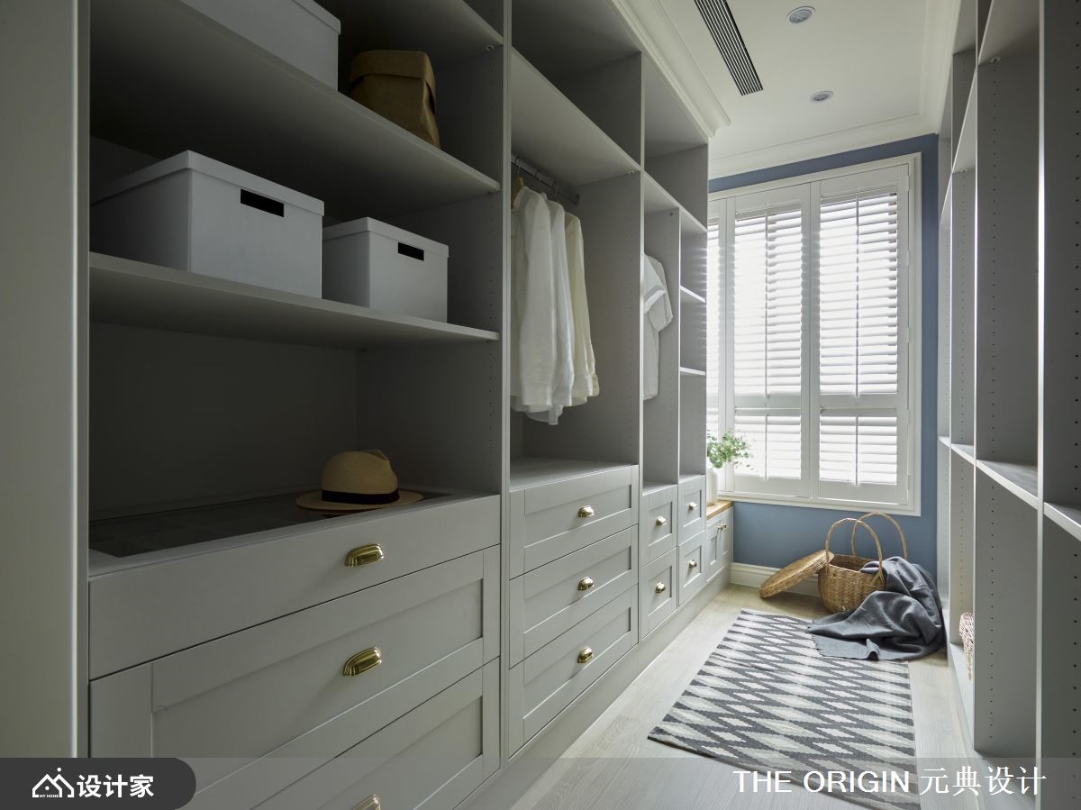 122平米的美式风住宅,藉由不同色阶的蓝、不同建材的白,加上金色元素的点缀,让整个空间弥漫优雅的生活质感,一家四口可以在实木百叶窗渗透的光线中,达到和谐的互动关系。【黑白瓷砖,开启美式风原点】玄关采取黑白几何砖铺陈典雅地坪,两侧附有金色把手的蓝色收纳柜,引导视线、动线通向室内,而黑框玻璃屏风透着后方的餐厅摆设,令人一进门就开始期待细致的家居风貌。公领域采取开放式规划,让一家人可以尽情穿梭其中;人字形木地板贯穿整个空间,使家居在明亮氛围中带有温暖感受。客厅沙发背墙选择普鲁士蓝的展示柜,搭配灰色L型沙发,为空间营造沉稳舒适的气氛。餐厅摆放灰、蓝餐椅及实木桌,配合一盏金色吊灯,塑造温馨高雅的用餐环境。厨房墙面妆点英式地铁砖,并设置嵌入式电器柜、酒柜,以及能够摆放杯盘的层板,打造清丽素雅的机能区域。小编的最爱主卧延续公共空间的蓝白色系,装饰线板的衣柜赋予简练的收纳功能,而双人洗面盆的卫浴设计,以白色磁砖、大理石纹与金边镜面,创造宛如电影场景般的优雅样貌。更衣间透过大大小小的收纳空间,整齐归类衣物配件,赋予女主人机能十足的私密领域。