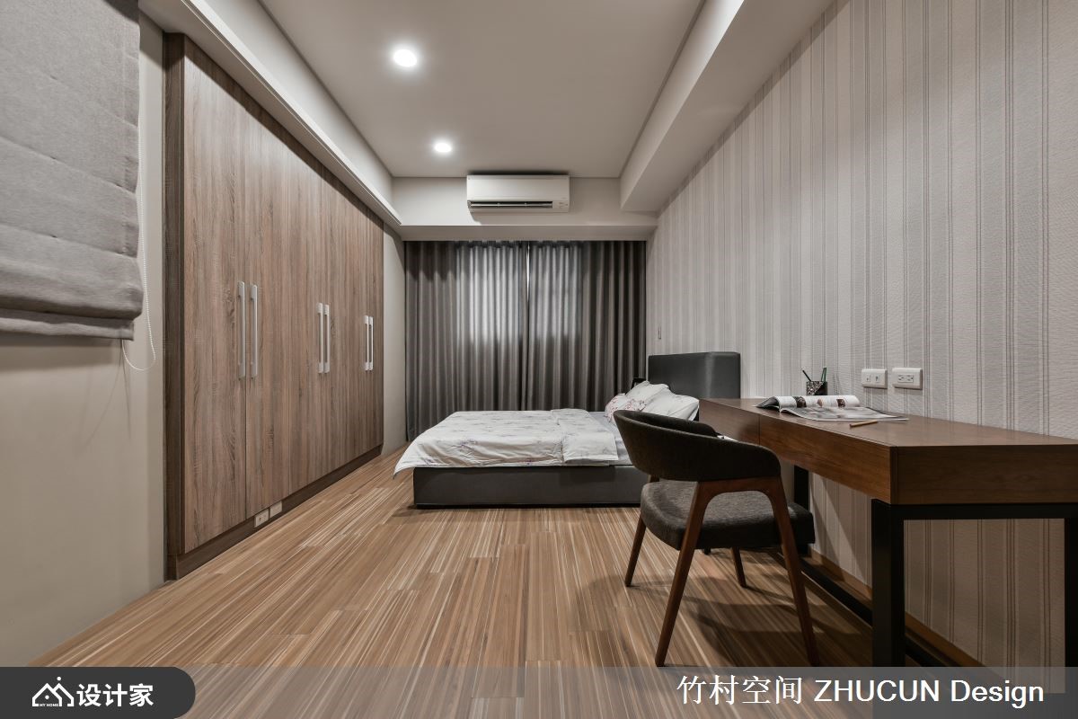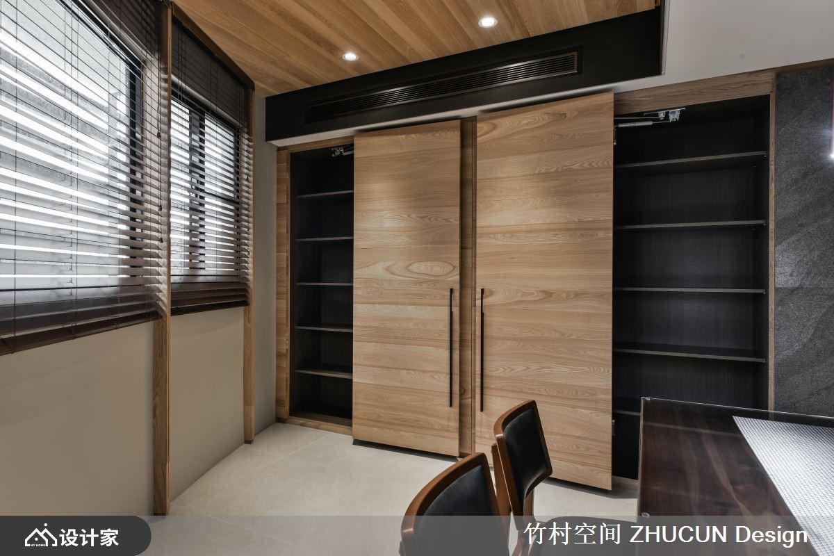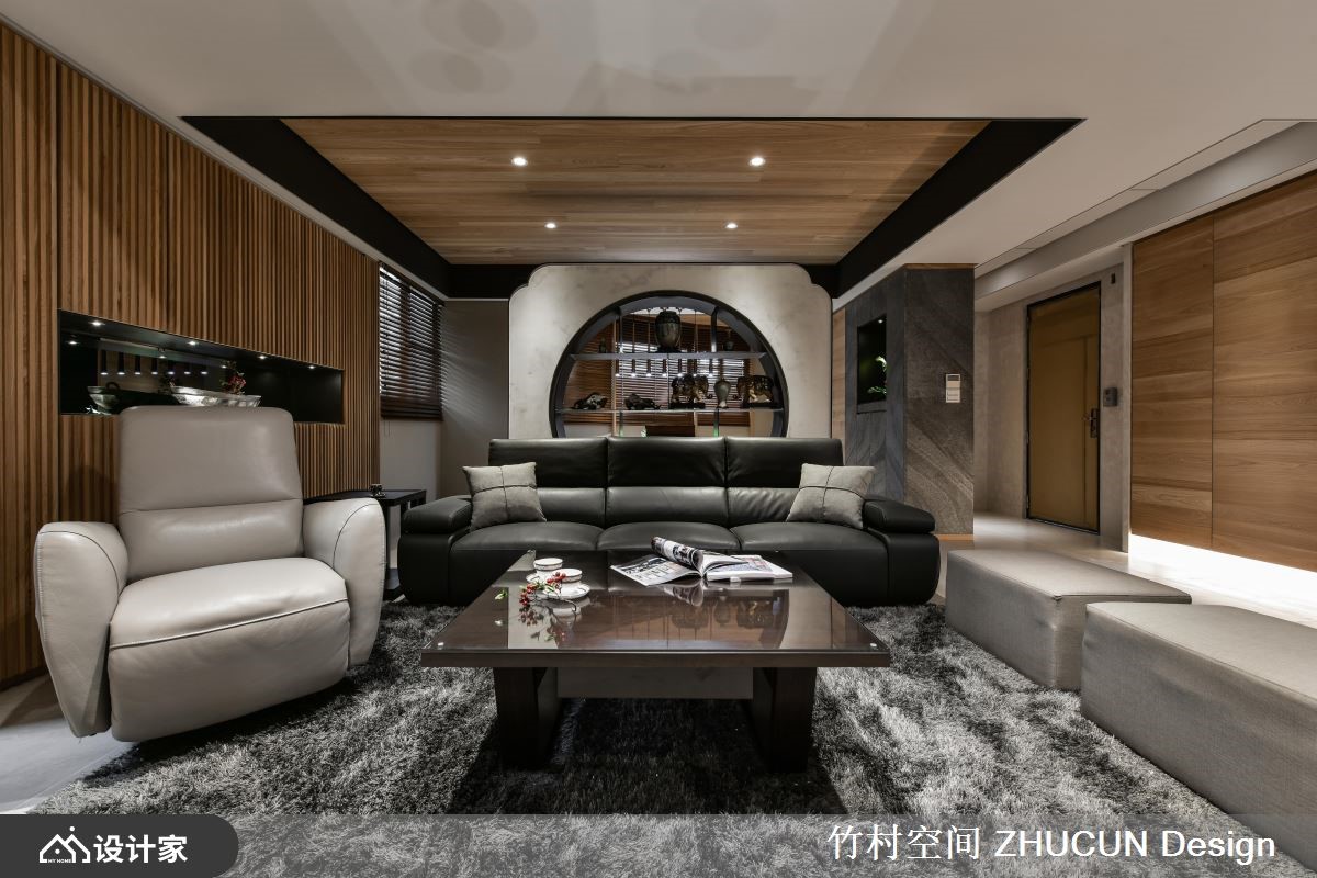 248平米新中式风大宅,位于独栋楼的顶层,里头住着一对退休的教师夫妇及一位孙子,业主爱好简单生活,又喜欢与亲友举办读书会,因此设计师依照需求,打造出既宽敞又具机能的生活环境。【圆拱隔屏,打造格局弱界定】由于居住者期待公领域保持开阔,但又不希望过于空荡,所以空间的界定成为设计重点,像是在客厅与开放式书房之间,就透过圆拱状的中式隔屏,塑造格局的弱界定,提升了家居的东方雅致;餐厨空间则是利用大型金属格栅推拉门,形成一定的阻隔,又兼具穿透性,巧妙强化格局的界线。另外,设计师藉由黑色铁艺饰梁的手法,让天花板看来更为挑高,加上木纹质感的天花板修饰,使得空间既沉稳又别致。主卧将大面积的收纳柜,规划于墙面之中,维持视觉辽阔感的同时,又能具有充沛的机能。儿童房在窗边设置展示矮柜,能够摆放孩子的童书与玩具,满足孩子成长时的收纳需求。小编的最爱开放式书房的收纳柜,为求线条利落及墙面平整,设计师以特殊五金打造巴士门,让动线不受到干扰,保留居住者想要的开阔感受。