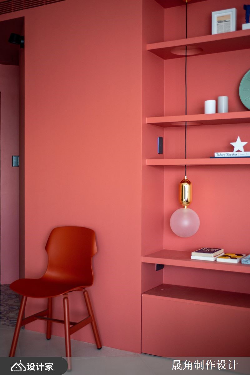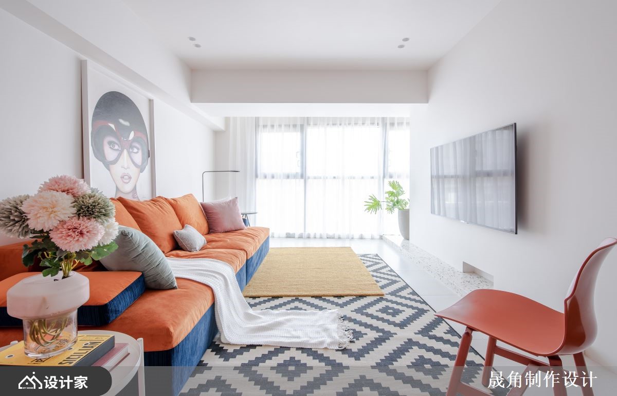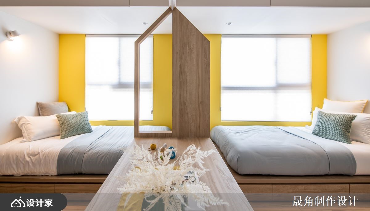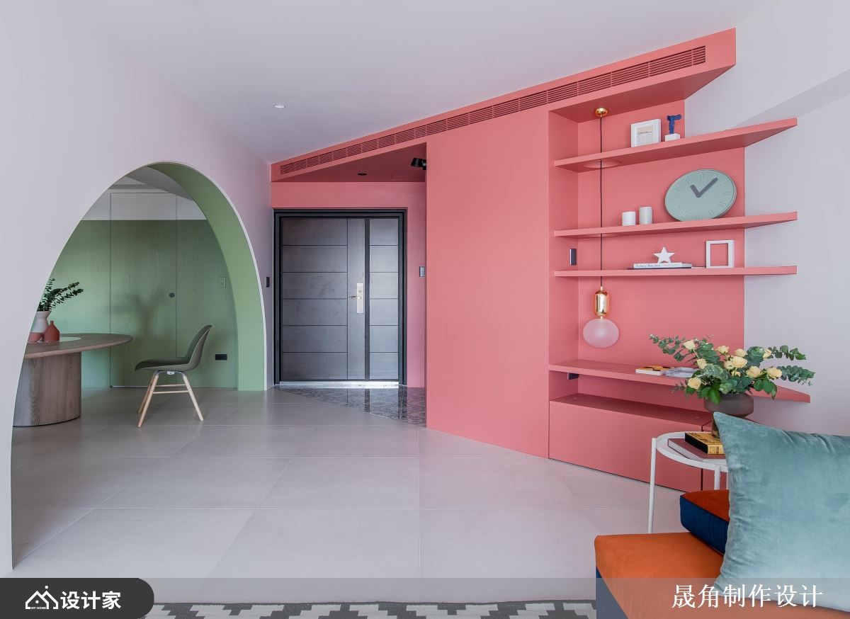 北欧风格有多百变?从这间165平方米大的家居色彩搭配就能瞬间了解!跳脱住宅对立面以及场域划分的常态设计,壁面不再只有规矩的垂直水平交集,圆弧拱门让空间过场变得充满惊喜,而缤纷的色彩把室内空间变成了主题乐园,大人小孩穿梭其内,体验一起居家生活的趣味。 【明亮色彩与创意格局, 打造有意思的家居】 推开住宅大门,一道莓果色壁面开启了破格设计的第一步,斜切壁面将视线引导到室内,大胆的橘蓝撞色沙发与白壁上的现代挂画承接活泼的意象,从正面看去又是一个独立的特色端景。客厅与餐厅间的过场不是借由地面材质转换或是单纯的开放式设计,而是利用圆弧造型与清爽的薄荷绿来界定空间机能;视线穿越弧形拱门像是从万花筒看去,每转一面都带来惊喜。两个孩子共用寝居空间借由特色木作设计把空间分成两边,结合收纳与书桌横越寝室打造出各自专属的天地却又能随时打成一片。夫妻休息的居室则是以墨绿为主色,加入壁花与亮黄撞色概念,诠释属于大人的艺术品味,将从事创意产业的夫妻生活融入家庭,与家人共享生活中独特的“艺意”。 小编的最爱 虽然仅两房的格局让孩子们必须共享一个居室,但用家的剪影打造出书桌以及收纳系统让一间空间拥有超越两倍的乐趣;向日葵黄让空间变得亮眼,门片上挖空的几何图形反应满满的童趣,破除空间带来的限制,和手足一同成长、享受一起生活的点滴。