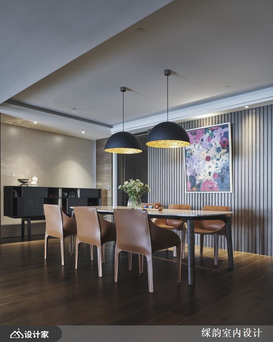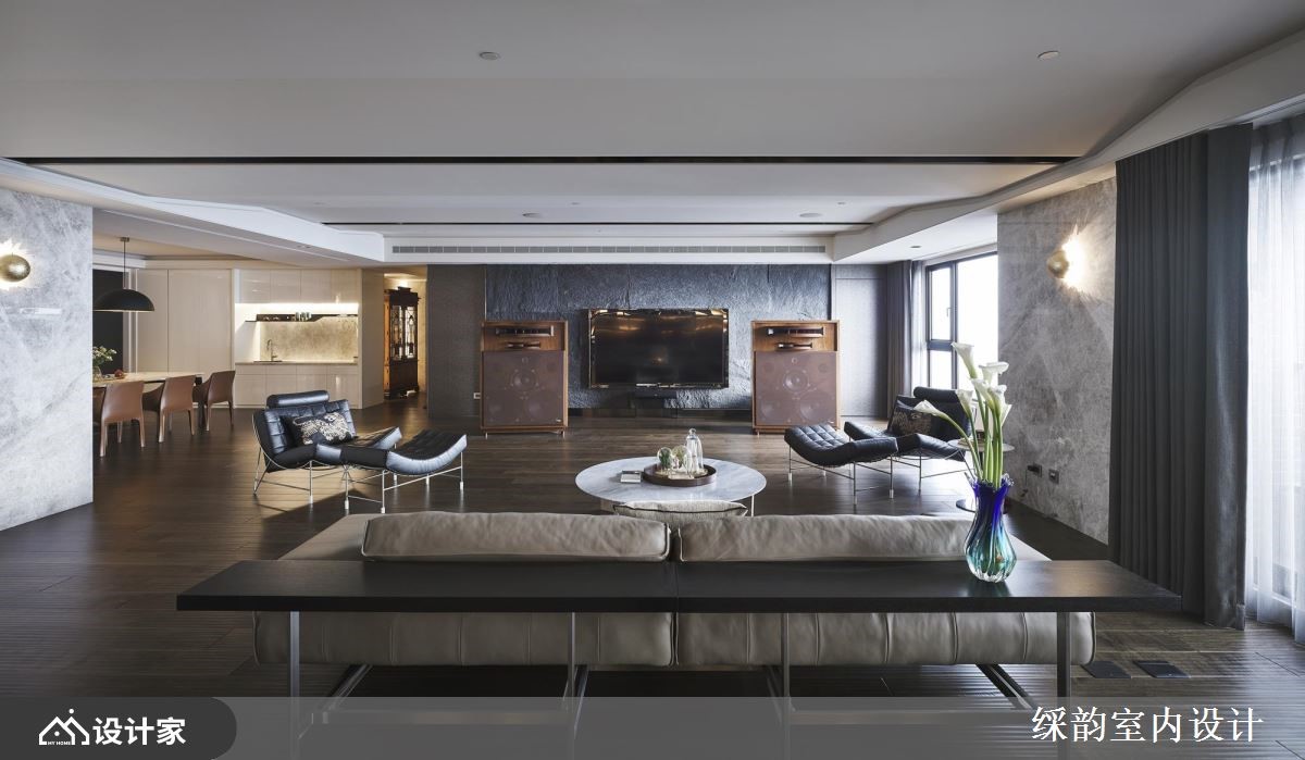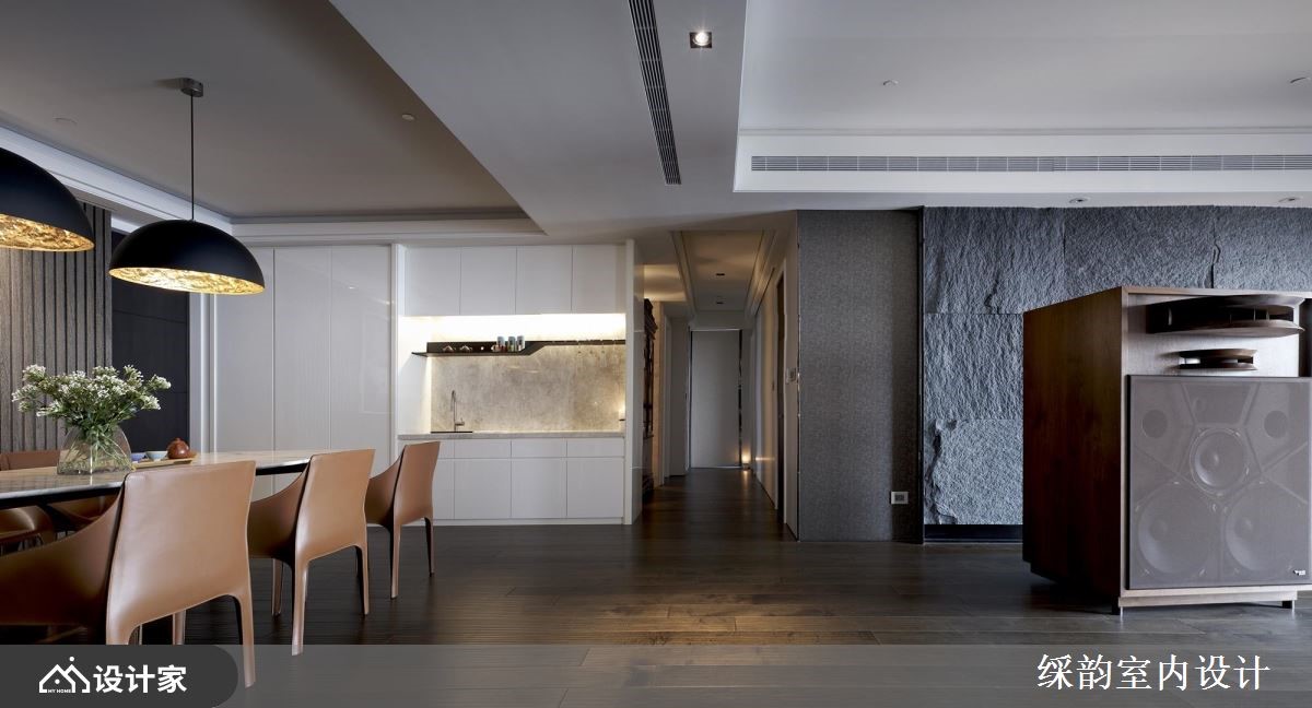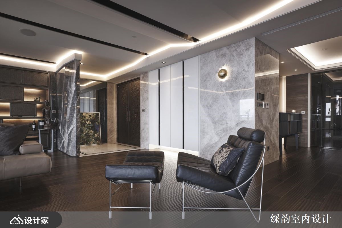 家,是每个人心里的归属,除了居住的空间,更能进化为熏陶艺文、调养身心或是疗愈作用的风格家屋。透过彩韵设计团队的操刀下,利用细腻的材质特色擘划,创造端景墙与艺术质韵,替整体空间注入崭新生命,让豪邸充满无限精采!【内敛色调营造, 蕴含人文艺术精神】入室后的玄关,以薄面大理石营造隔断机能,白色大理石为地坪,划分出内外领域。公领域里,透过深色木纹的饰底,随着开放的室内动线、间接光线的营造,呈现出沉稳、安定人心的基调;大面的粗犷石材打造电视墙体,光线投射在表面上,挹注朴实自然之感;沙发后方以风格展示呈现,细致的柜体设计融入开放与封闭层柜,开放层板伴随间接光源的投射,形塑精品时尚般的质感,替家屋空间增添人文艺术气质。餐厅空间里,安排温润的皮革座椅,与两盏造型大灯,伴随壁面的艺术画作,流露出动人的雅致气息;一旁还有屋主的钢琴,时而飘来的旋律乐章,让家充满艺术熏陶。小编的最爱居室里,藉由大地色调为基底,调和雅致的色彩与视觉纹理,营造出静谧、安定人心的休憩环境。