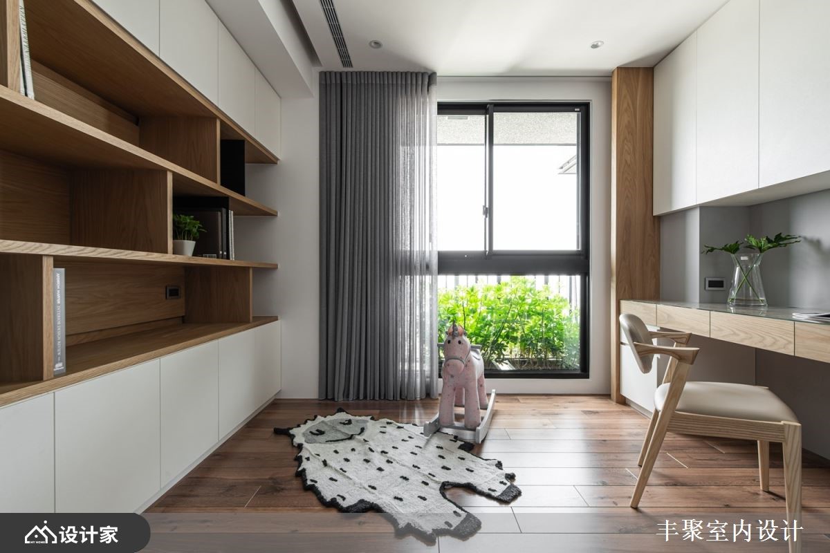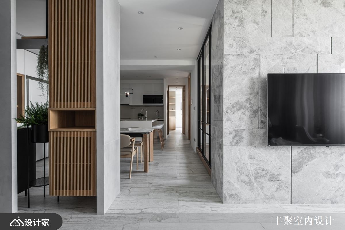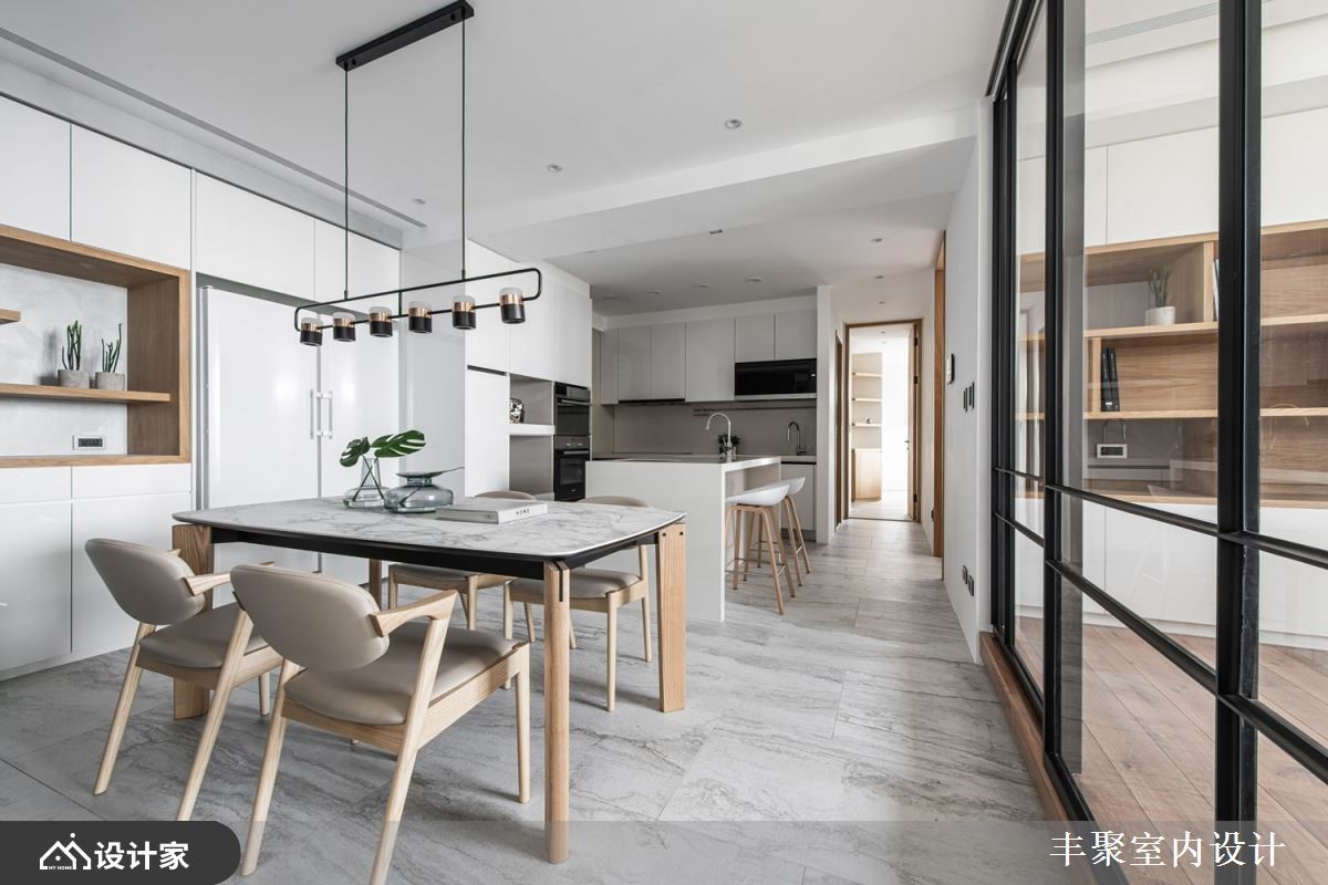 设计师考虑到家有幼孩,在现代风居家空间内擘划安全、好活动的动线机能,并维持厅区的开放性,让全家人可随时保有互动,打造出最适合屋主一家的空间景致,快跟着小编一起来看看吧!格局上,将原本的三房变为两房,把电视墙后方的房间改为书房,并瓦解侧边的实墙,运用铁件、玻璃打造穿透感拉门,不只使居家空间感放大,也让光线可引导至餐厅、延续到厨房,形成生活中的明亮感;同时在厨房增设中岛,划出回字型动线,就连玄关、餐厅之间也留有空隙,让每个区域都保有互动关系,而餐桌则采用订制家具,并增设实用电器柜、增添收纳机能;色彩规划上,以低彩度为基底,使用意大利进口特殊漆创造手作肌理,与电视主墙大理石的自然纹理相呼应,再援引窗外的日光,使用简洁利落的线条做勾勒,形塑出明亮通透的生活景况。小编的最爱 透过透明拉门的界定,让餐厅、书房二者可保有高互动,让大人可一边料理或用餐、一边照看到孩童在书房的活动情况!
