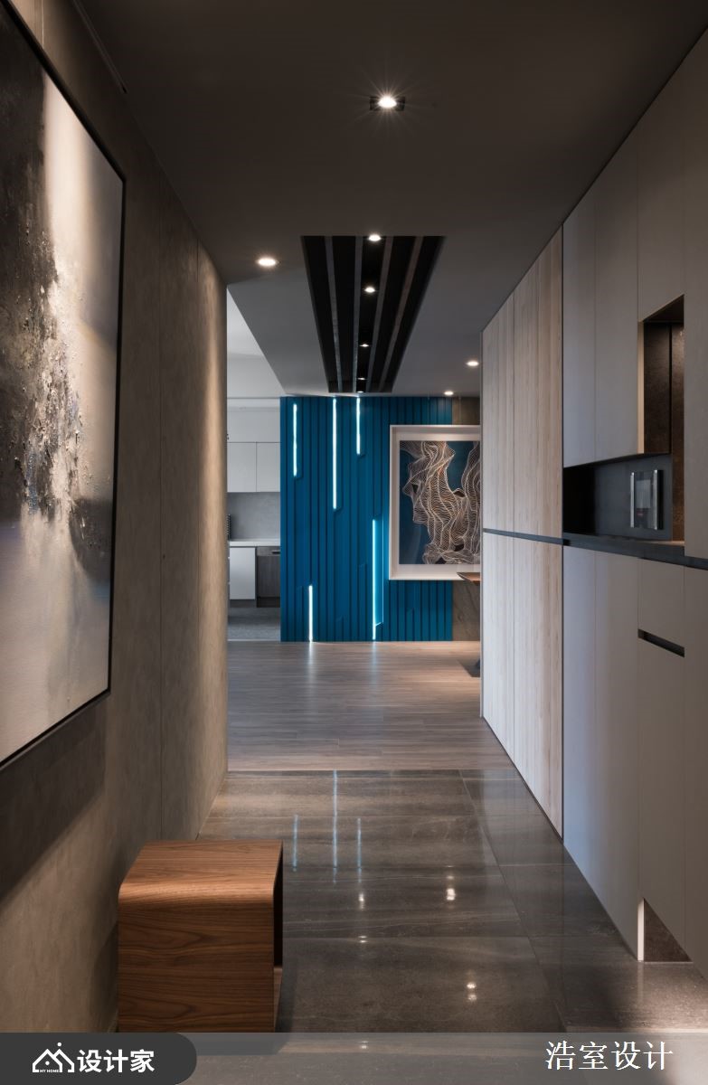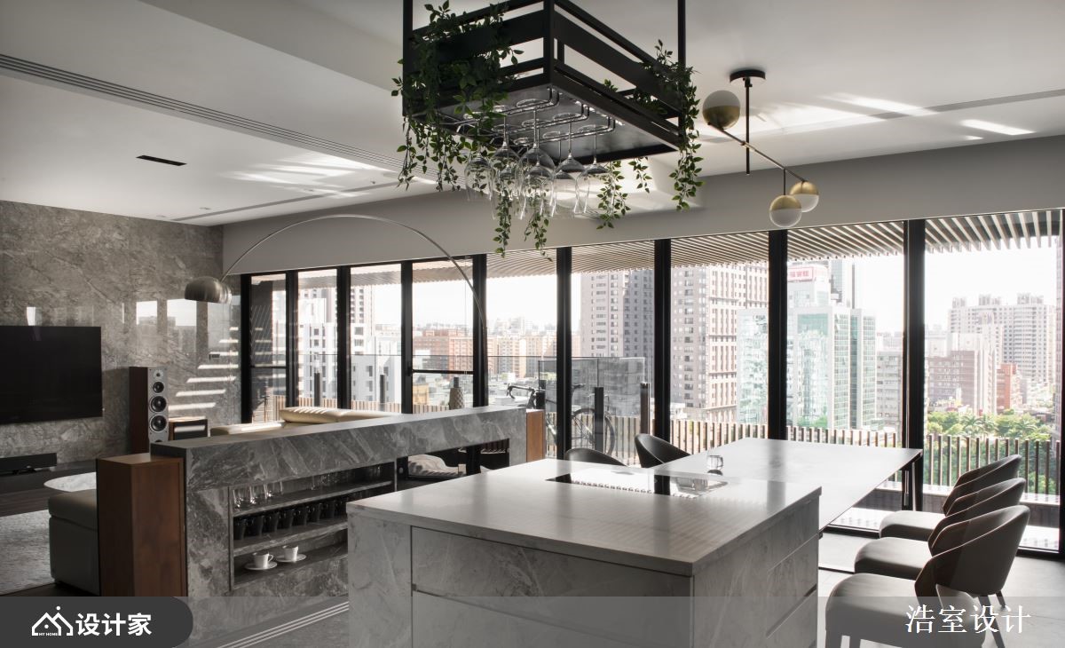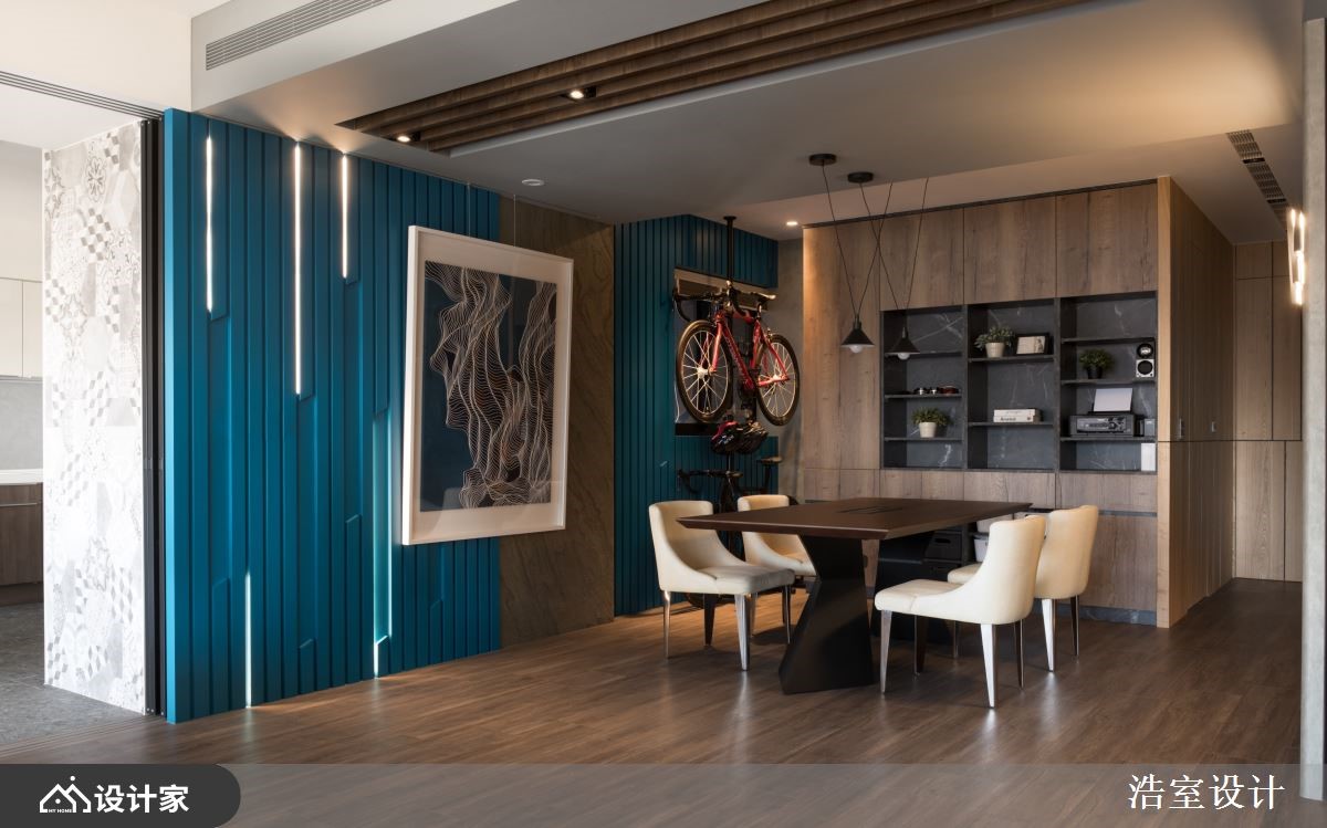百坪大宅里,透过利落的现代风格描绘,且将城市风景延揽入室,展现开阔器度;半开放大型厨房满足梦想中三五好友共聚的天堂,以及收纳细节的规划,收藏起一家五口的非凡品味与点滴回忆。入口玄关透过嵌灯照明,指引通往公领域的动线,间接光源洒落在艺术画作上,调和出静谧人文的迎宾风尚。客厅藉由大面窗景引入城市建筑之美,也导入充沛采光,随着视线的延伸与开放,让公领域更显开阔舒心之感;明亮光感映照在大理石电视墙上,一展恢弘气度;沙发后方以石材矮墙界定餐厅领域,与亲友享受假日时的派对时光,特别规划玻璃拉门,烹调时可关上门扇,保持公领域的空气清新,也保有领域独立性。餐厅区透过漆上蓝色的长条木纹堆栈出立面,伴随条状LED灯的局部点缀,创造光影美感;壁面中央结合大幅线条感的艺术画作,呼应整体造型且酝酿渐层视感;另一侧墙面,以铁件层架打造美学展示区,还特别搭起单车陈列架,让屋主兴趣与收藏的对象成为家的动人元素。小编的最爱厨房空间里,原木餐桌与中岛采L形摆设,满足更多人能共享料理与佳肴乐趣,也拉出流畅的日常动线,餐桌更可随需求弹性调整位子。